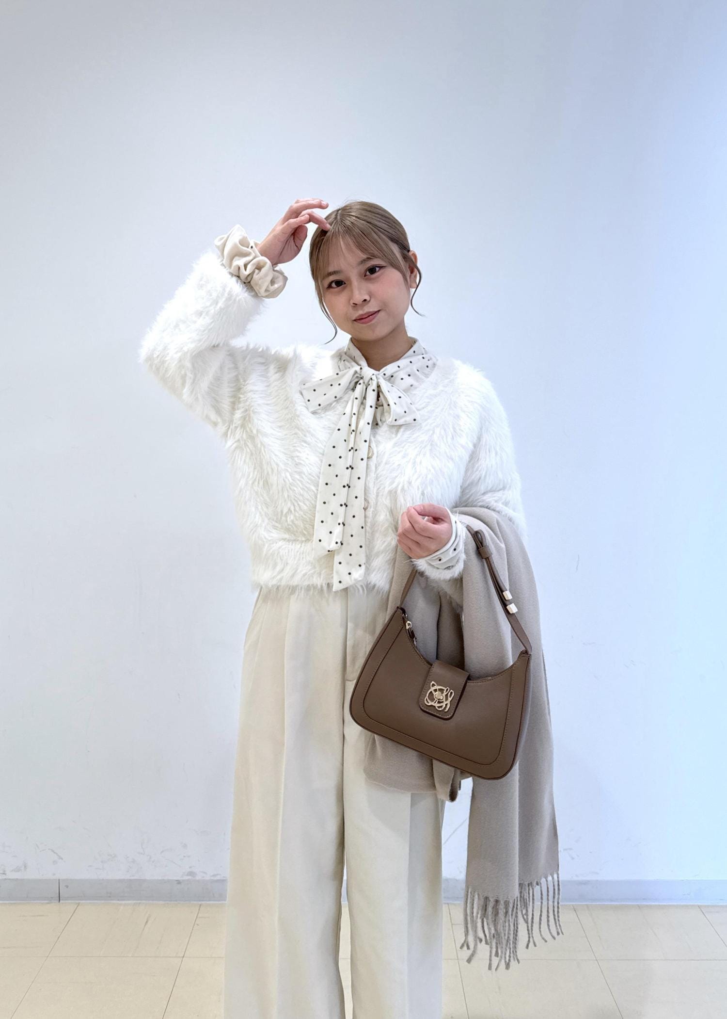 インナーで着てるドットのボウタイトップスのドット柄がブラウンカラーなので小物をブラウンで合わせ統一感ある淡いコーディネートになるよう意識しました!