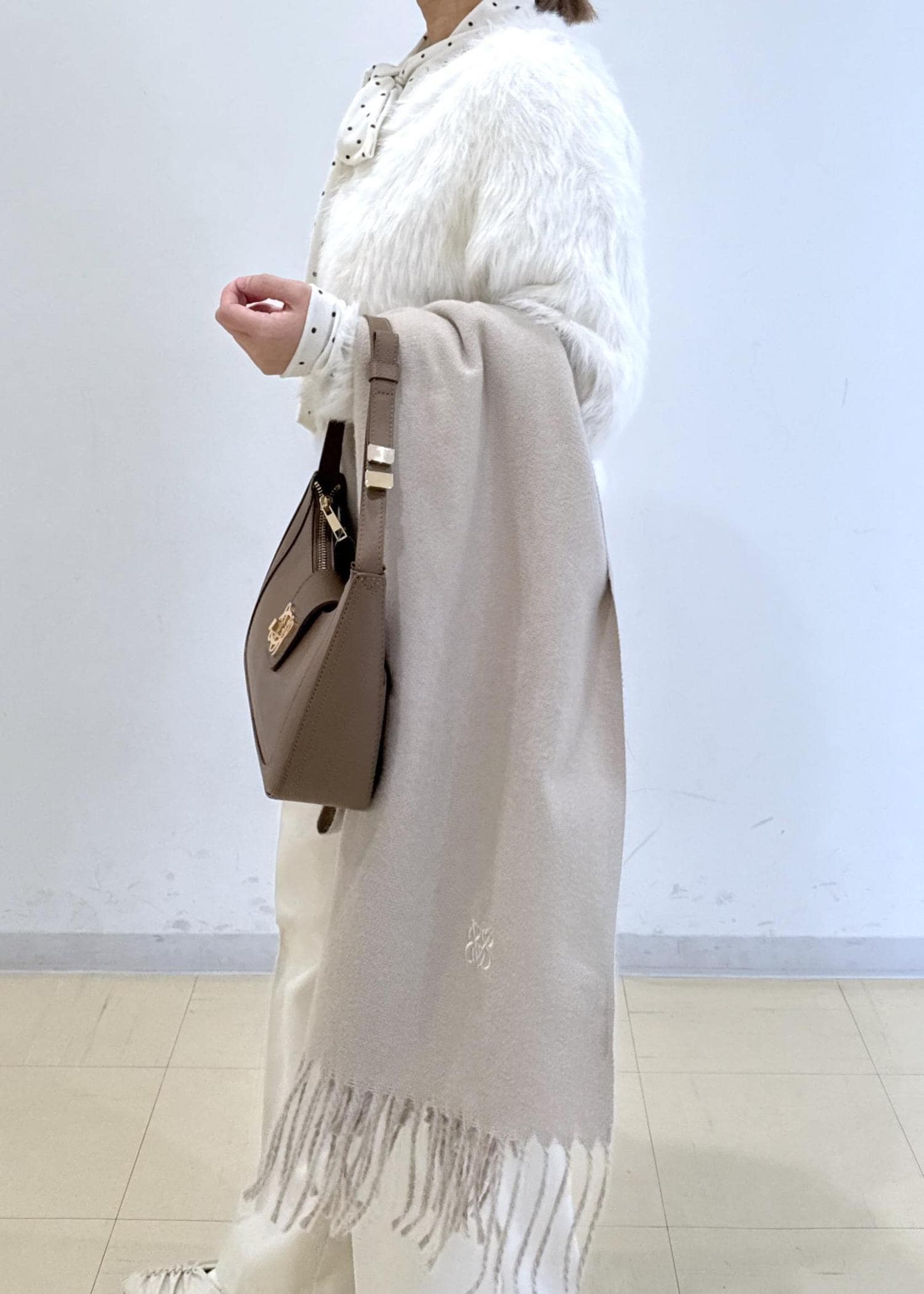VISなめらかタッチ刺繍入りストールベージュ / F¥3,289レビュー程よいボリューム感のマフラーなので骨格ストレートの私でも首周りのボリューム感を気にせずつけられます◎