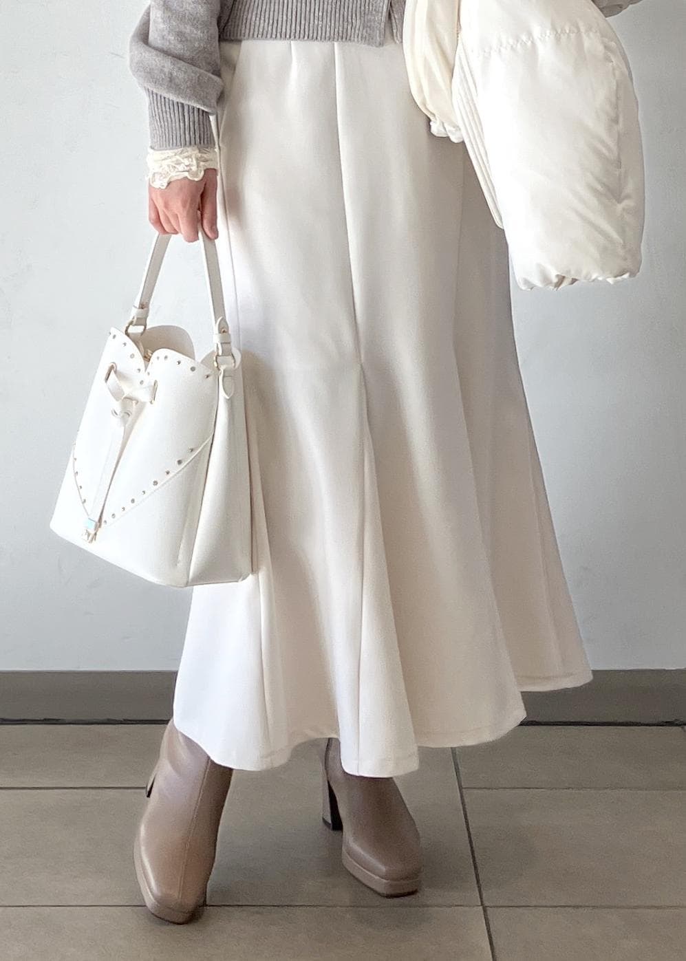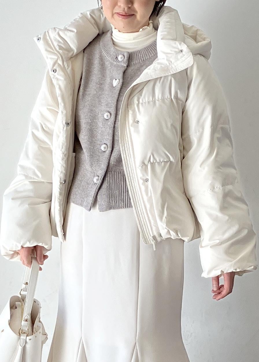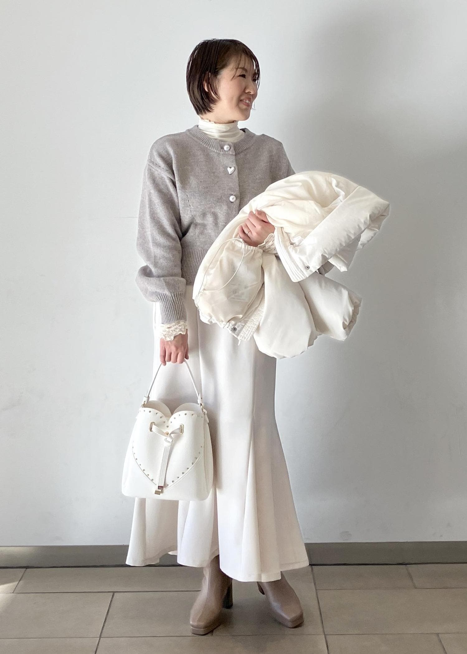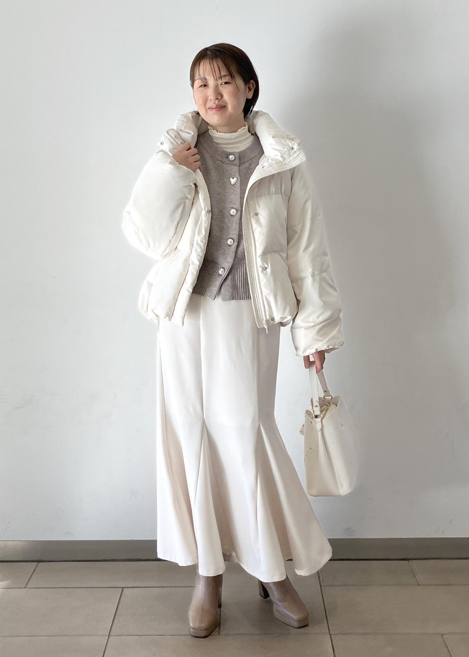 寒さが増して本格的な冬アウターの出番になりました!普段は無難に汚れも目立たない黒など落ち着いた色味を選びがちですが、あえて白を合わせてみました!そしてスカートも白で思いきって攻めてみました!!カーディガンのパール釦がアクセサリー感覚でポイントになり取り入れました!