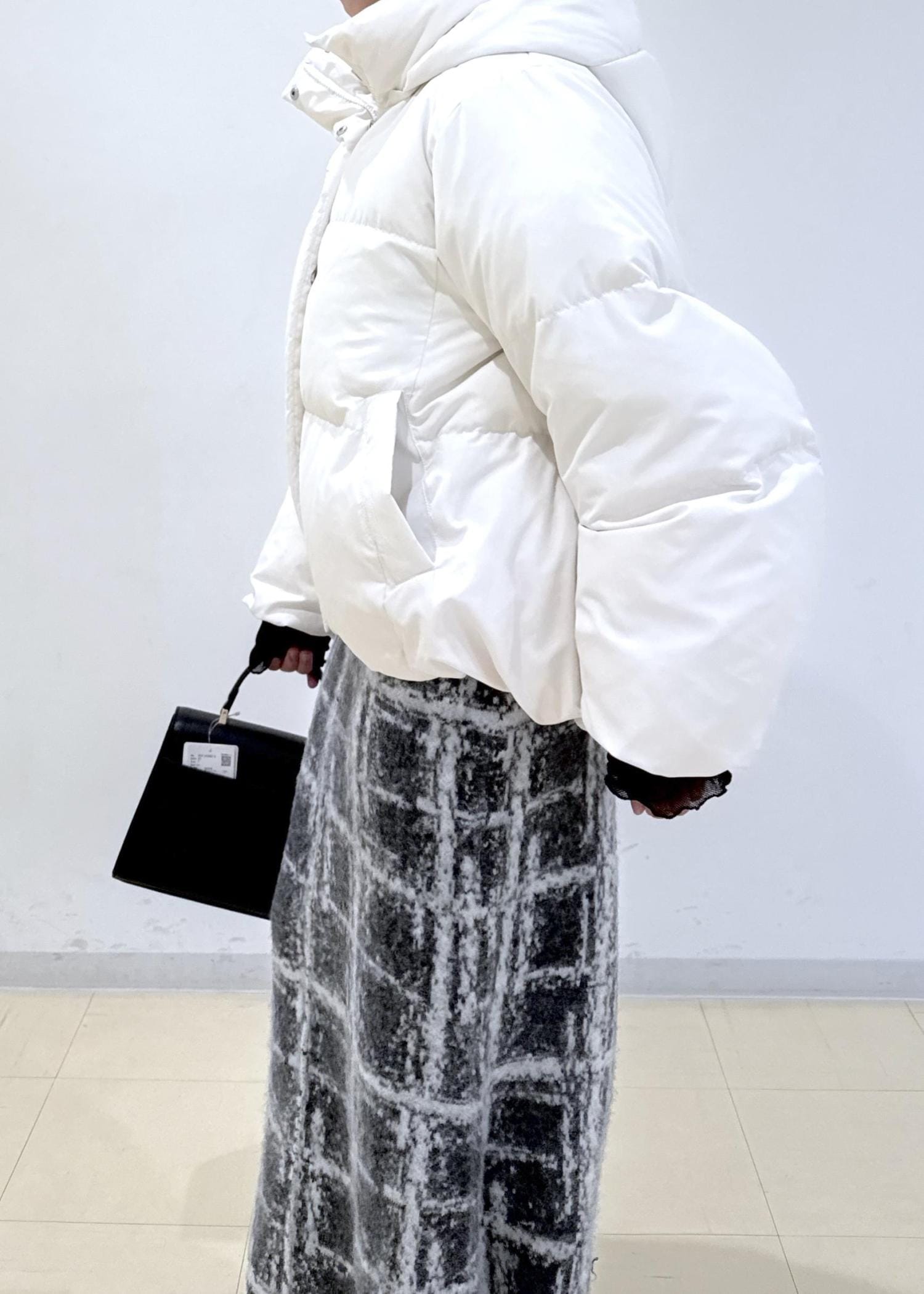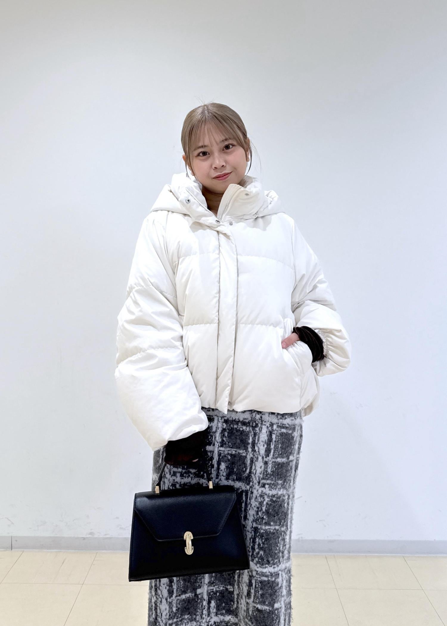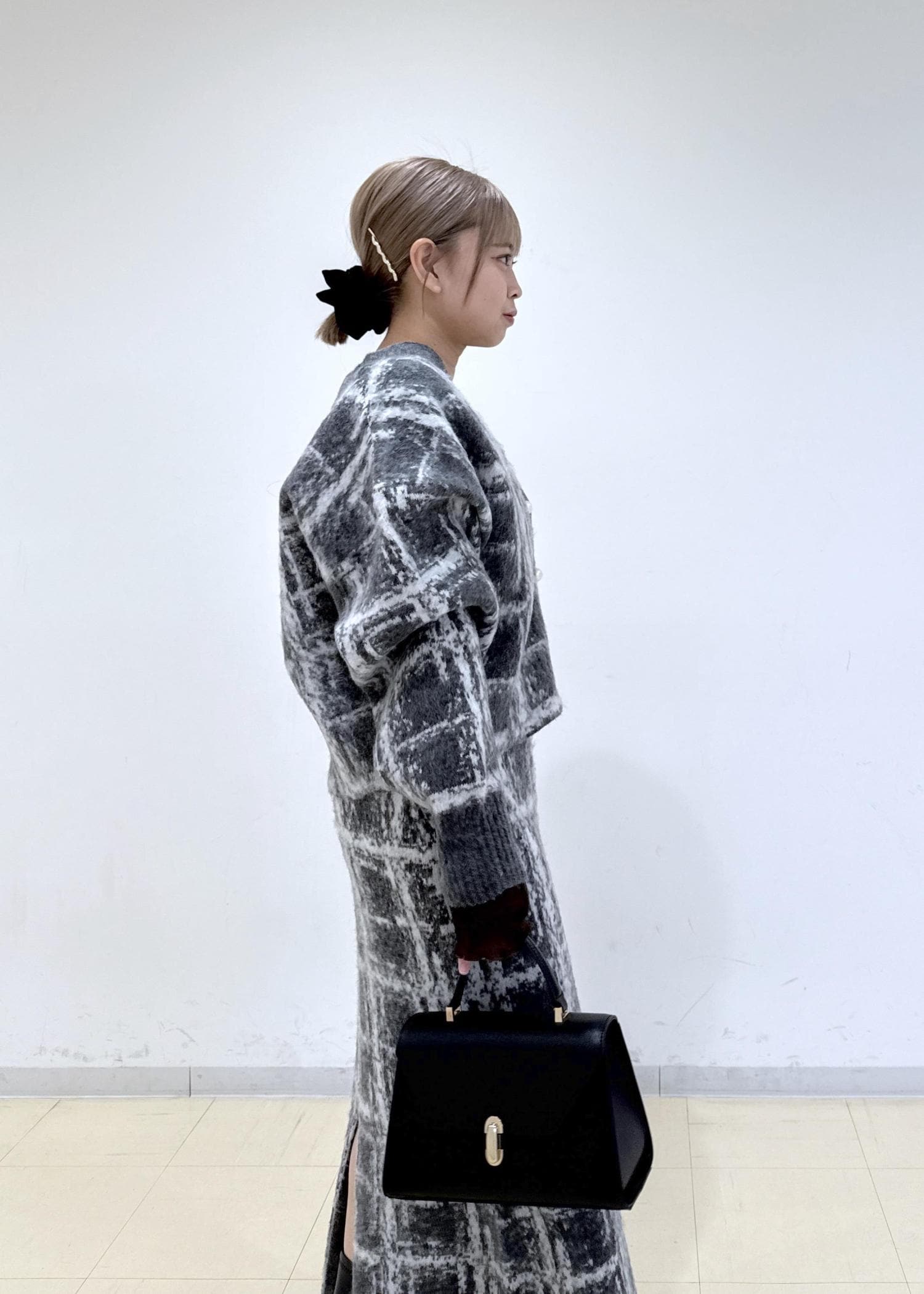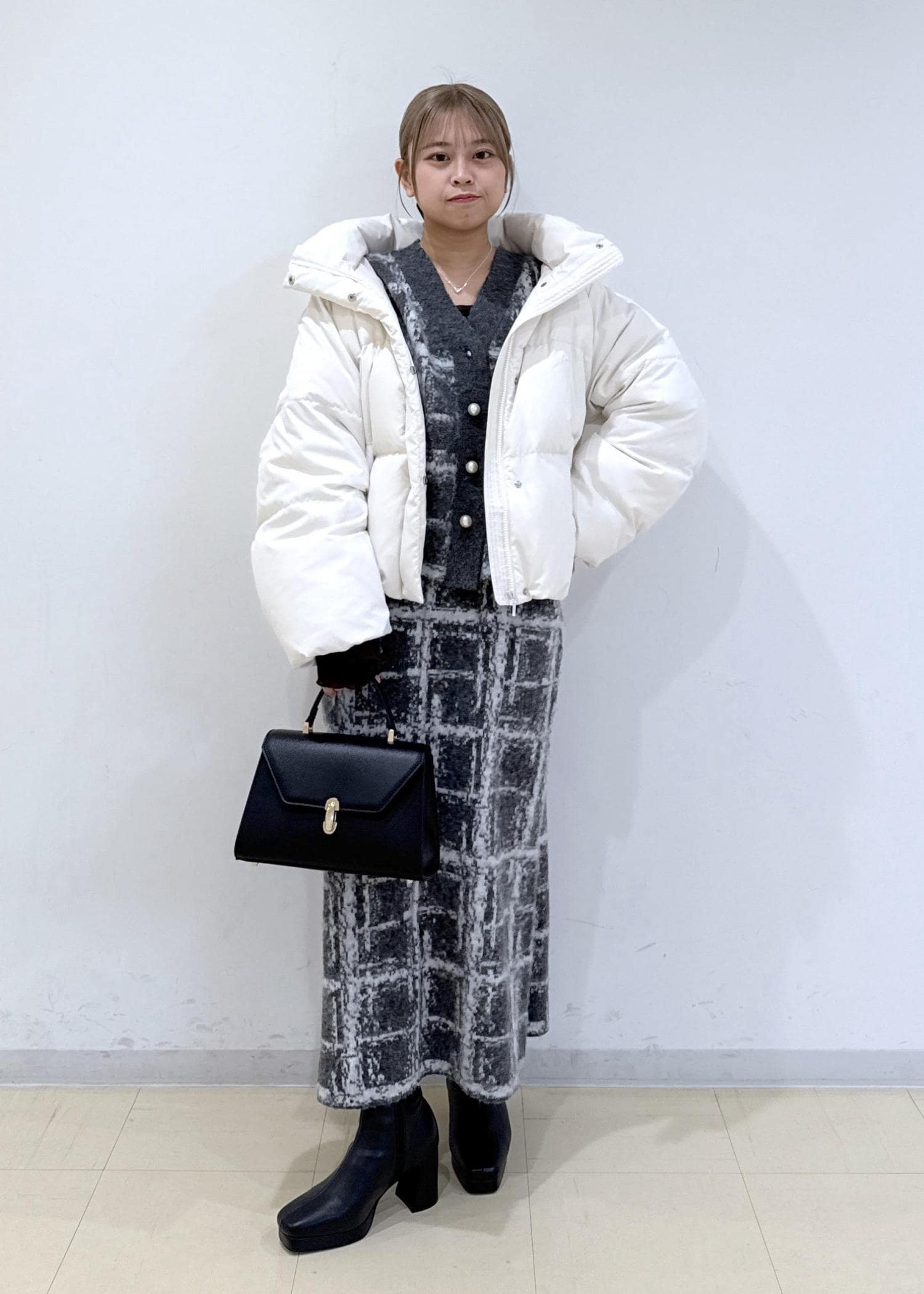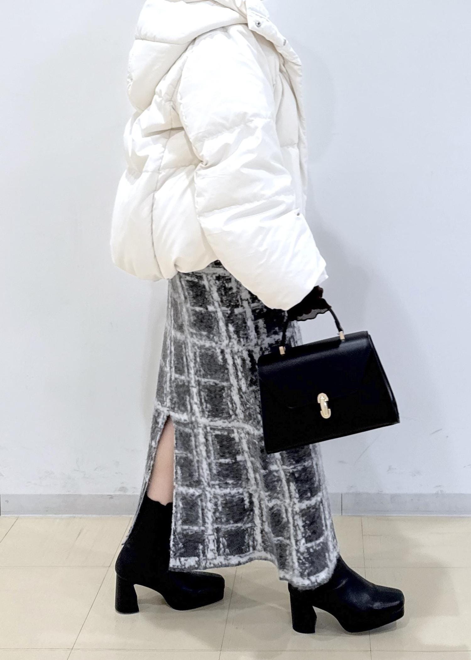 セットアップがモノトーンなので小物を黒であわせ、スカートをかっこよく着られるように意識しました。