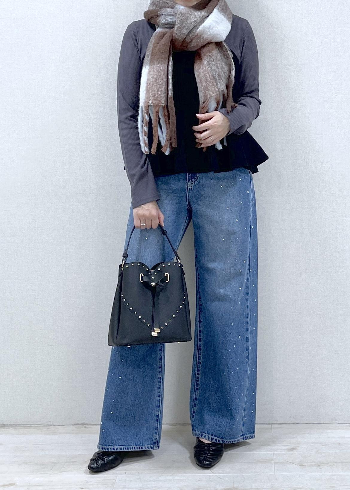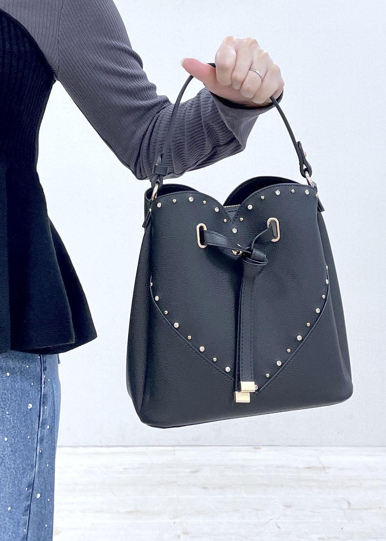 使い勝手や、サイズ感は、従来のハートカットバッグと同様ですが、スタッズとラインストーンが華やかさを増し、コーディネートを引き立てます。 -
