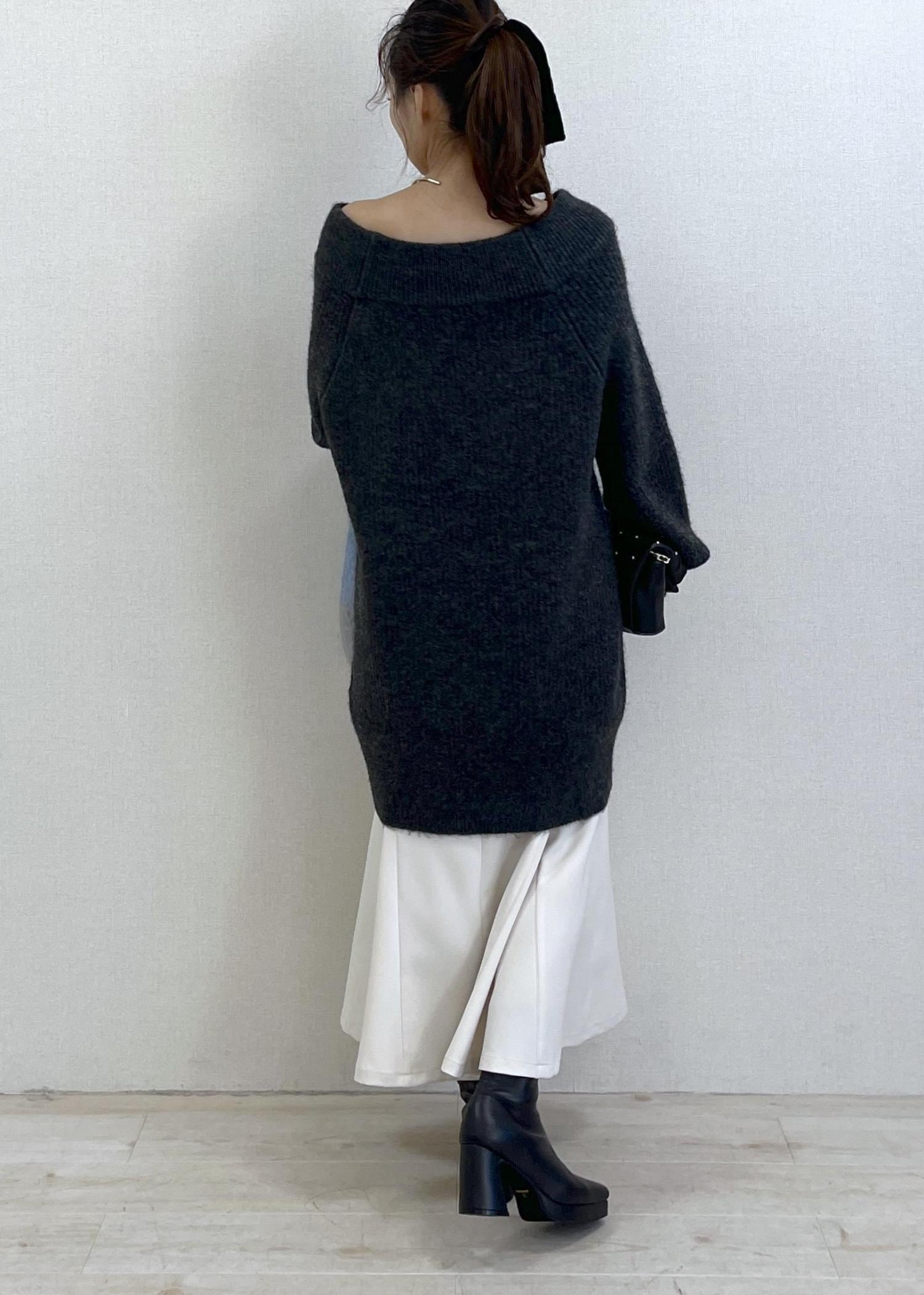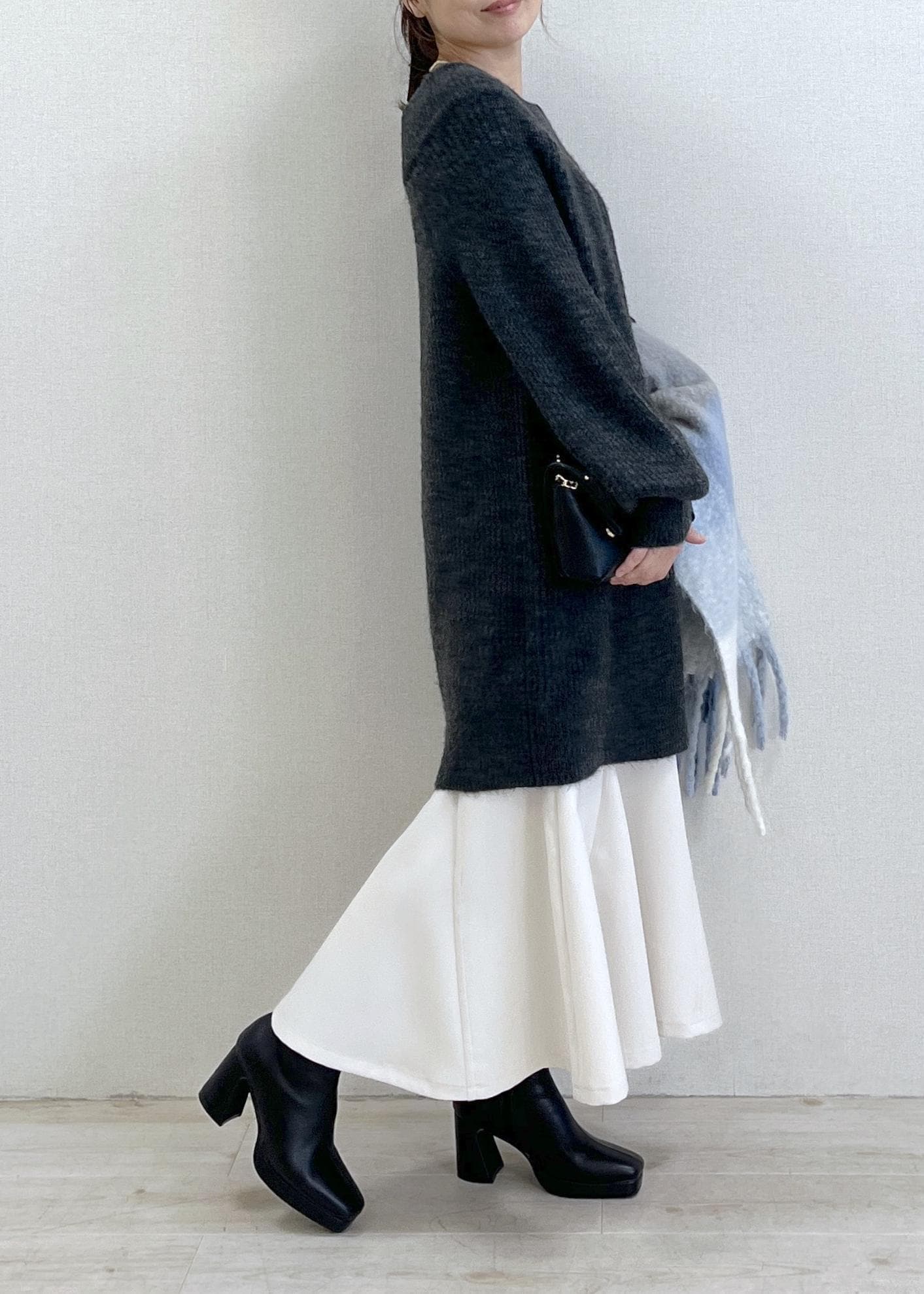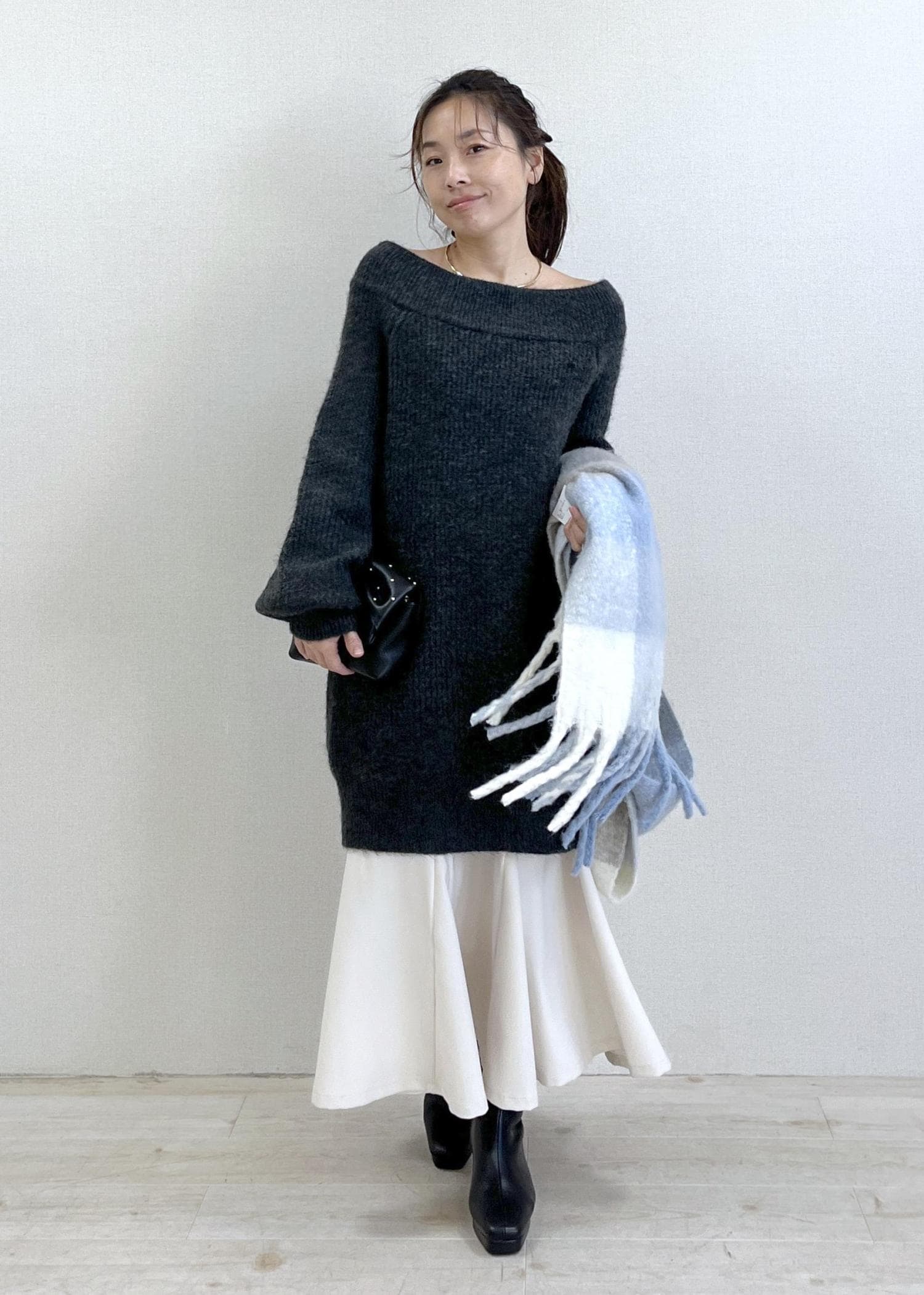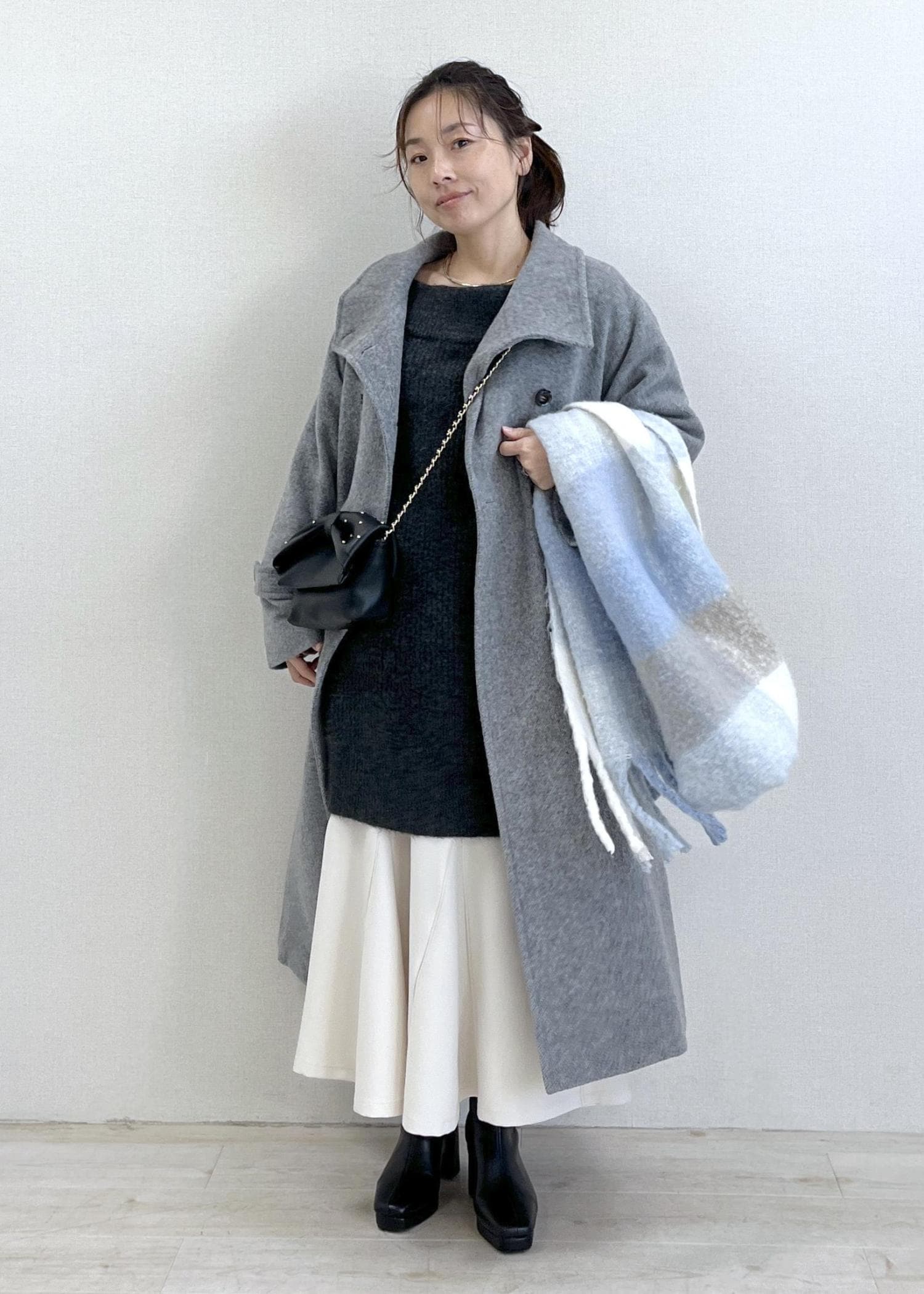 軽くて暖かいロングコートに、チャコールのニットワンピを重ね、下にホワイトのフレアスカートをのぞかせることで、重くならず抜け感のあるシルエットで柔らかトーンの冬スタイル。