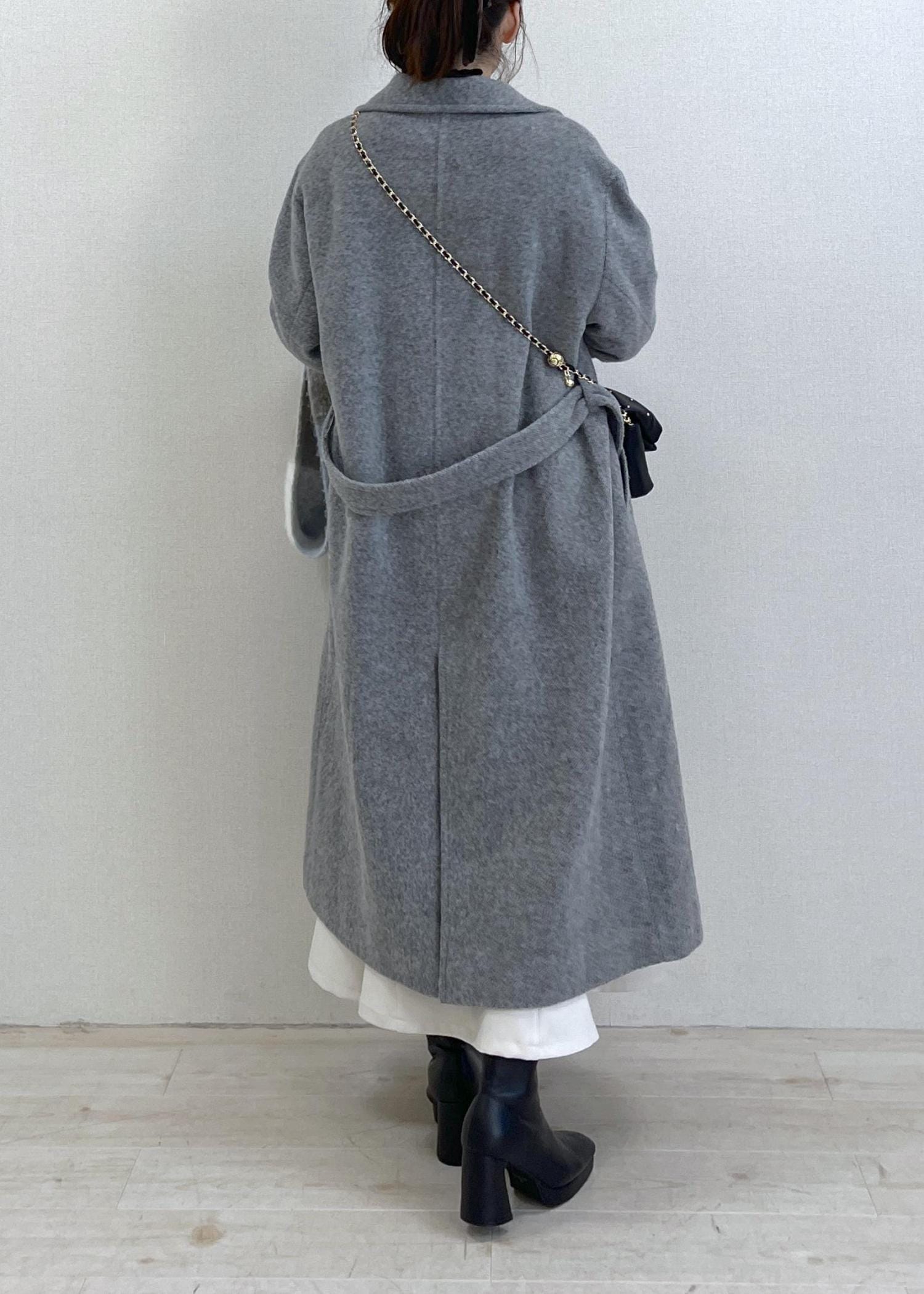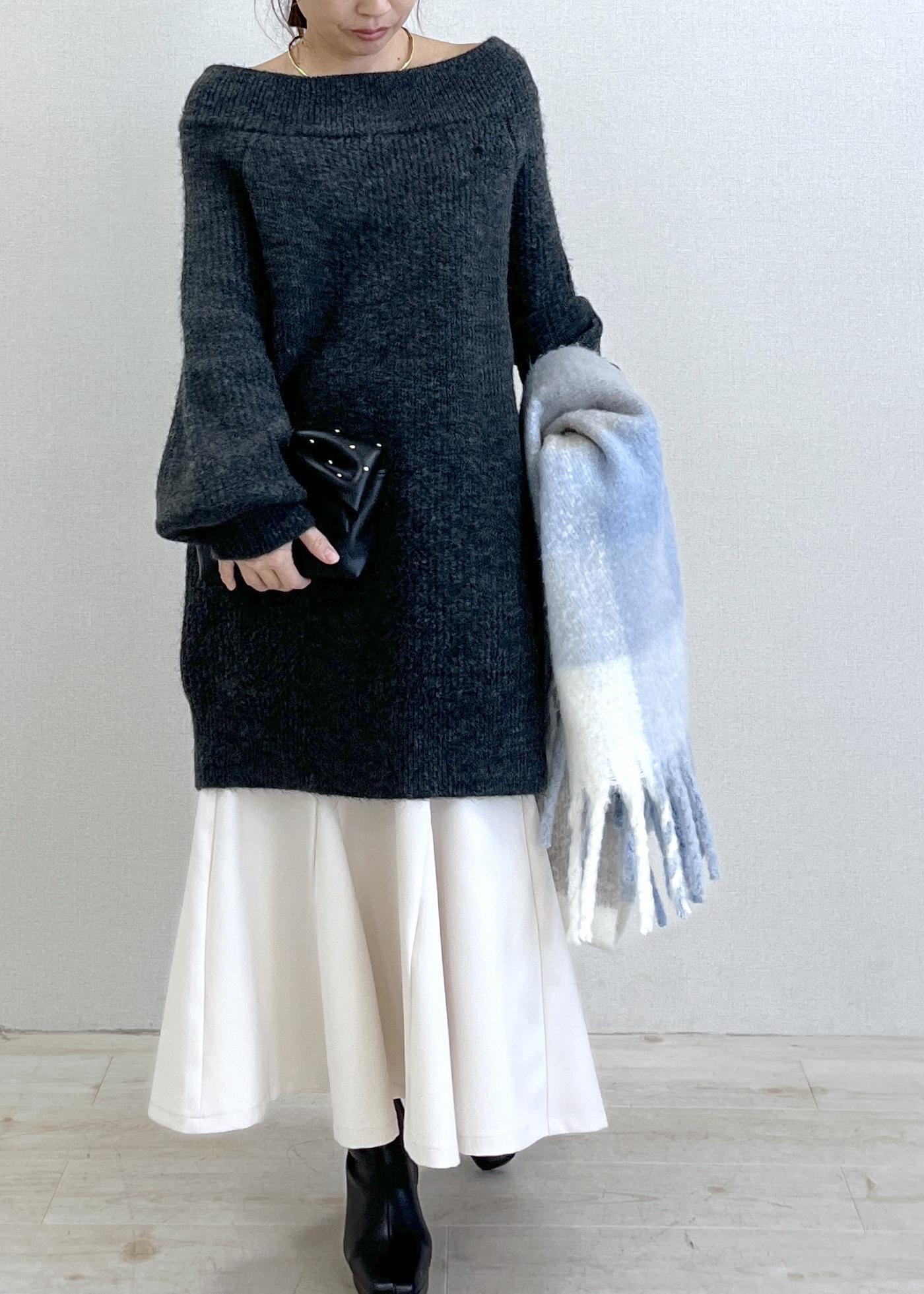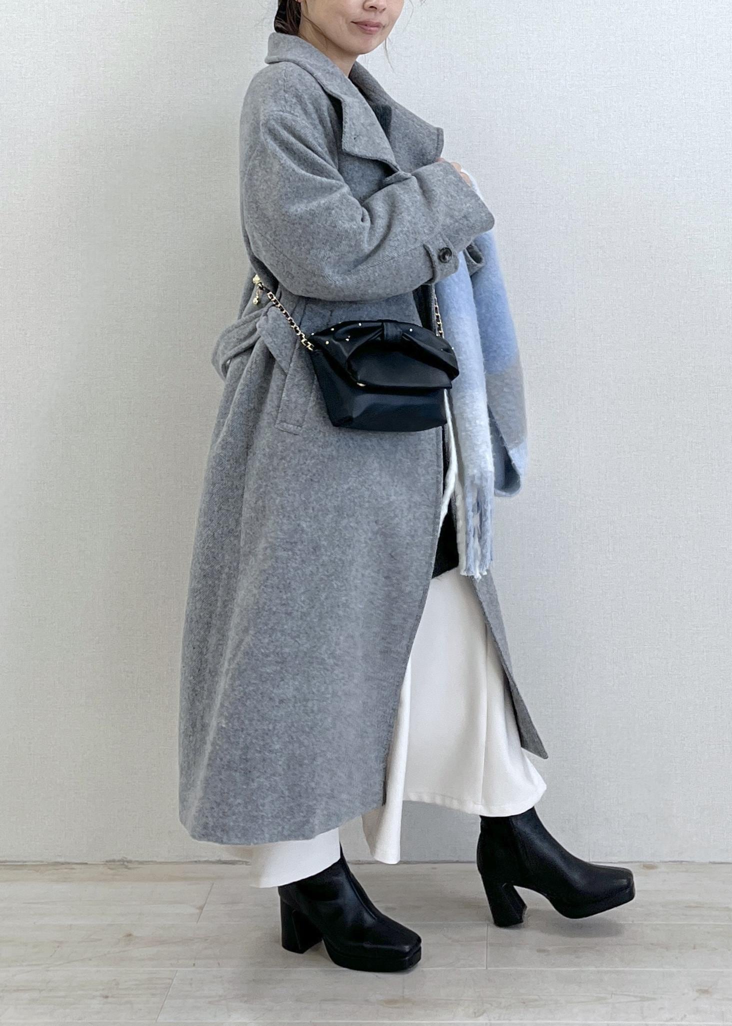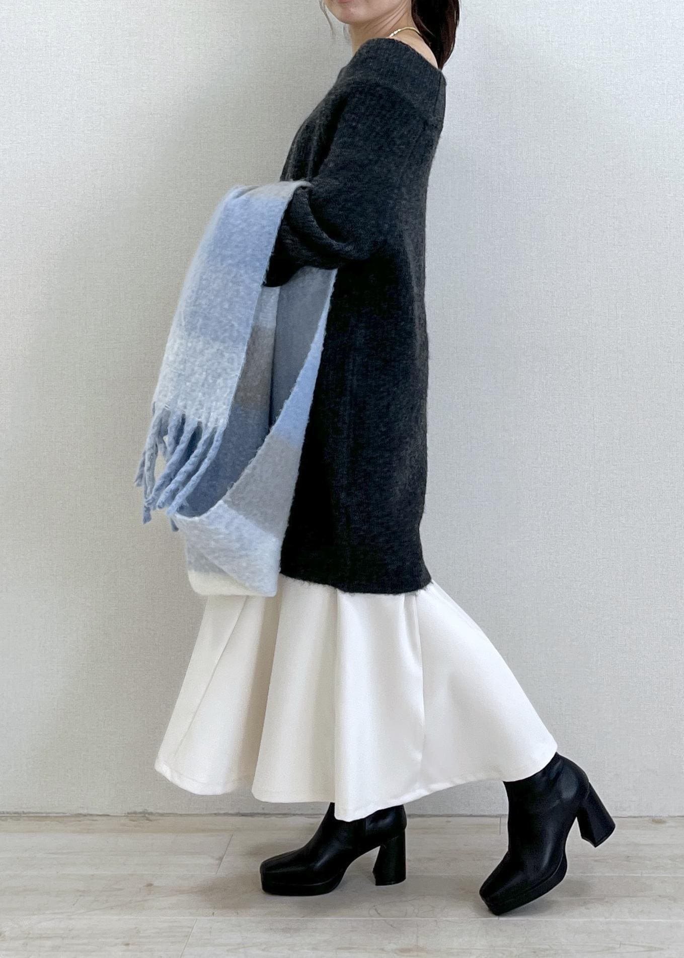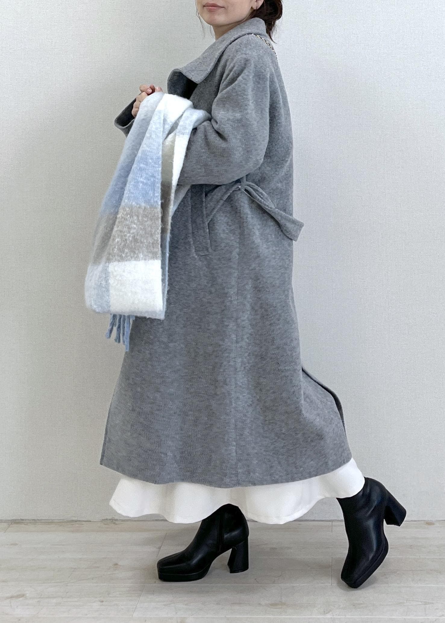 軽くて暖かいロングコートに、チャコールのニットワンピを重ね、下にホワイトのフレアスカートをのぞかせることで、重くならず抜け感のあるシルエットで柔らかトーンの冬スタイル。