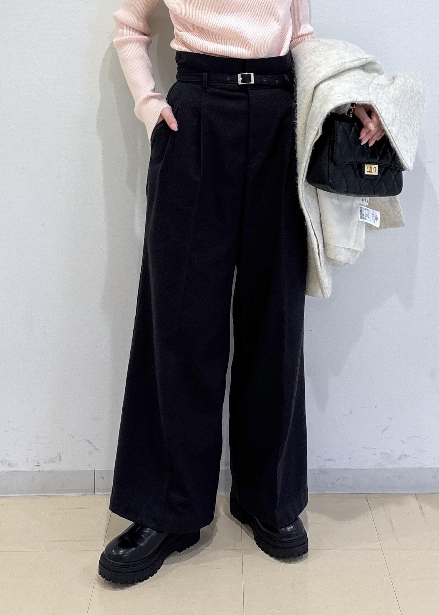 VIS起毛ウールライク版ベルトディテールタックワイドパンツスミクロ / M¥6,589レビュー163cmでMサイズ着用。ウエストも丈もちょうど良かったです。