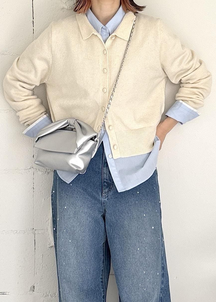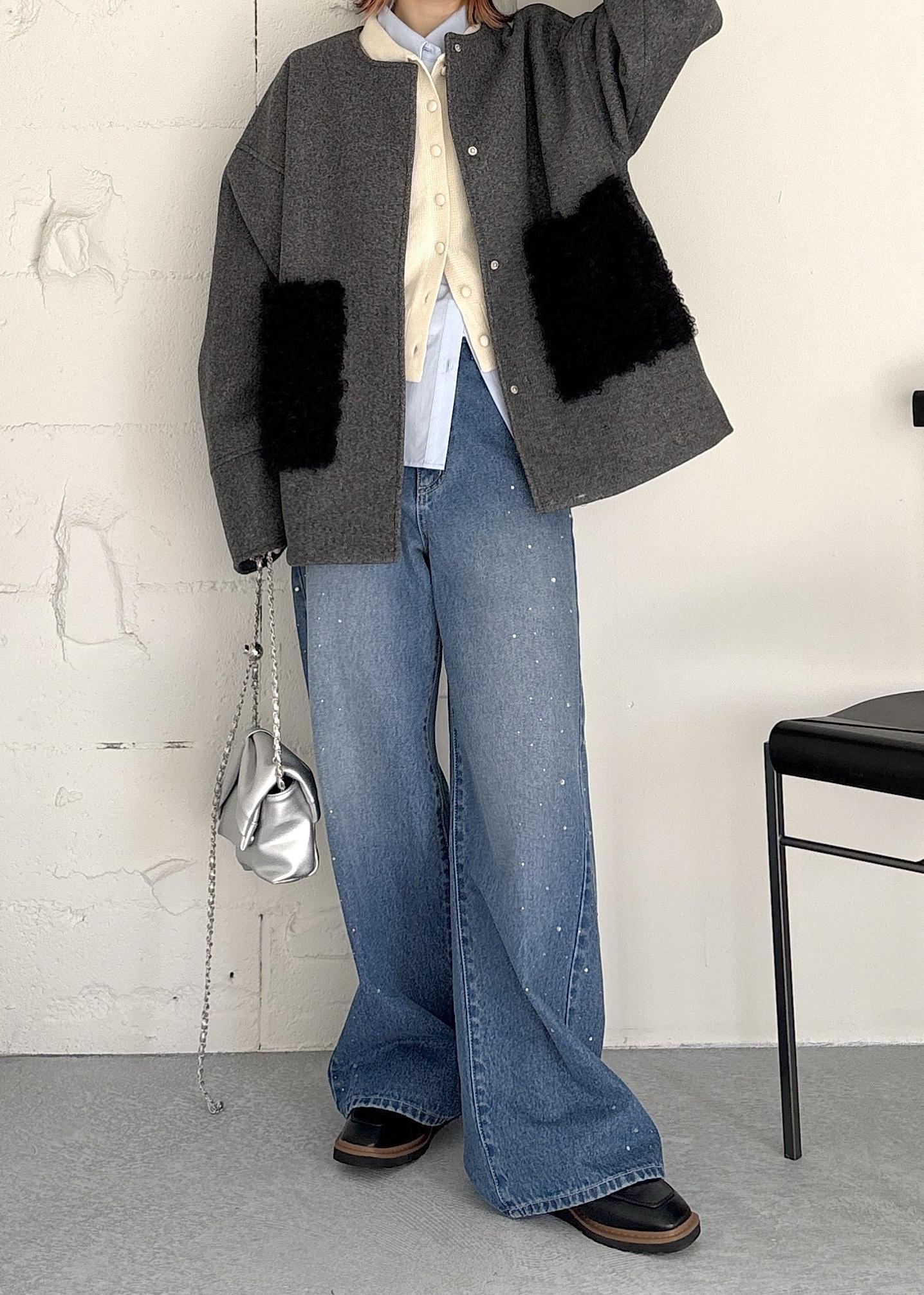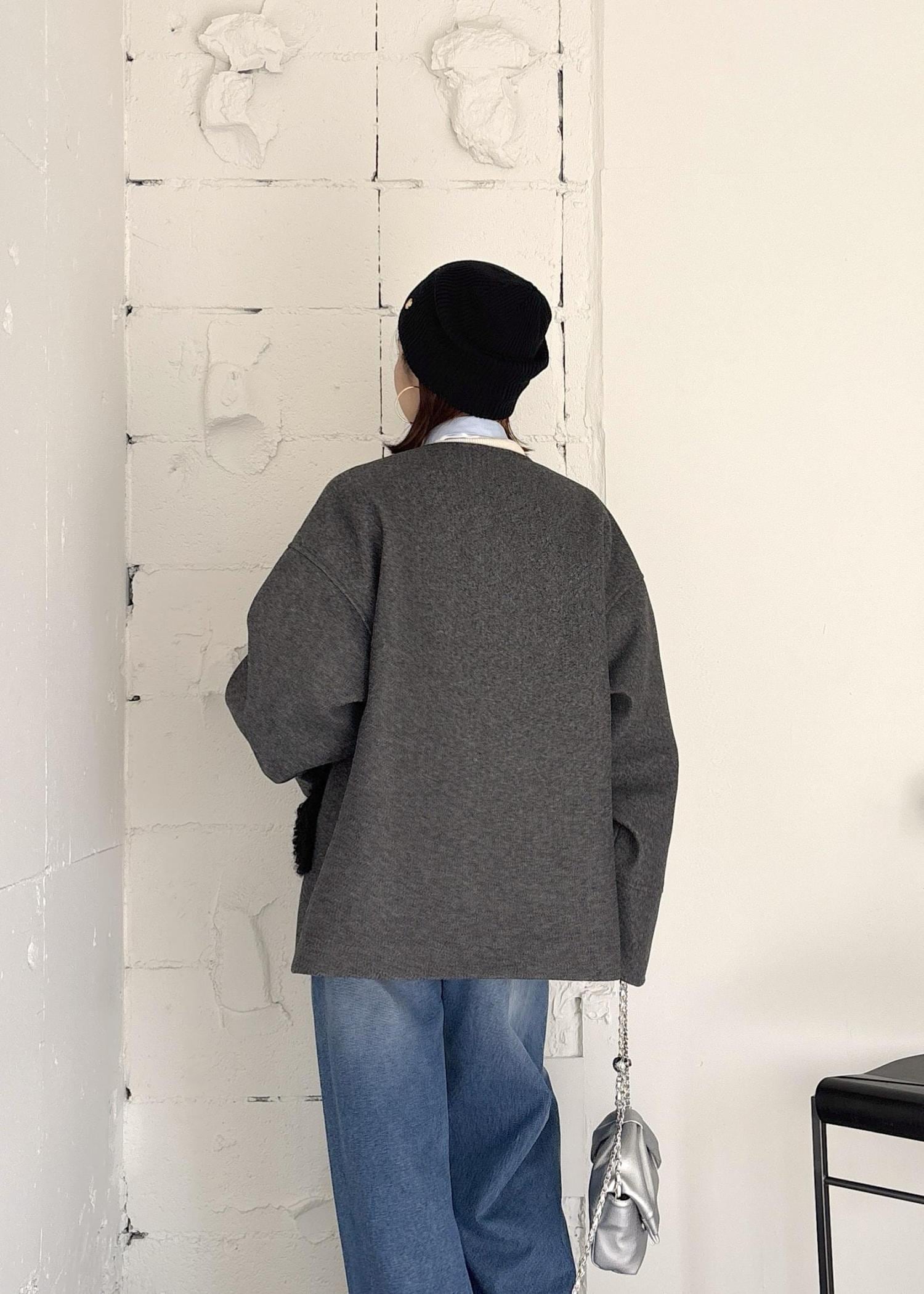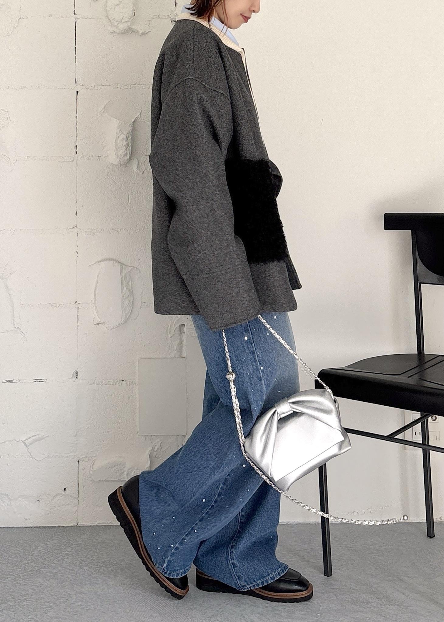 ポケットボアが大人可愛いグレーのコートをポイントに、シャツとカーディガンをレイヤード、デニムでまとめたカジュアルスタイル♪今年らしいシャツとのレイヤードスタイルの際、ノーカラーコートからちらっと襟元が見えて可愛い。スッキリローファーとビーニーは黒、リボンが可愛いシルバーバックはグレーとの相性抜群です。冬のお出かけにぴったりな大人カジュアルコーデ。
