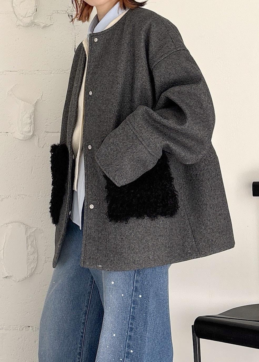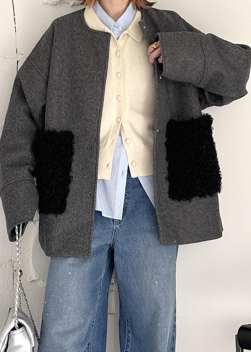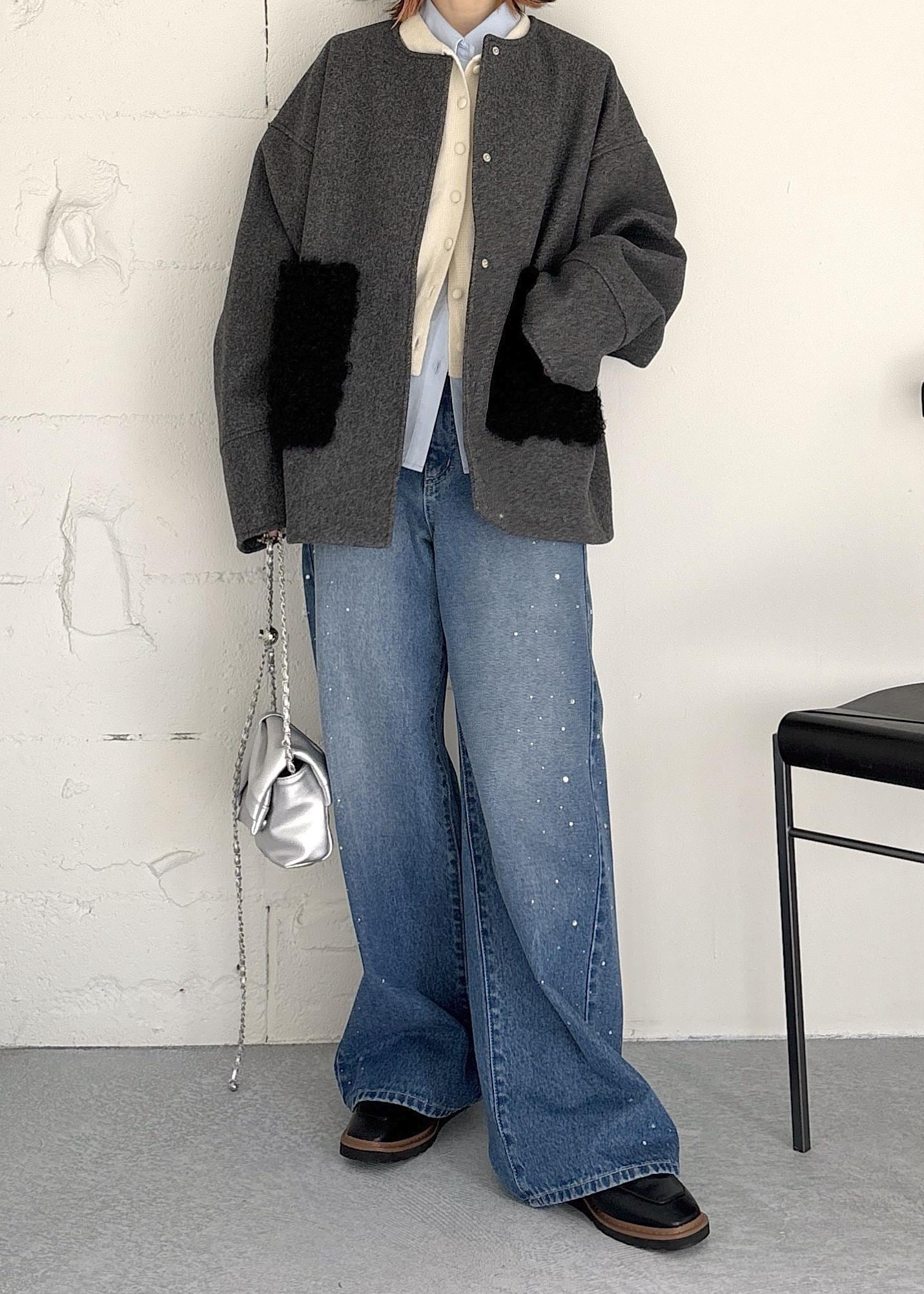 NEW! 予約VIS【WEB限定】ボアポケットノーカラーコートチャコール / F¥15,180レビューポケットボアが大人可愛いミドルコート♪ノーカラーで少しゆったりめな作りになっているので、さらっと軽く羽織れるデザイン。着心地も軽くて着やすいです。すっきりとした見た目なので、幅広いコーデに合わせられます◎