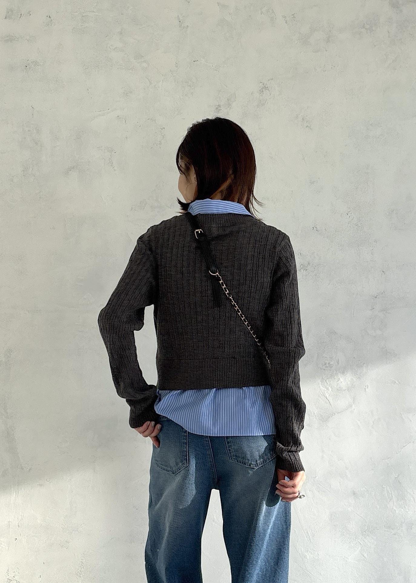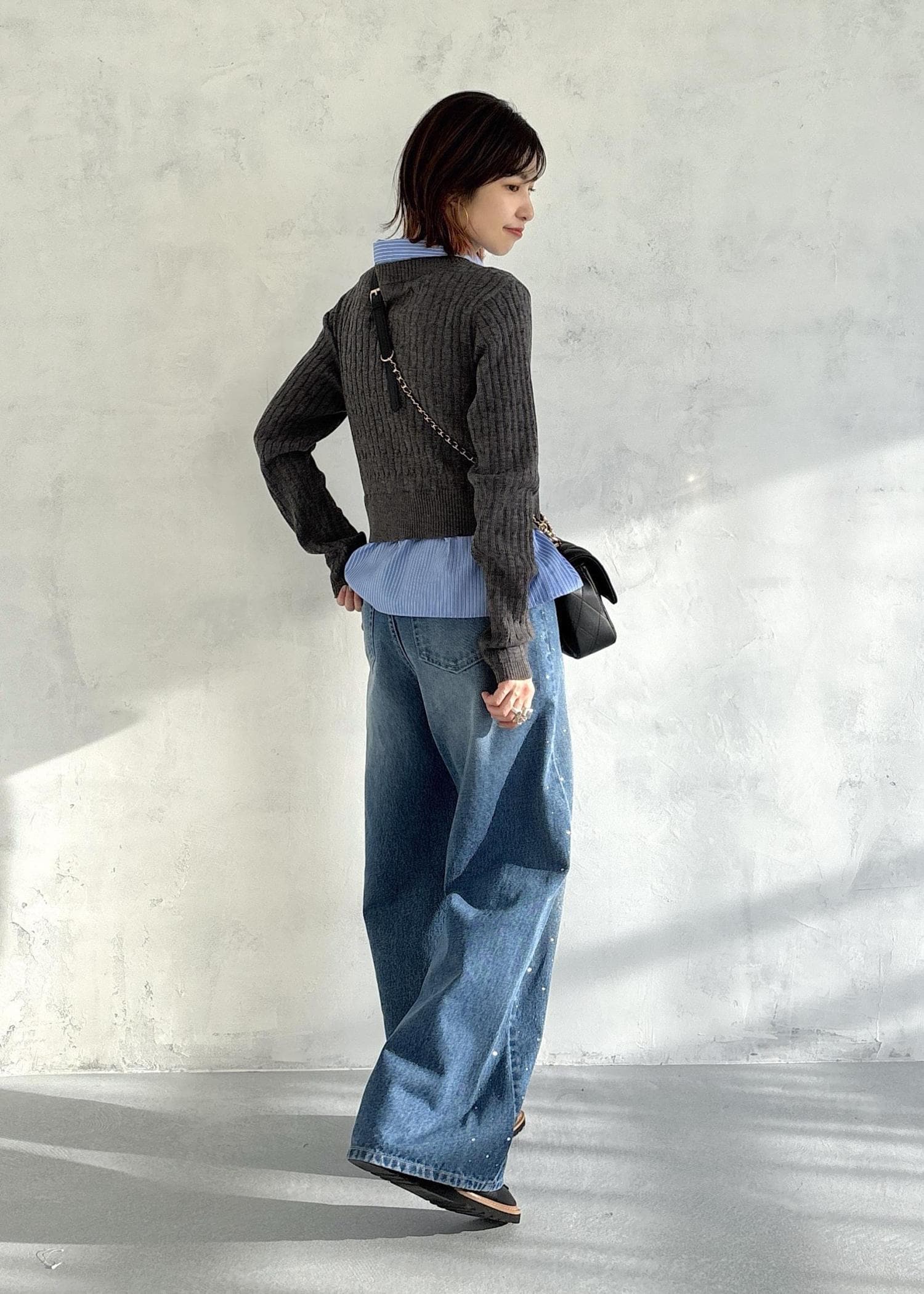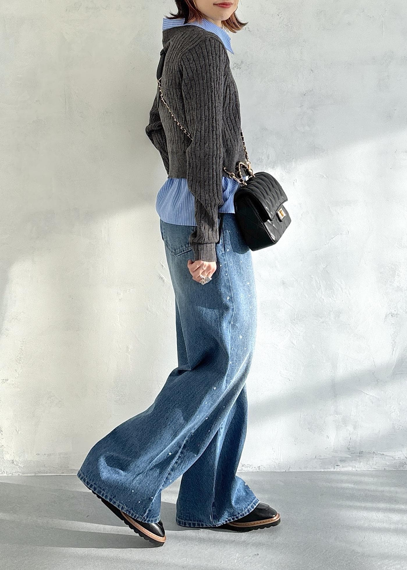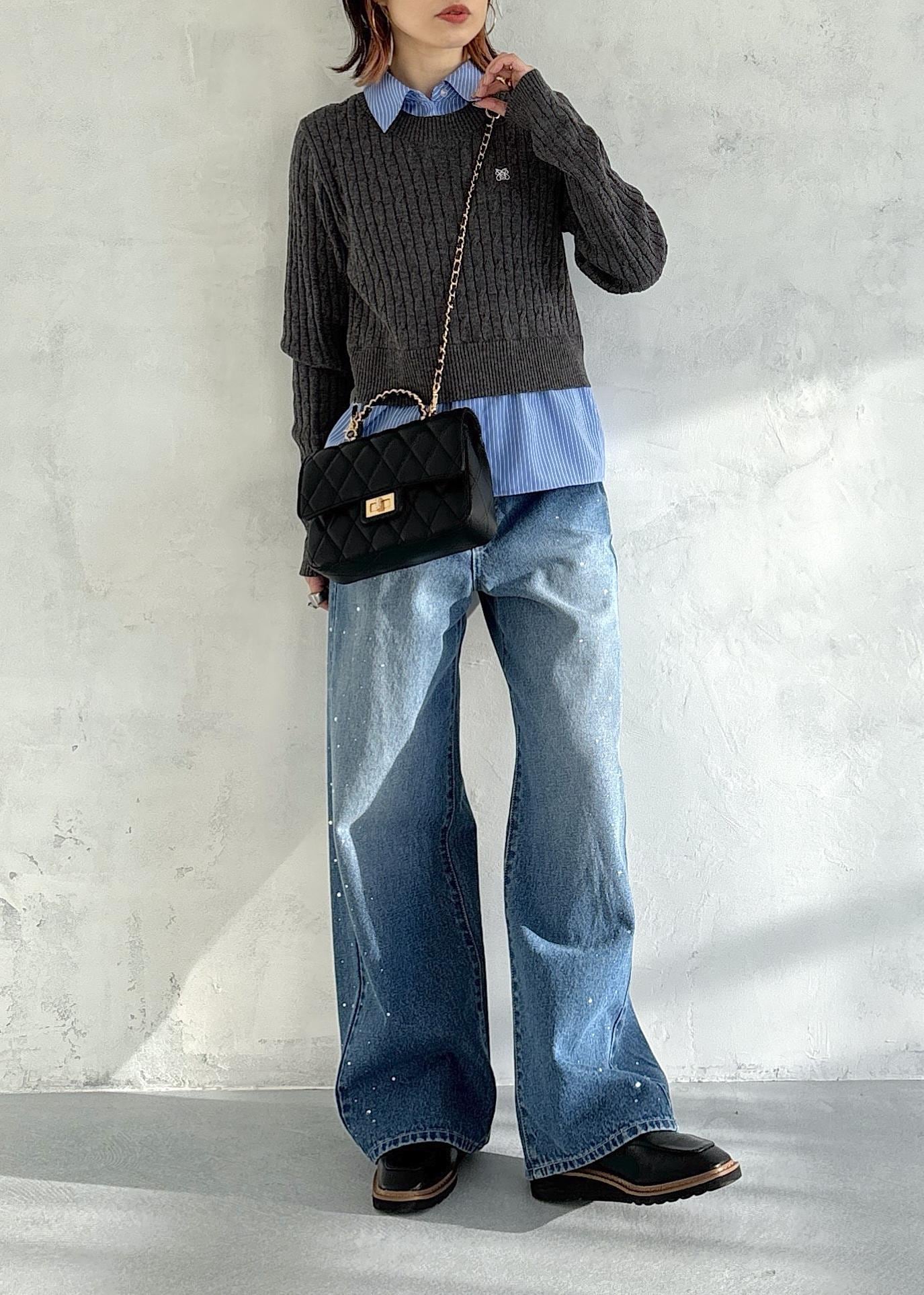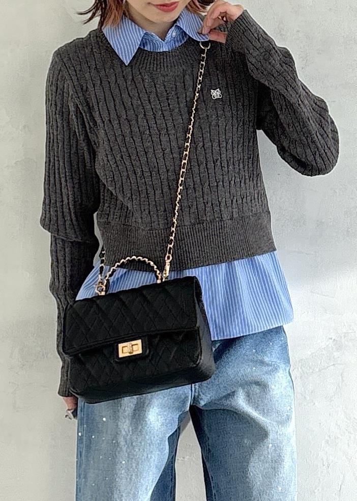 一枚で決まるドッキングニットをポイントに、デニムで合わせたカジュアルスタイル♪ニットはミニケーブル編みでコンパクトになっているので、スッキリとした印象◎裾のシャツが程よいハリ感で、お尻周りを優しく隠してくれるのも嬉しいポイント。小物はブラックでまとめた冬のインナーから春先まで着れる大人カジュアルコーデ。