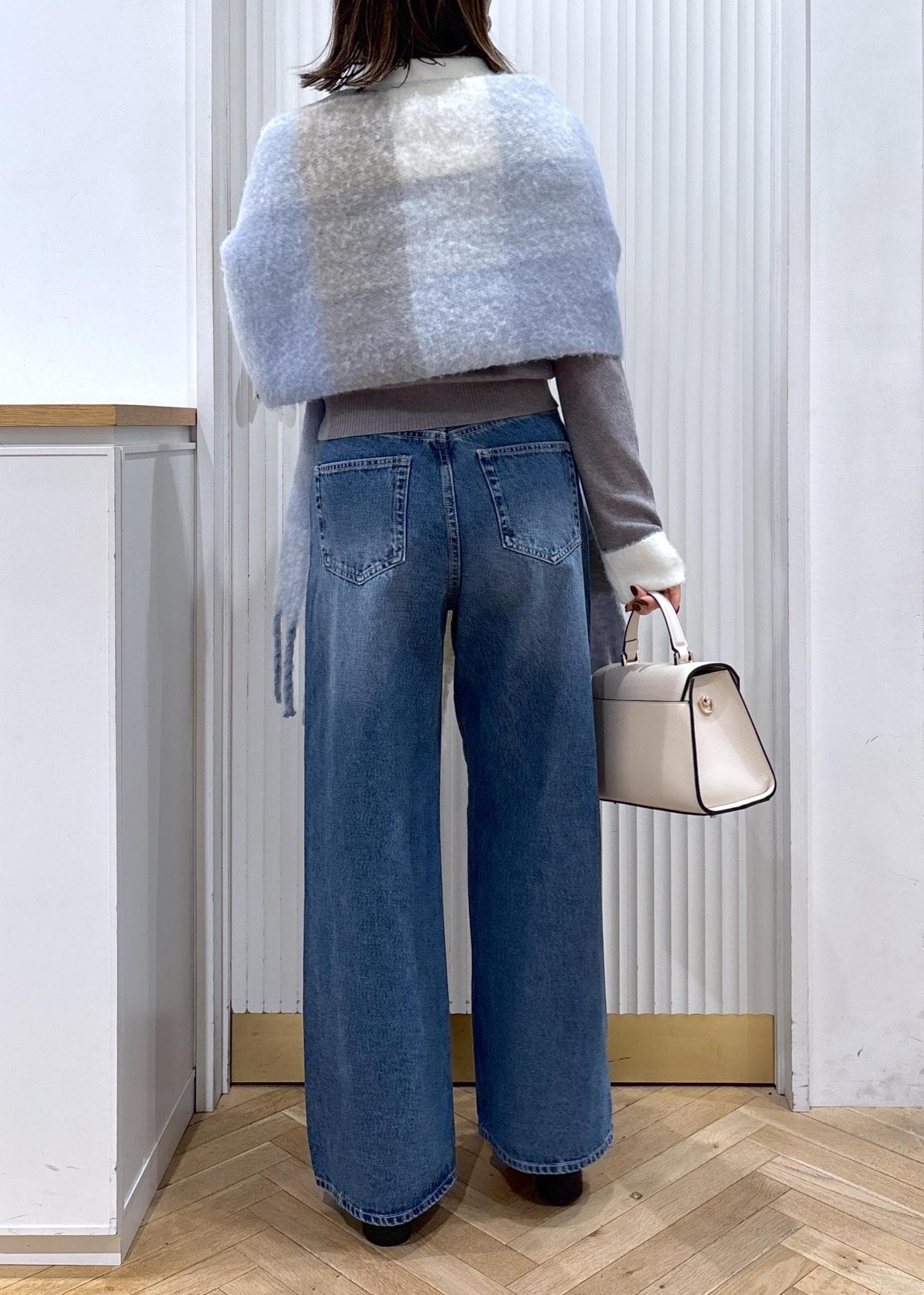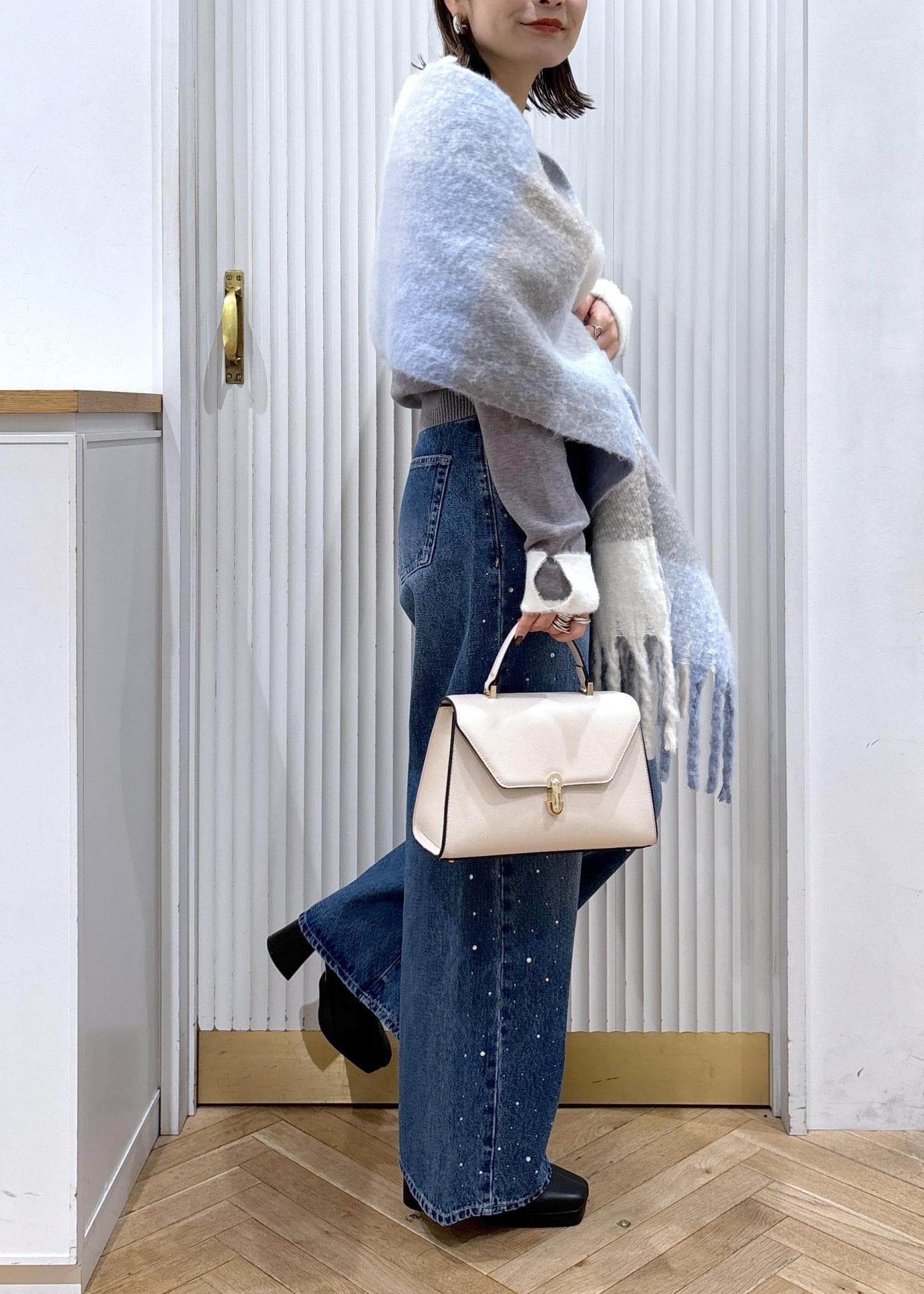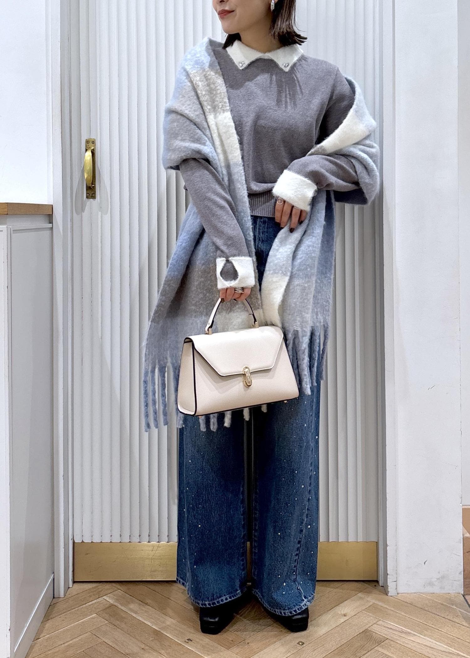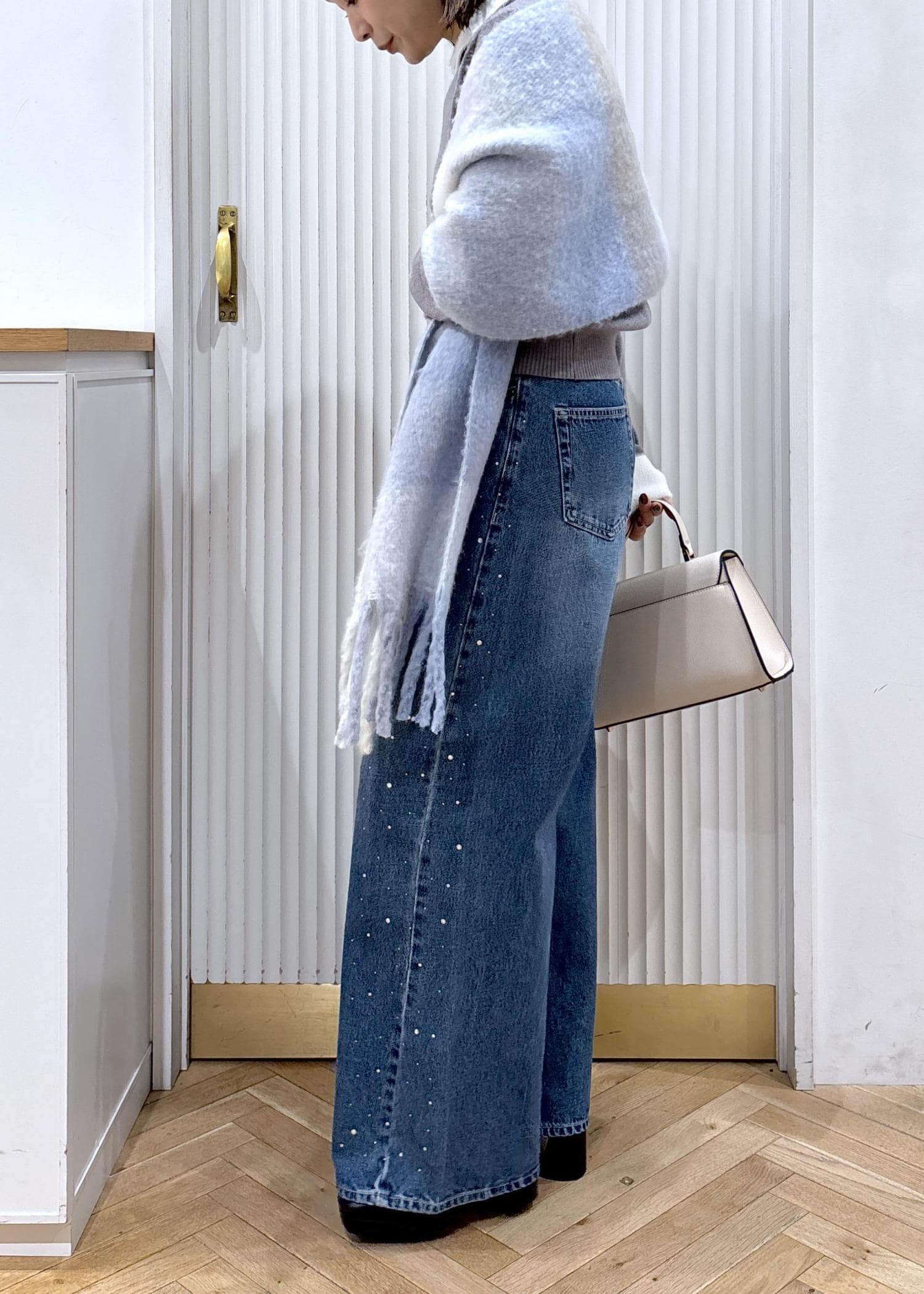 今年らしいニットポロにビジューが付いた大人可愛いトップスにキラキラのデニムを合わせたカジュアルコーデ♫