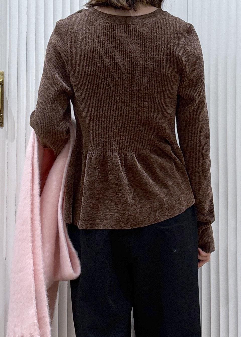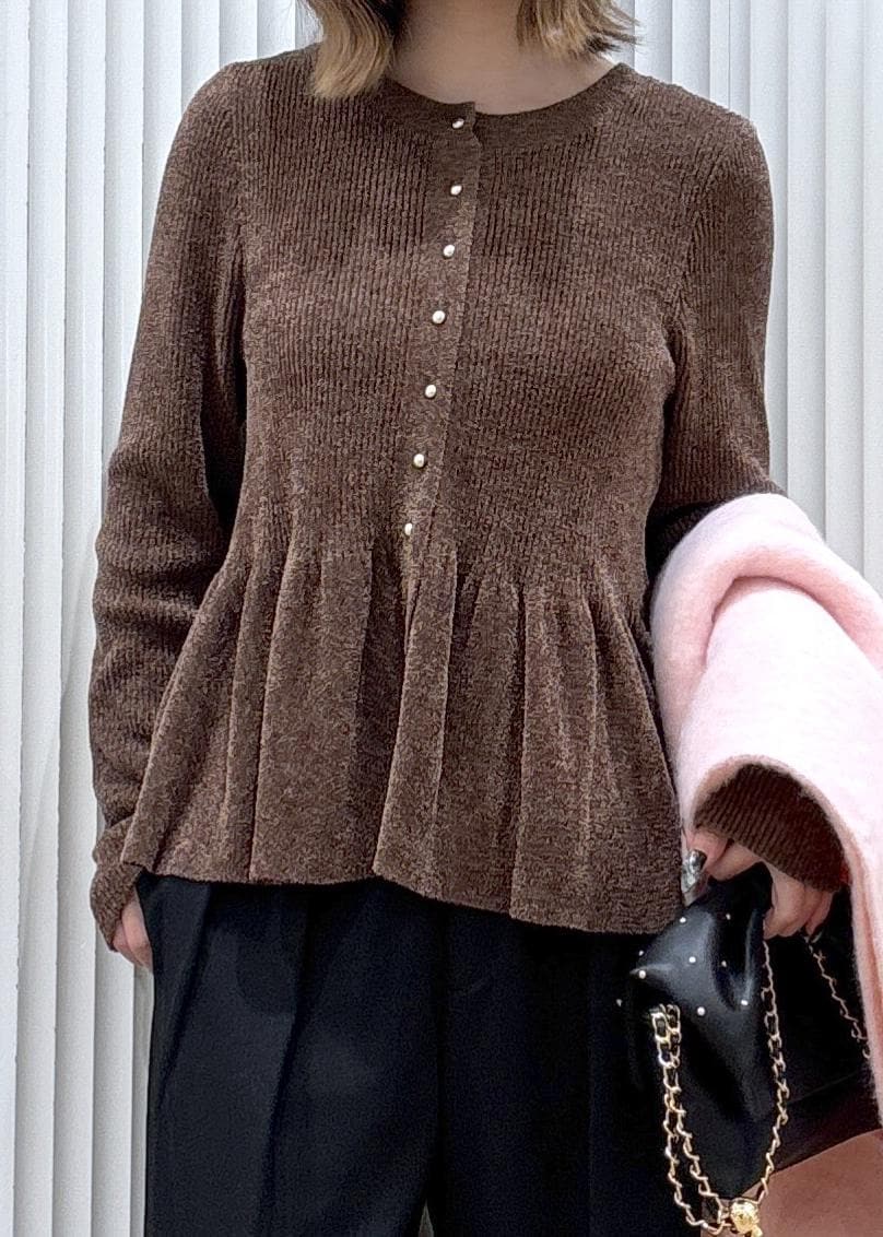 VISペプラム切替モールニットカーディガン/イージーケアダークブラウン / F¥6,589レビュー153センチ着用で腰が隠れる着丈でした。腰回りはカバーされますがお尻まで隠れる着丈ではなく、ウエスト位置で切り替えがくるような形でした。柔らかく温かい生地感なので羽織でも1枚着としても秋冬大活躍です!