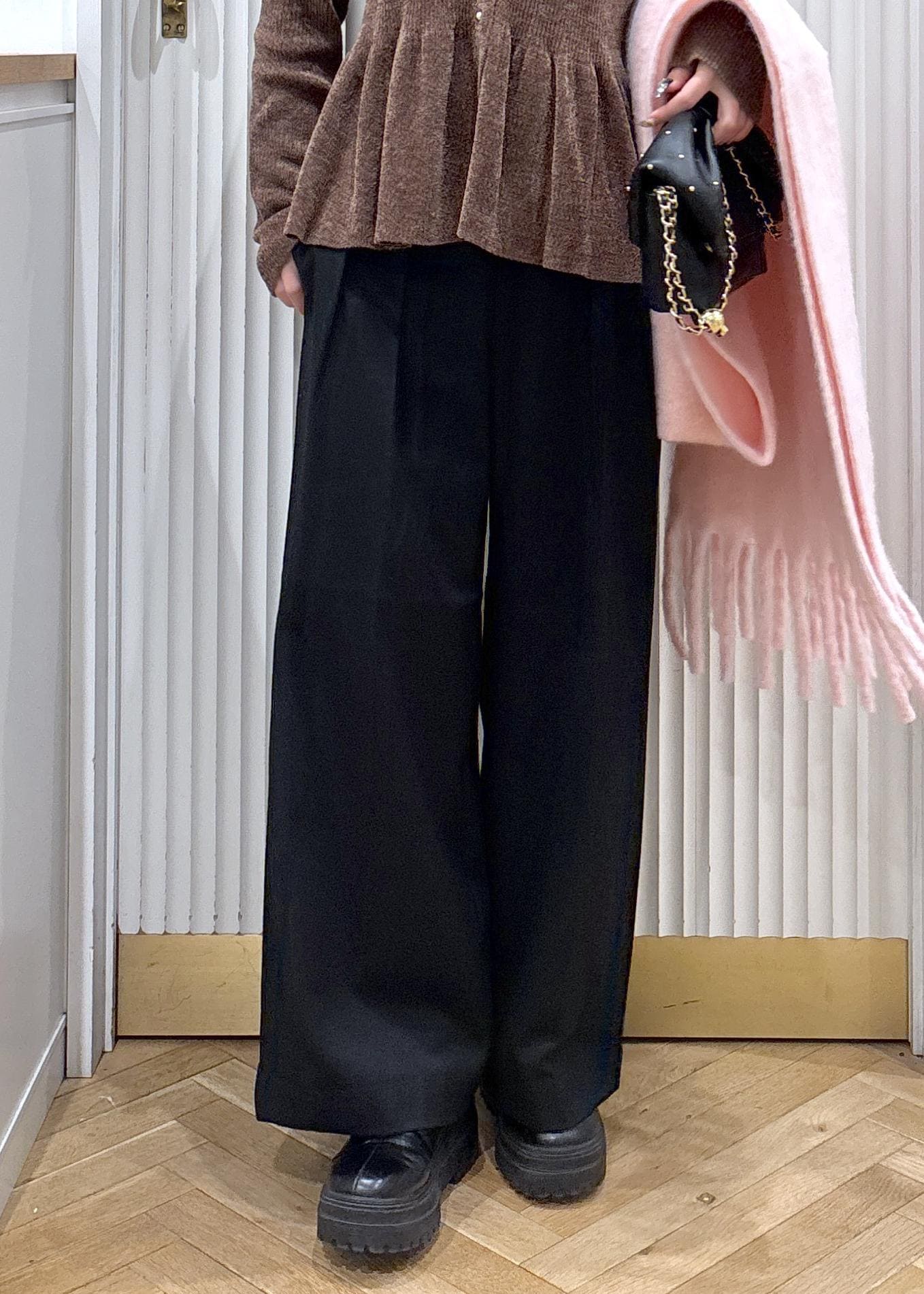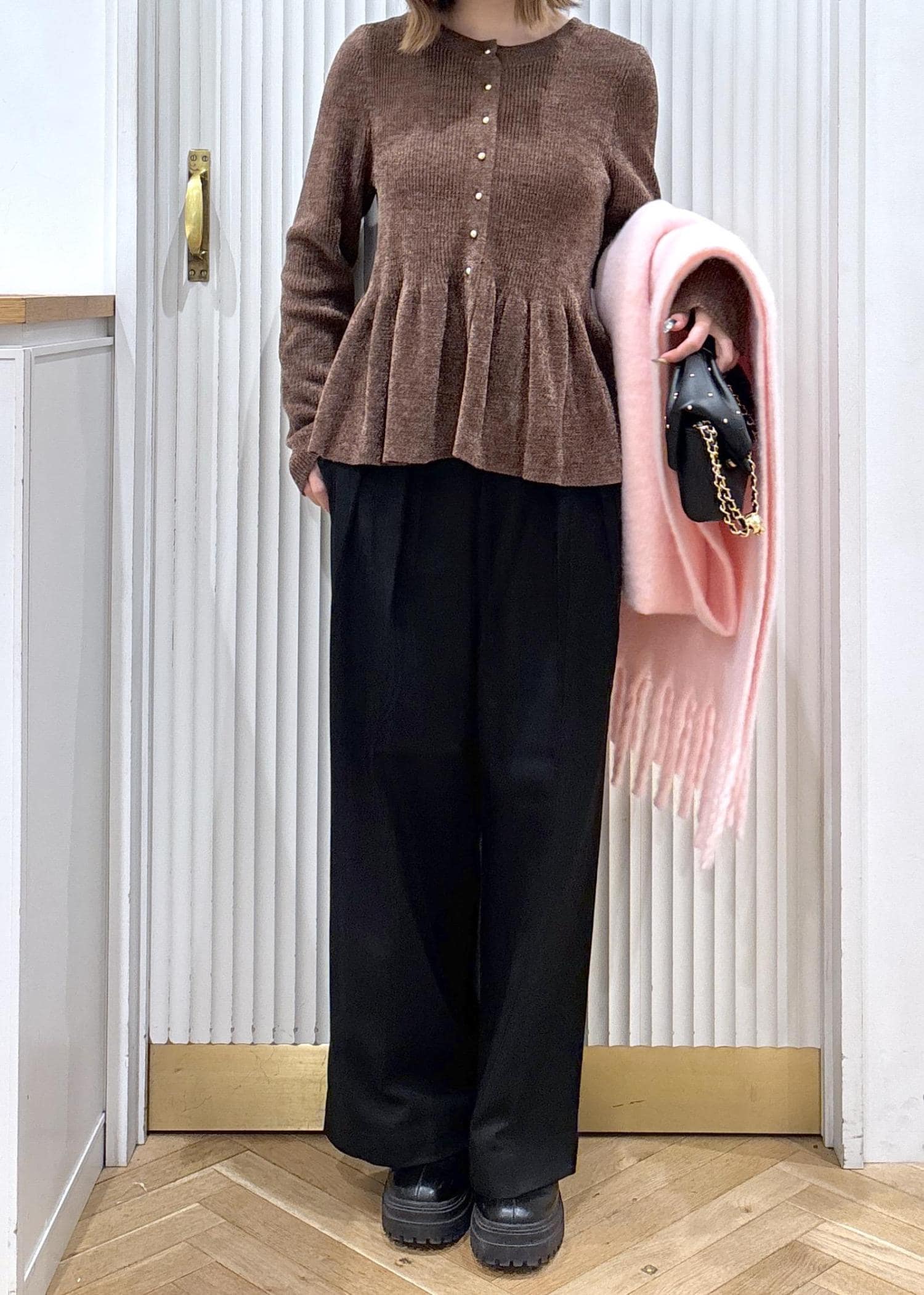 ペプラムカーデを着たいけど脚が短く見えちゃうと挑戦できない方におすすめのコーディネートです!ワイドめでもスラックスで落ち感がしっかりでるパンツに厚底のブーツで脚が綺麗に長く見えます!またペプラムのカーディガンも切り替え位置が高めなので低身長さんでも着やすいです☺︎差し色にピンクを入れる事でコーディネートが暗くならず女性らしさもアップします!