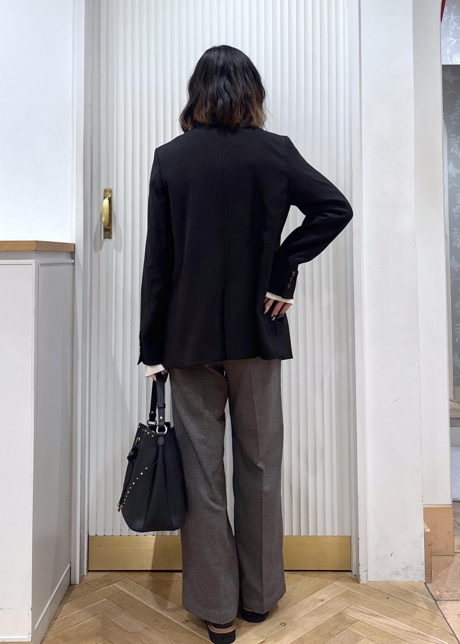 黒が多めのオフィスカジュアルコーデです!上下黒だと重たくなりすぎますがボトムをグレーにするだけで雰囲気がガラッと変わります!中にグリーンのニットが入る事で顔周りは明るさが出ます。コーディネートも重たさが軽減されかっこいい雰囲気が好きな方におすすめです!