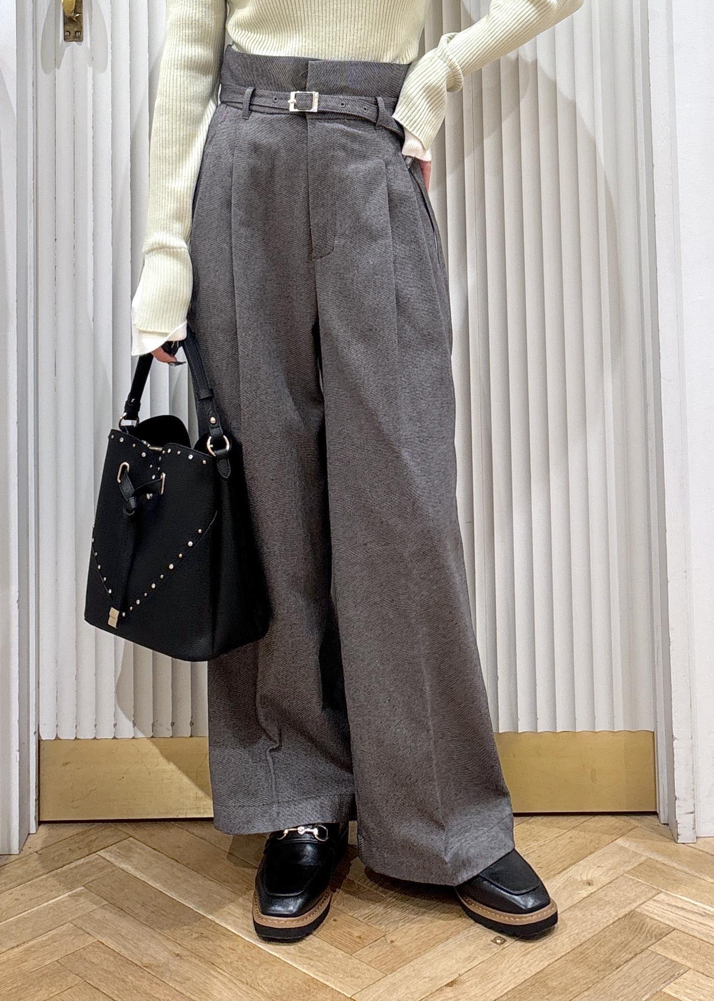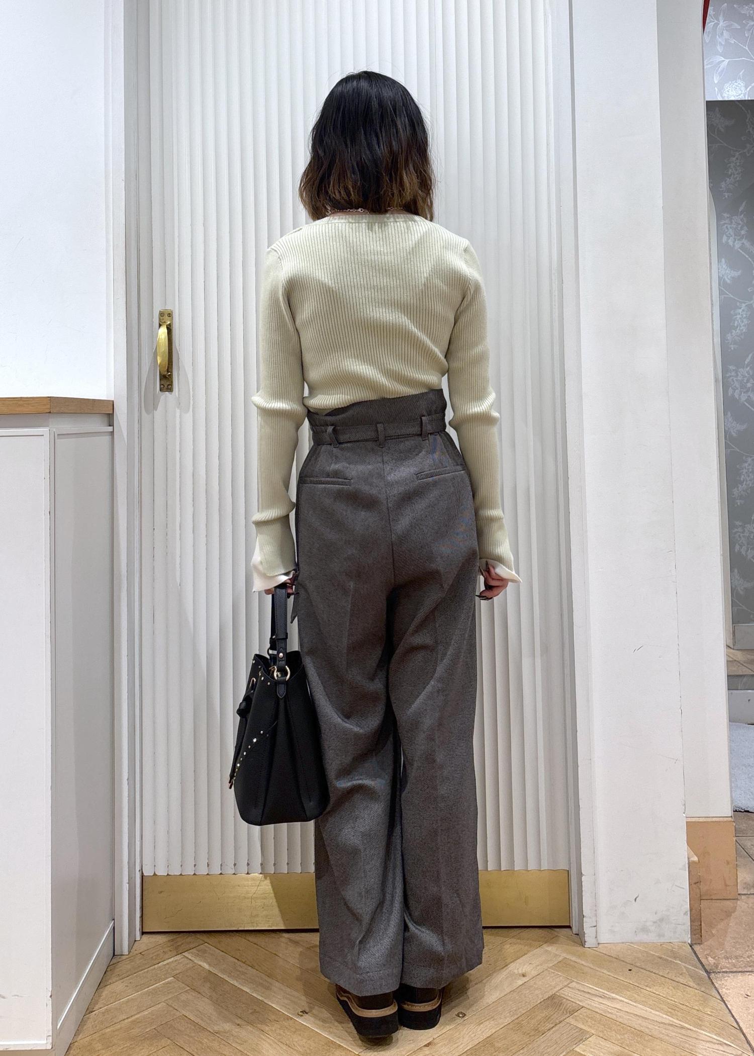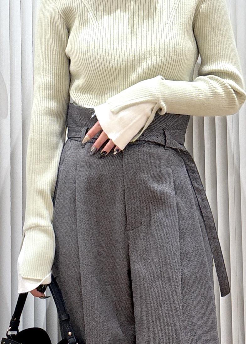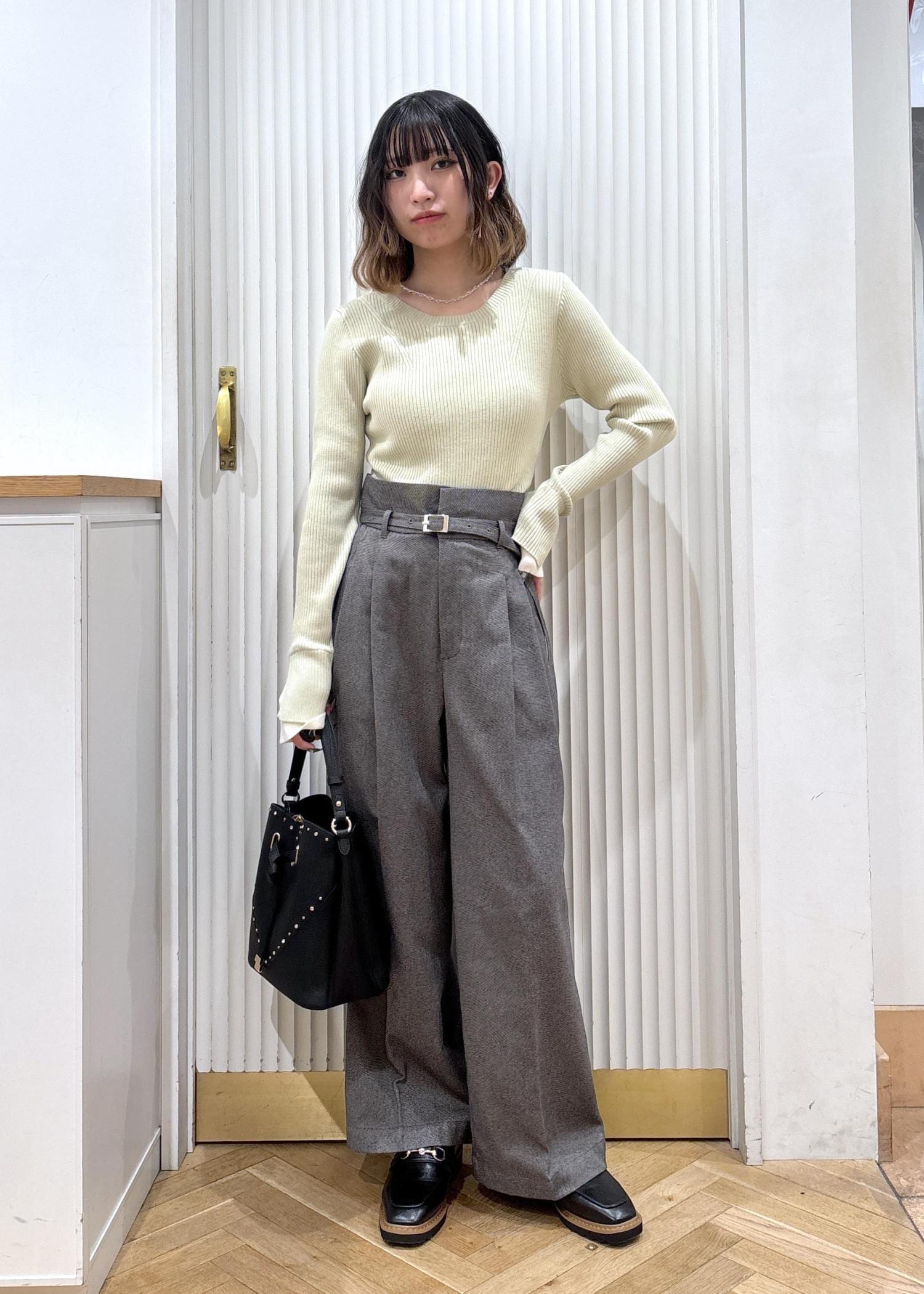 VIS起毛ウールライク版ベルトディテールタックワイドパンツグレー / SS¥6,589レビュー伸縮性があり生地も柔らかいので着心地がよくチクチク感もありません!首元は鎖骨がチラッと見えるくらいの開きなのでネックレスをつけると首元の開きはほとんど気になりません。袖のデザインがレイヤード風になっているので一枚できてもインナー使いしても可愛いアイテムです!
