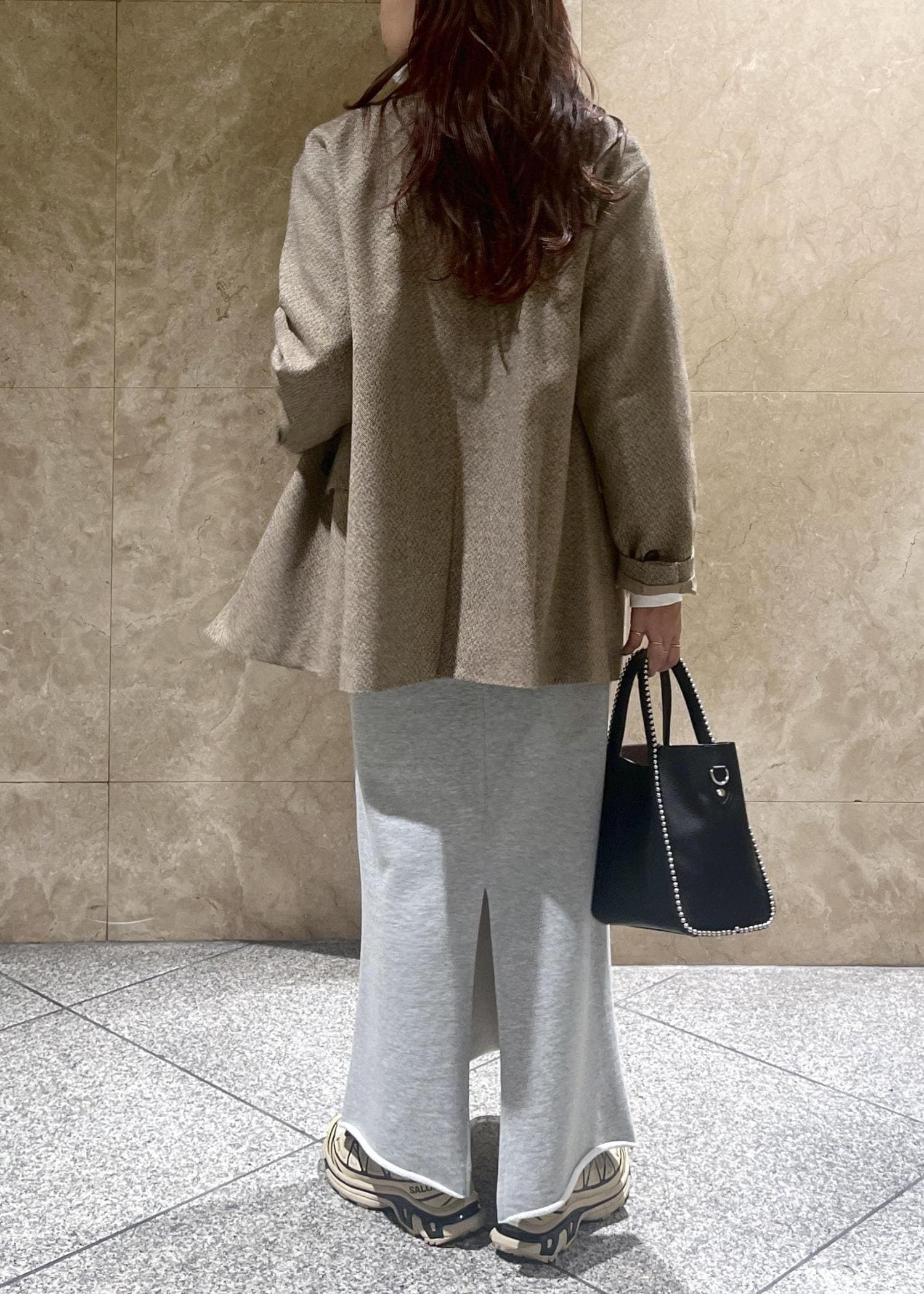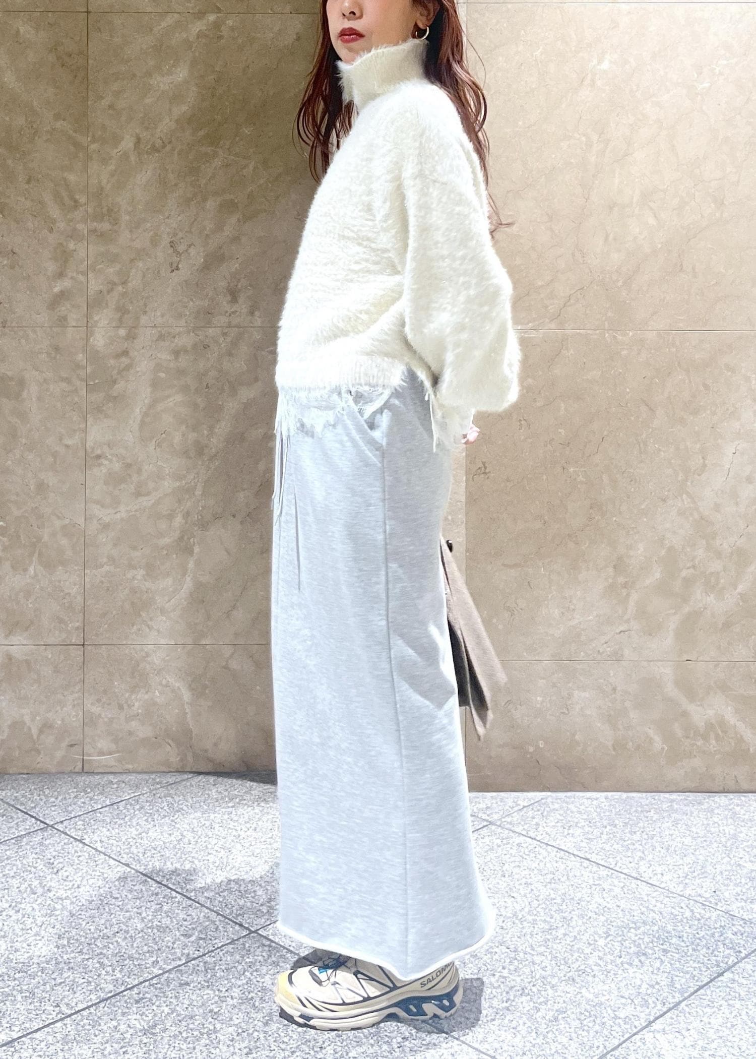 スウェットの楽な着心地はもちろんのこと、タイトすぎないながらすっきりとしたシルエット、後ろの深めのスリットでほどよい抜け感もあり、女性らしく着用できます。 -