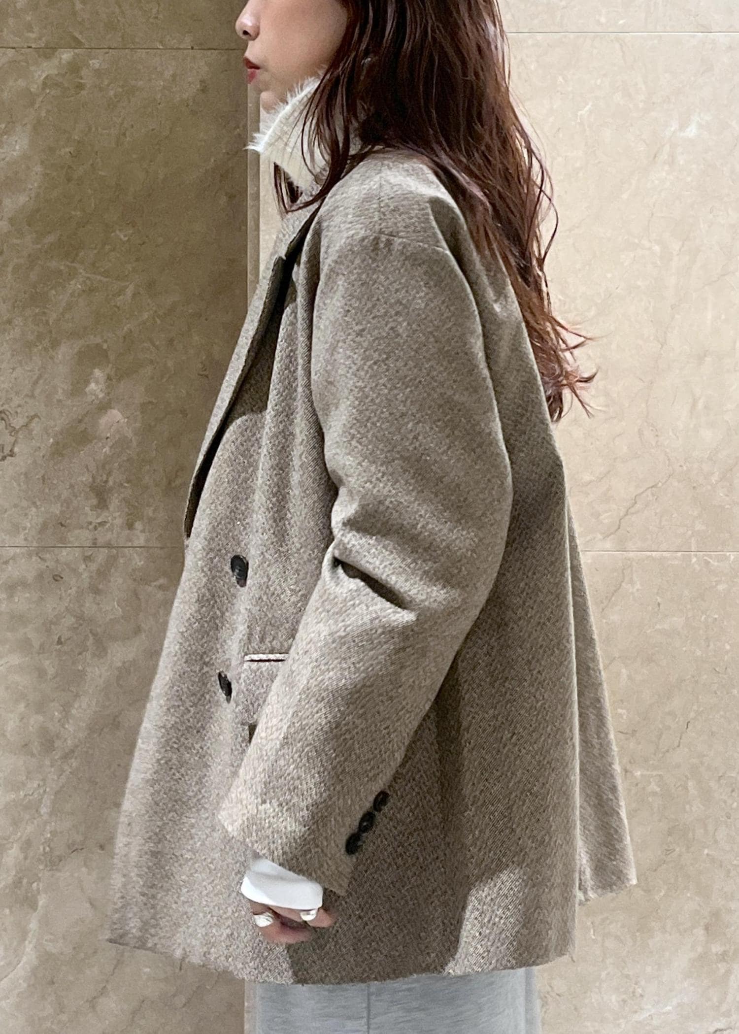 袖丈も手の甲が隠れ、肩周りもゆったりと落ちるデザインなので、全体的にこなれ感の出せるオーバーサイズで、インナーには厚手のニットを着られる余裕もあり!写真のコーディネートではウエストのベルトを外して着用しています。