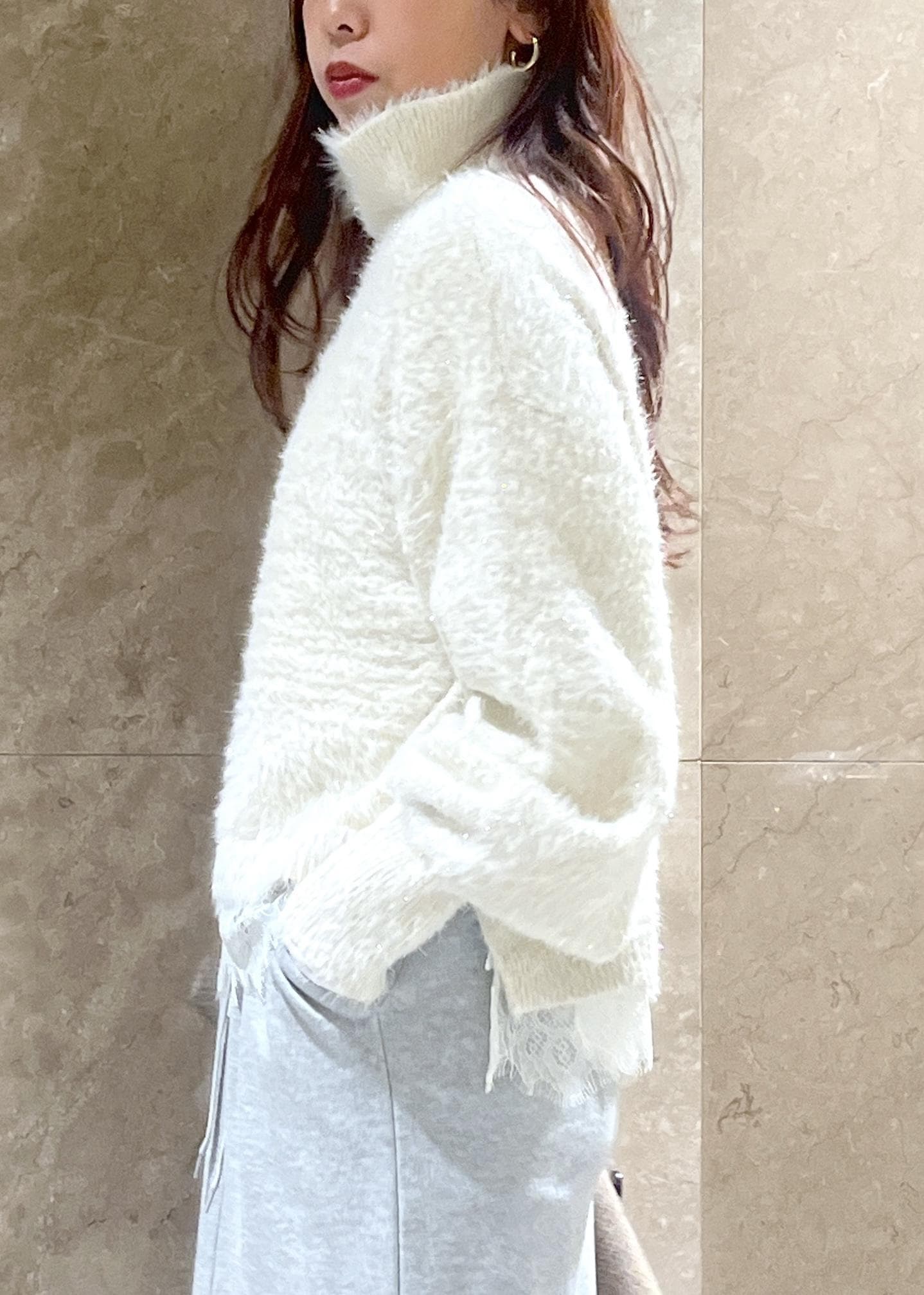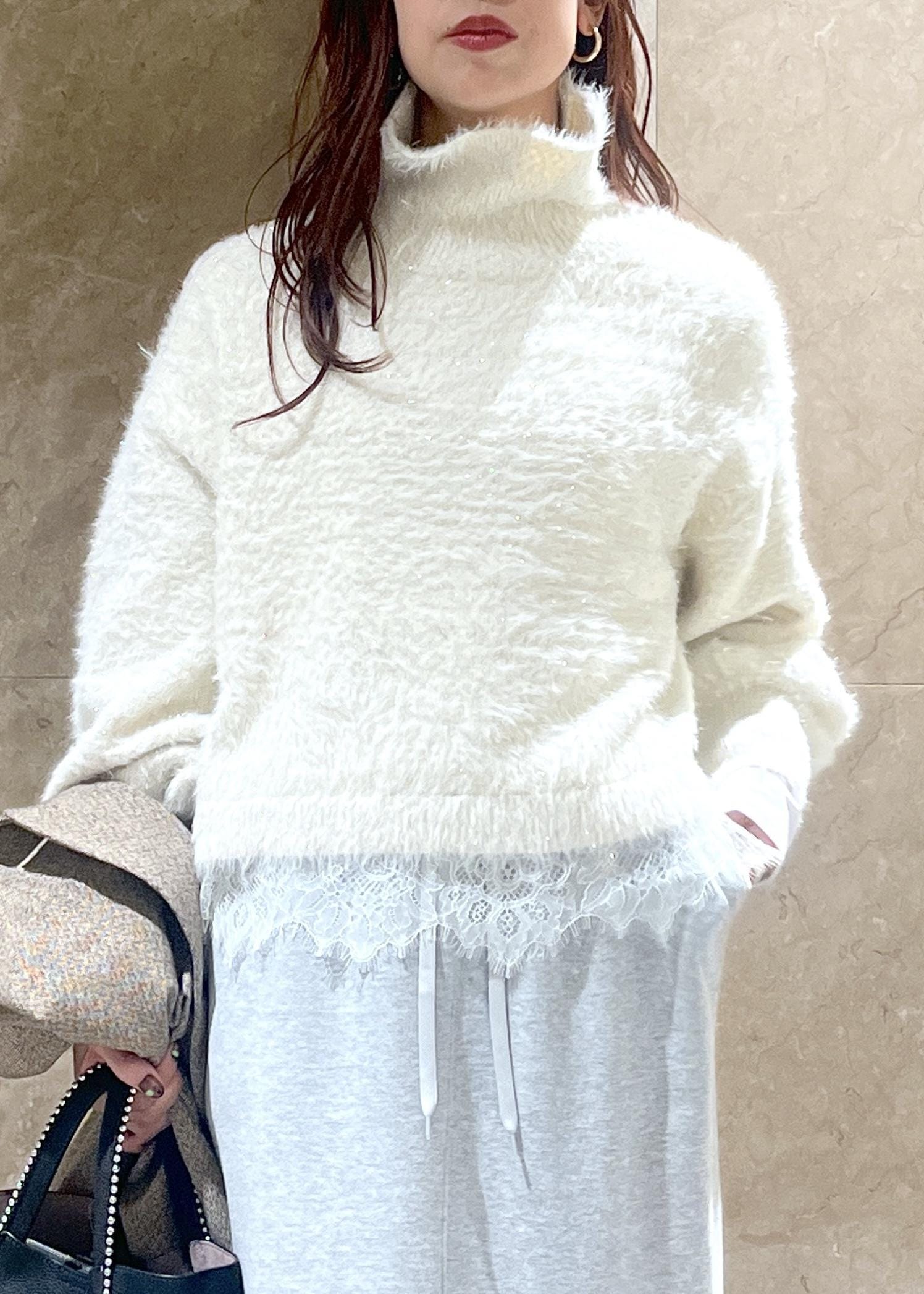 VISラメフェザー裾レースハイネックニットオフホワイト / F¥5,271レビュー身長158cm、着丈は前後差があり後ろはレース部分がおしりにかかるほど。