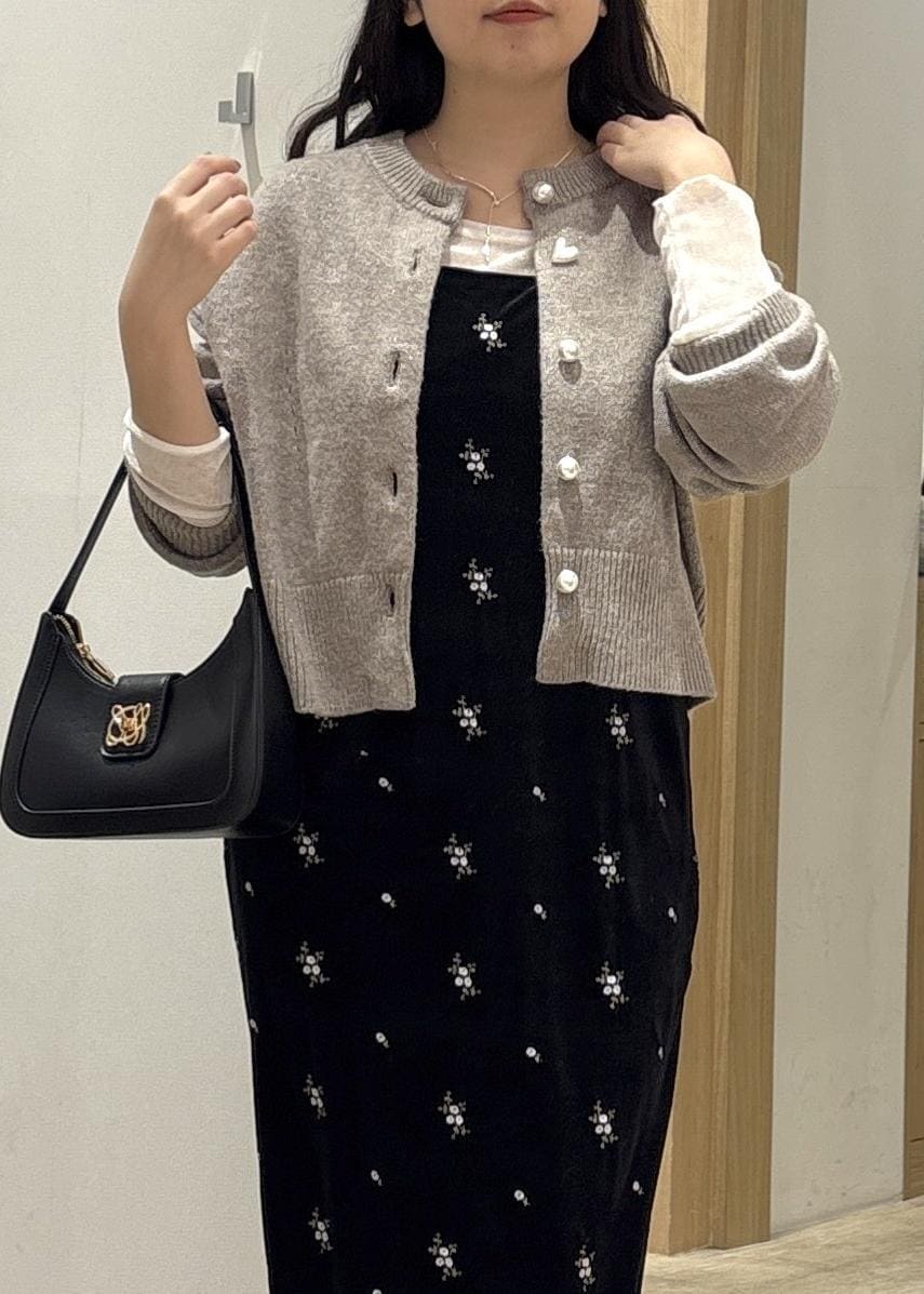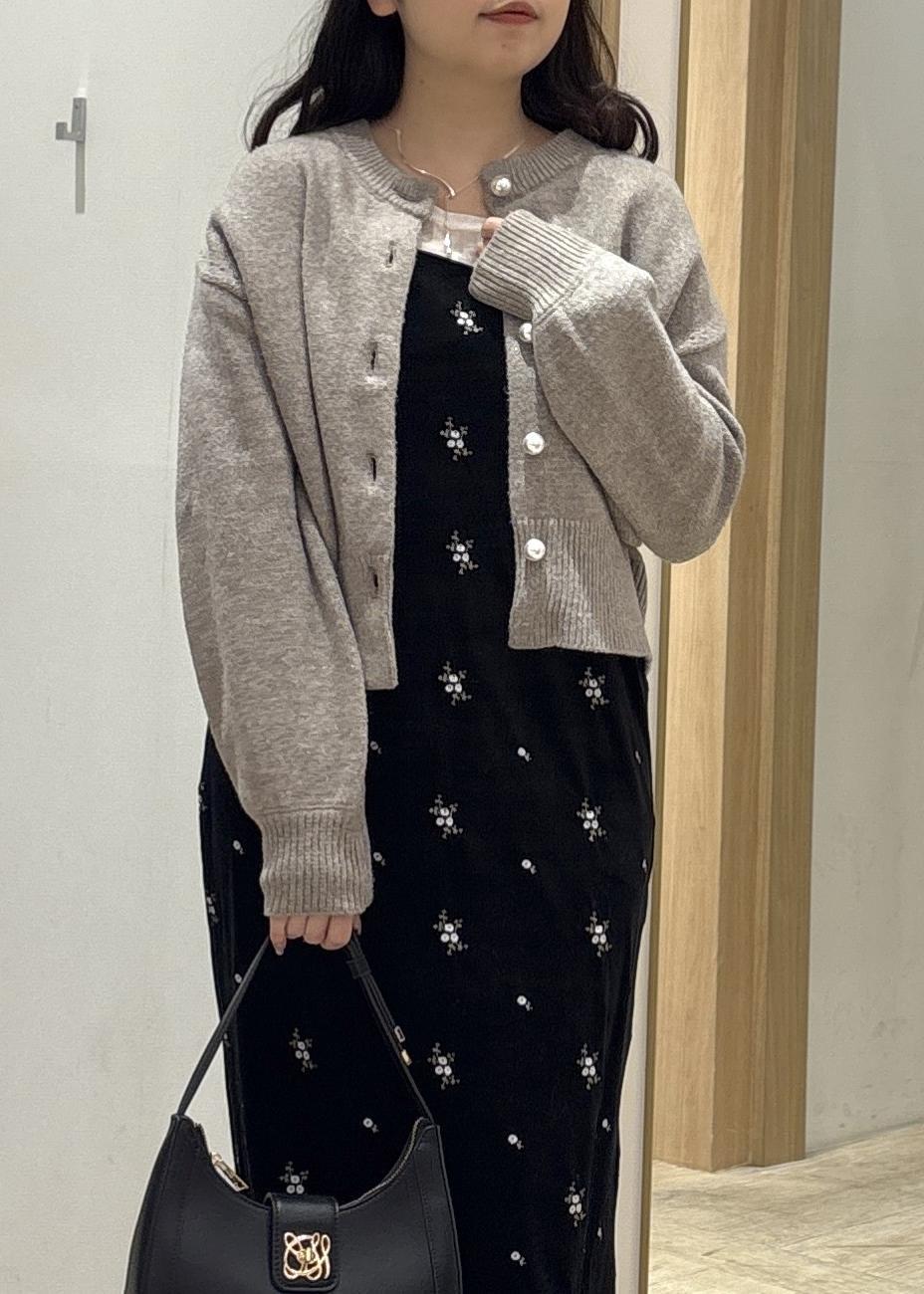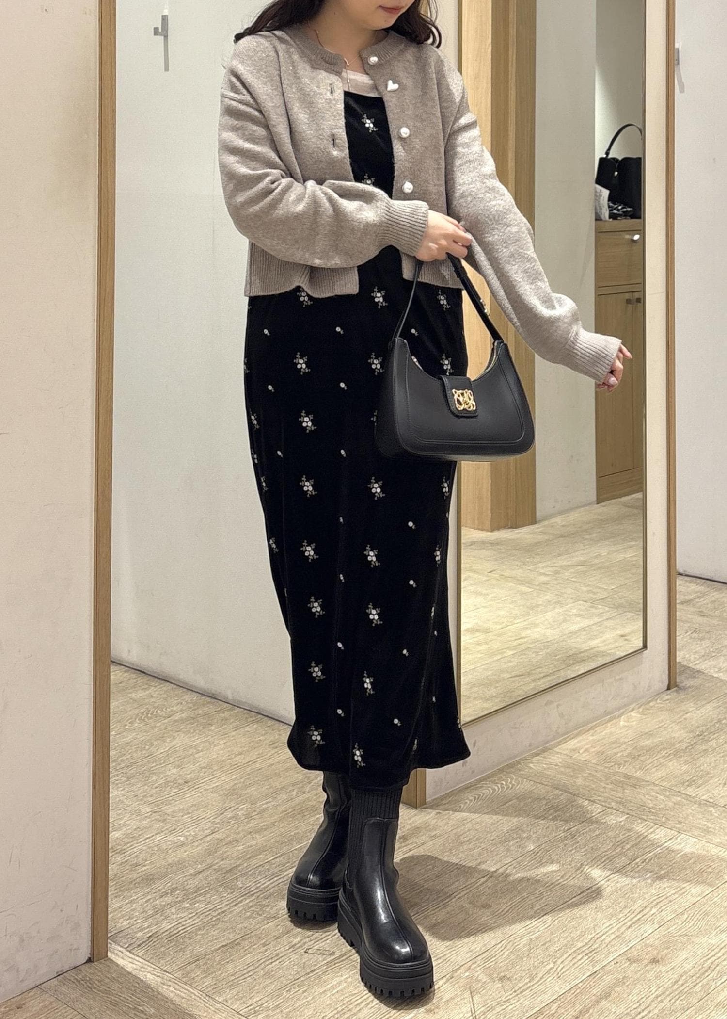 カーディガンのふんわり感とベロアワンピの落ち感のバランスがよく、上半身の立体感と下半身のスマートさが自然に整います。ベロアのリッチな質感にグレーの柔らかい色味を重ねることで、大人っぽさの中に可愛さが残り、甘すぎず、上品で、日常にも特別感にも寄せられるスタイルに!