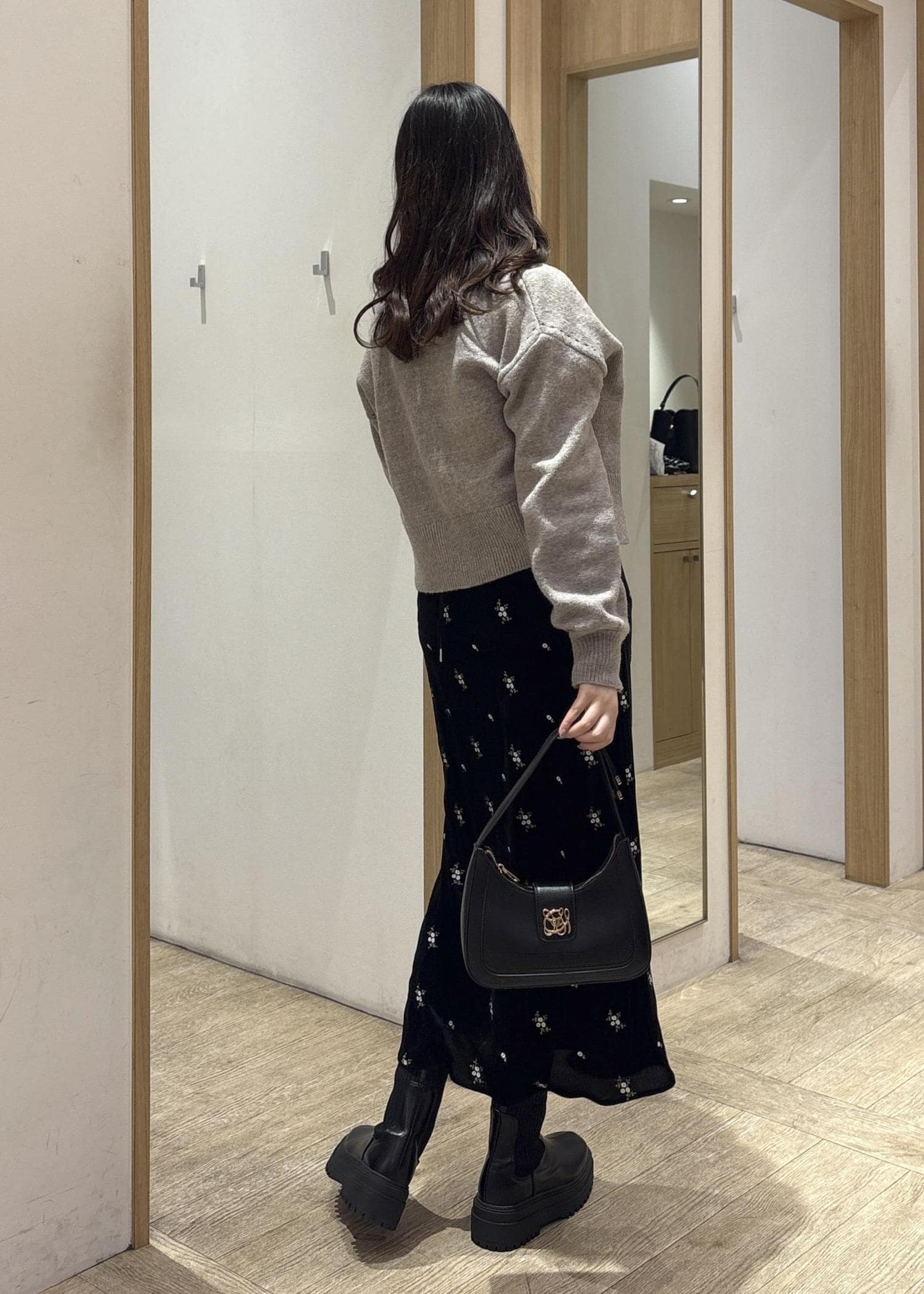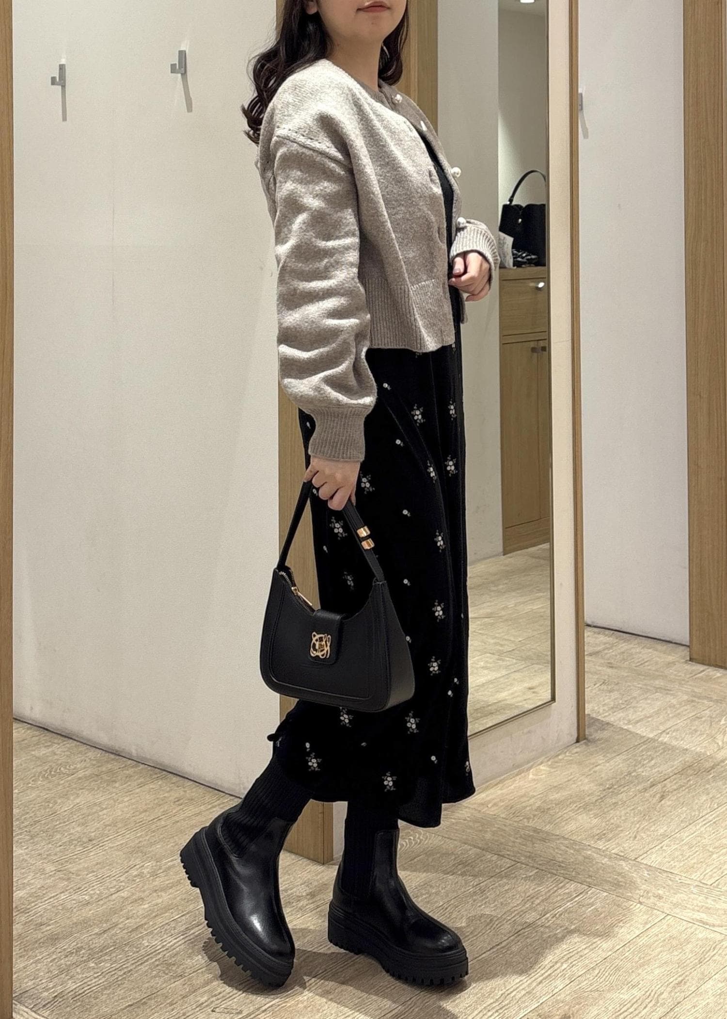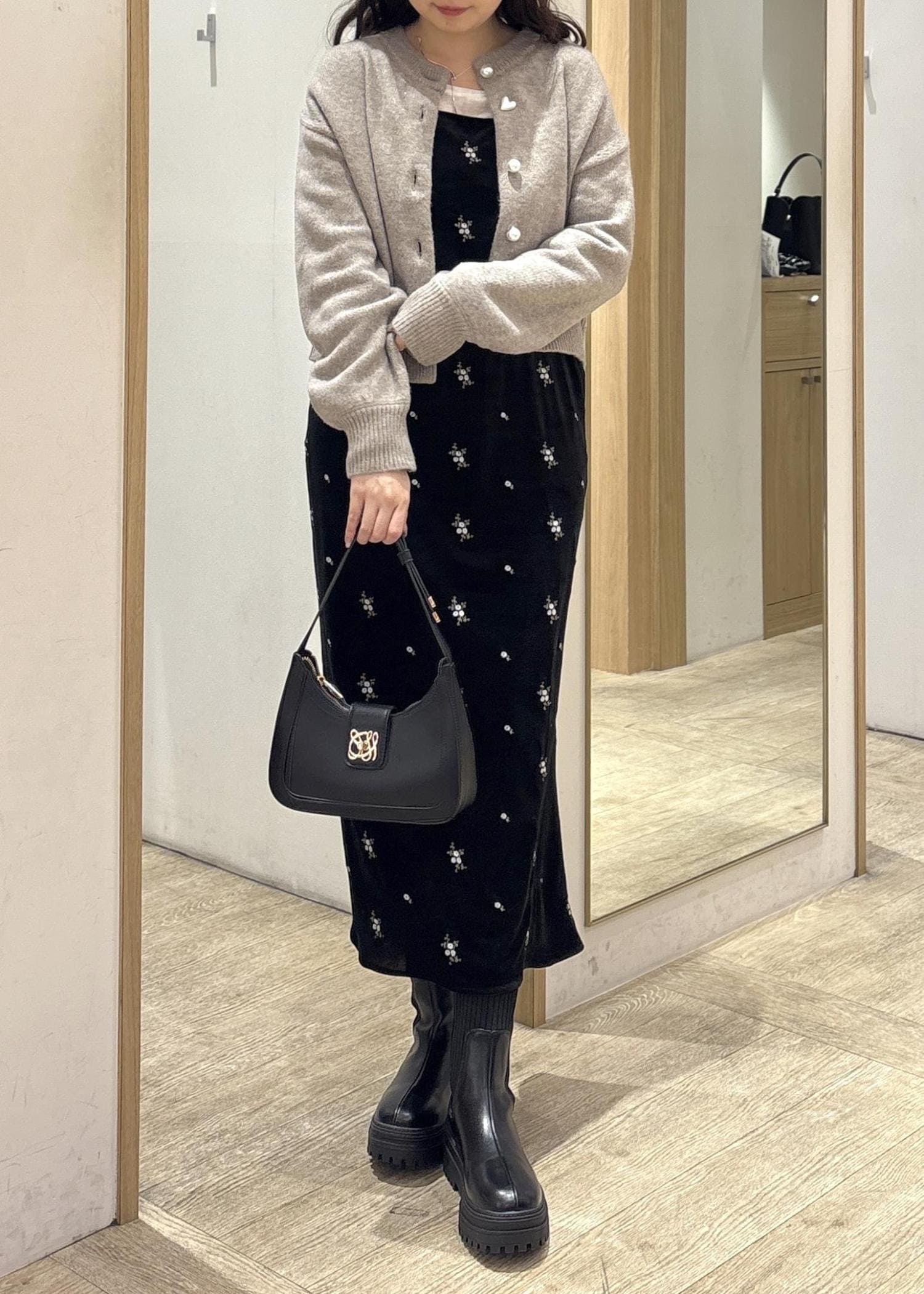 カーディガンのふんわり感とベロアワンピの落ち感のバランスがよく、上半身の立体感と下半身のスマートさが自然に整います。ベロアのリッチな質感にグレーの柔らかい色味を重ねることで、大人っぽさの中に可愛さが残り、甘すぎず、上品で、日常にも特別感にも寄せられるスタイルに!