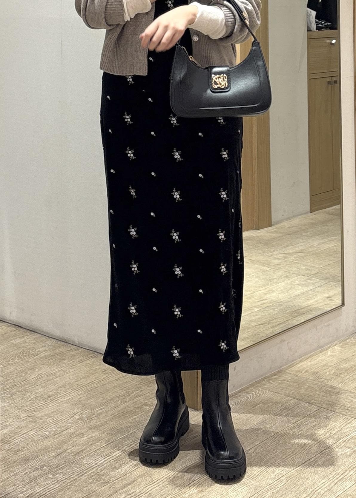 散りばめられた小花刺繍は間隔が広めなので腰周りにボリュームが集まらず、ミドル丈のIラインシルエットが自然に体に沿って上品な雰囲気に! -