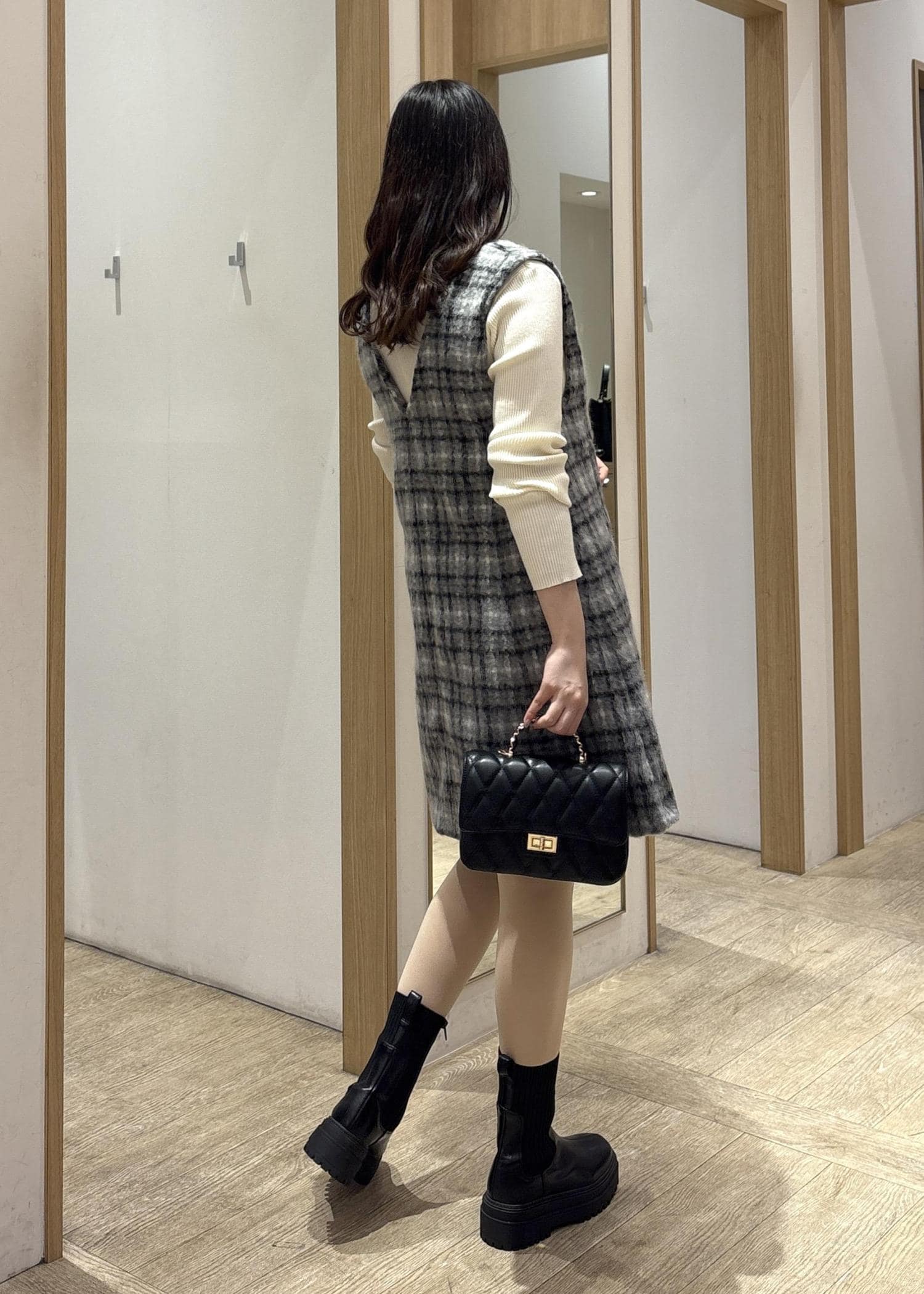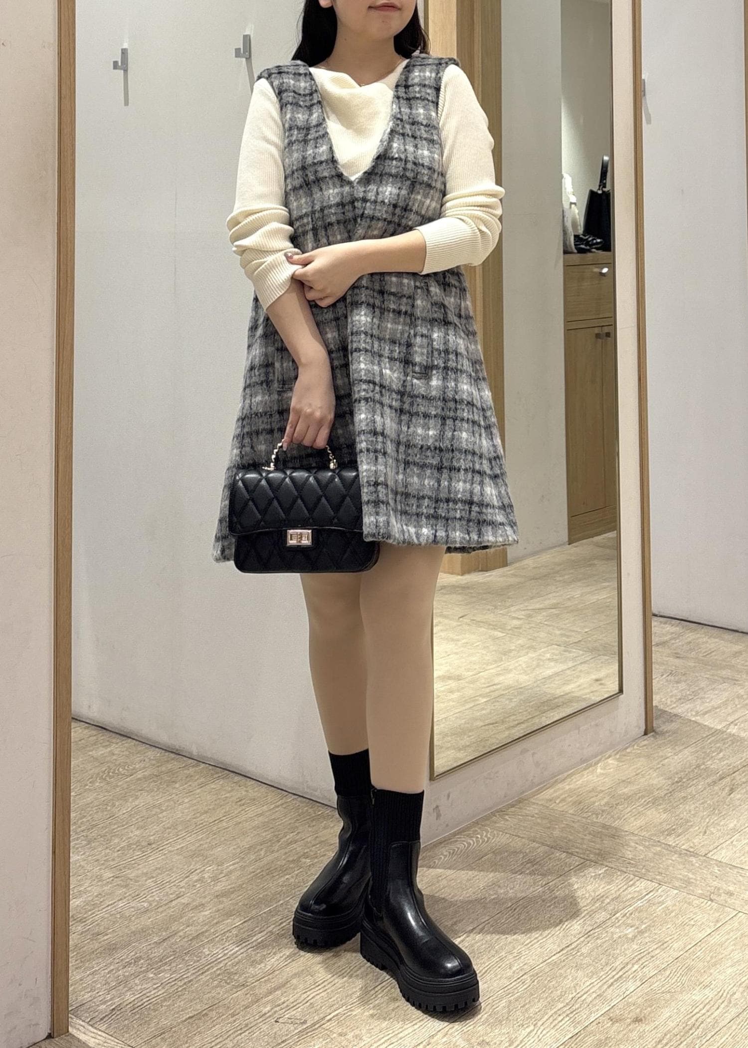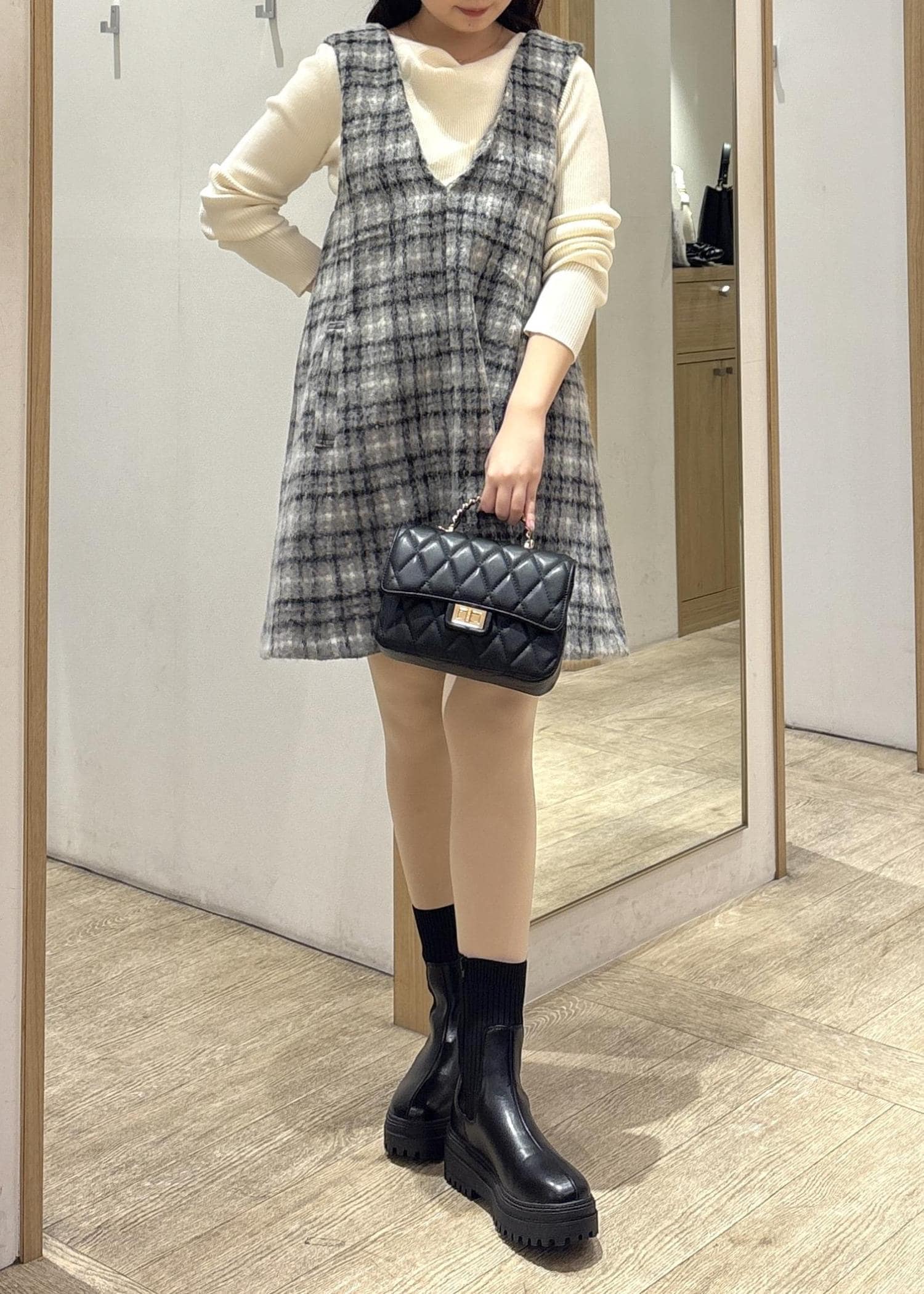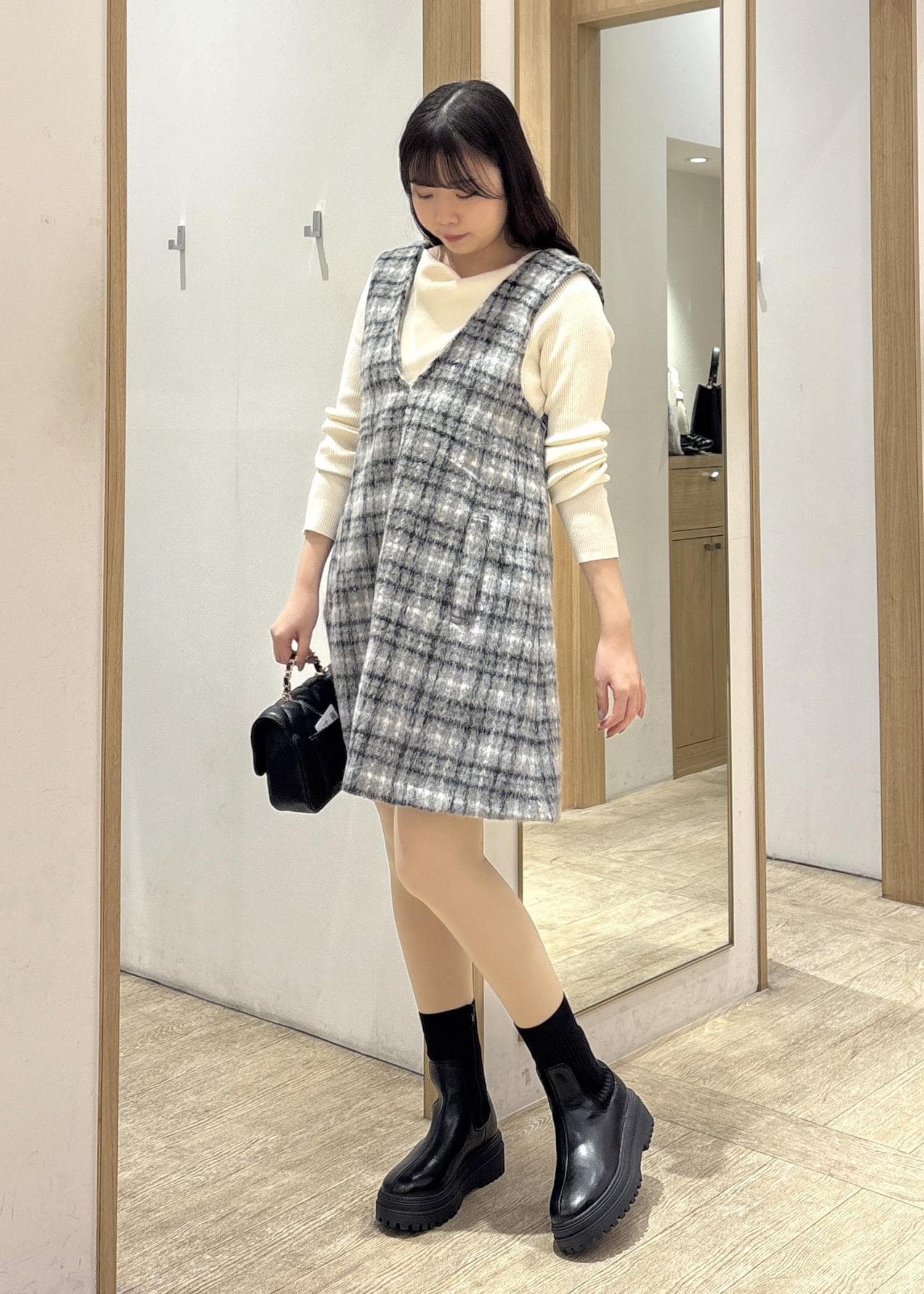 グレーの細かなチェック柄が縦にも横にもニュアンスをつくり、体のラインを拾わずふわっと女らしいシルエットに整えてくれるのが魅力的♪