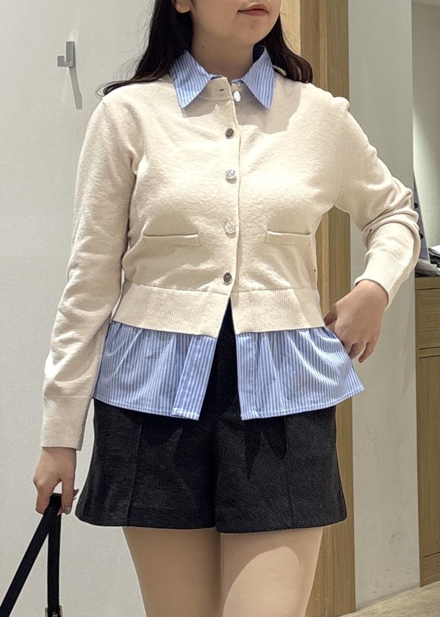ブルーストライプの爽やかさと、ベージュカーディガンの柔らかさが絶妙に合わさり、フレッシュだけど幼くならないスタイルに。
