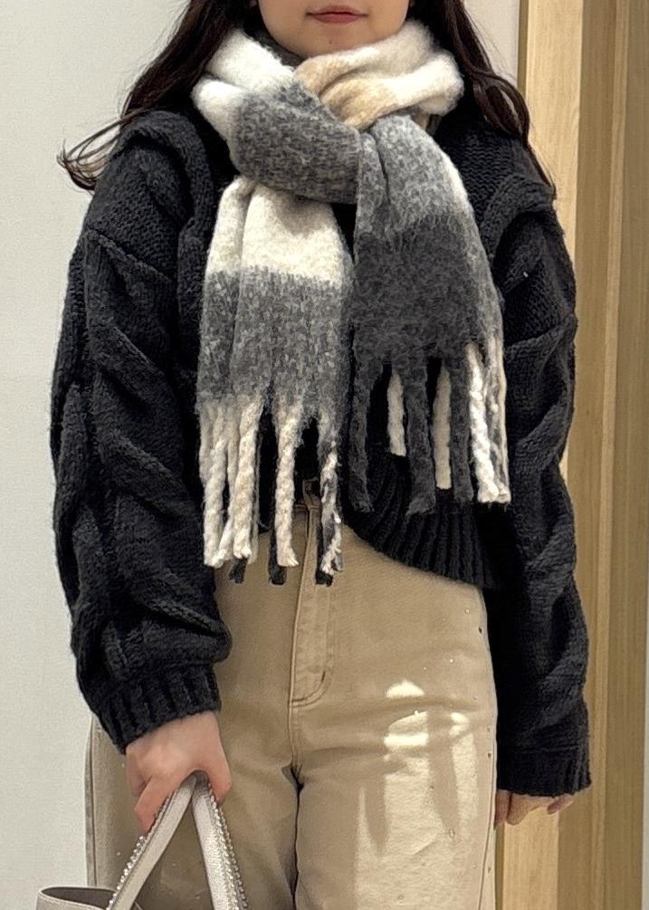 VISふわふわフリンジチェックマフラー/静電気防止チャコール / F¥3,289レビュー長さもほどよくワンループでもラフに垂らしてもバランスがとりやすいです!アウターの形を選ばずデイリーに使える一本です。
