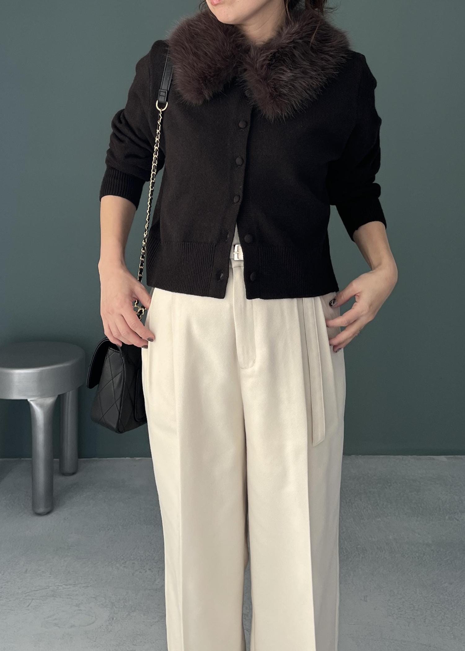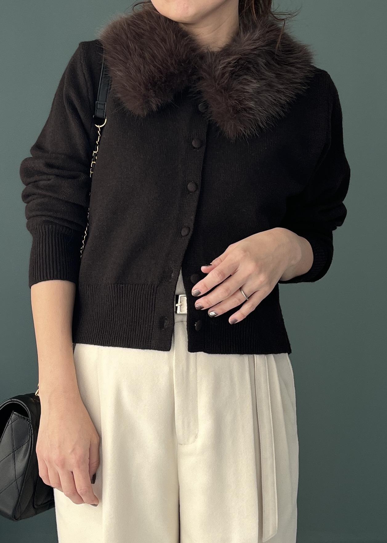 ふわふわのファーカラーが主役になる、冬ならではの上品カーディガンコーデ。