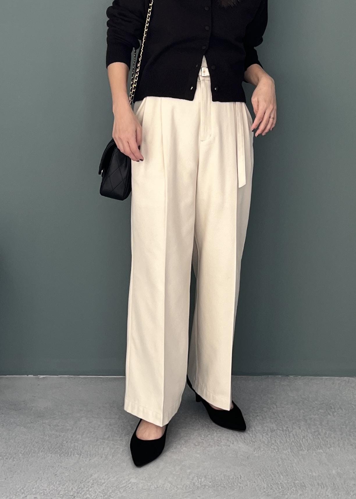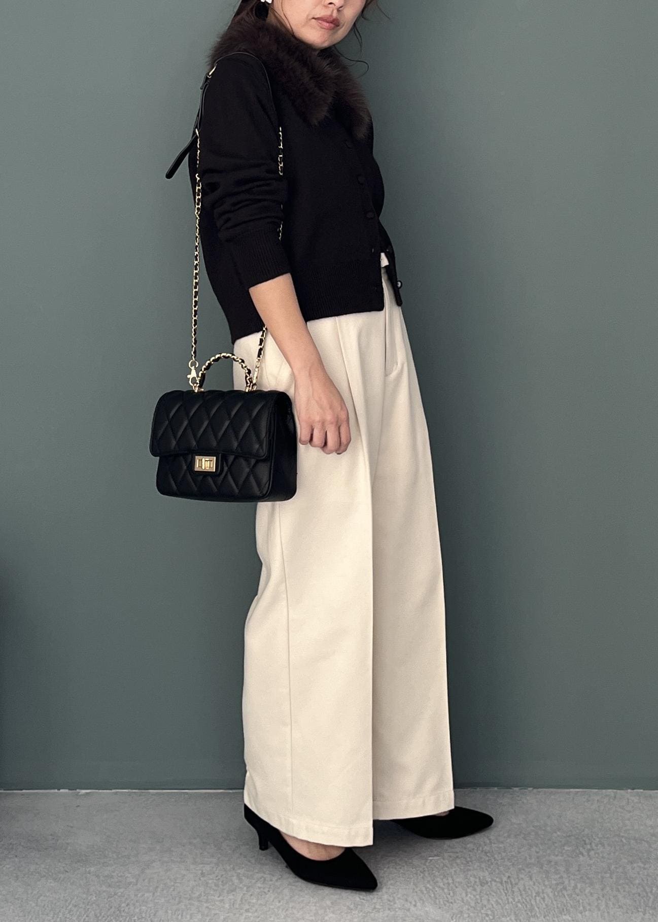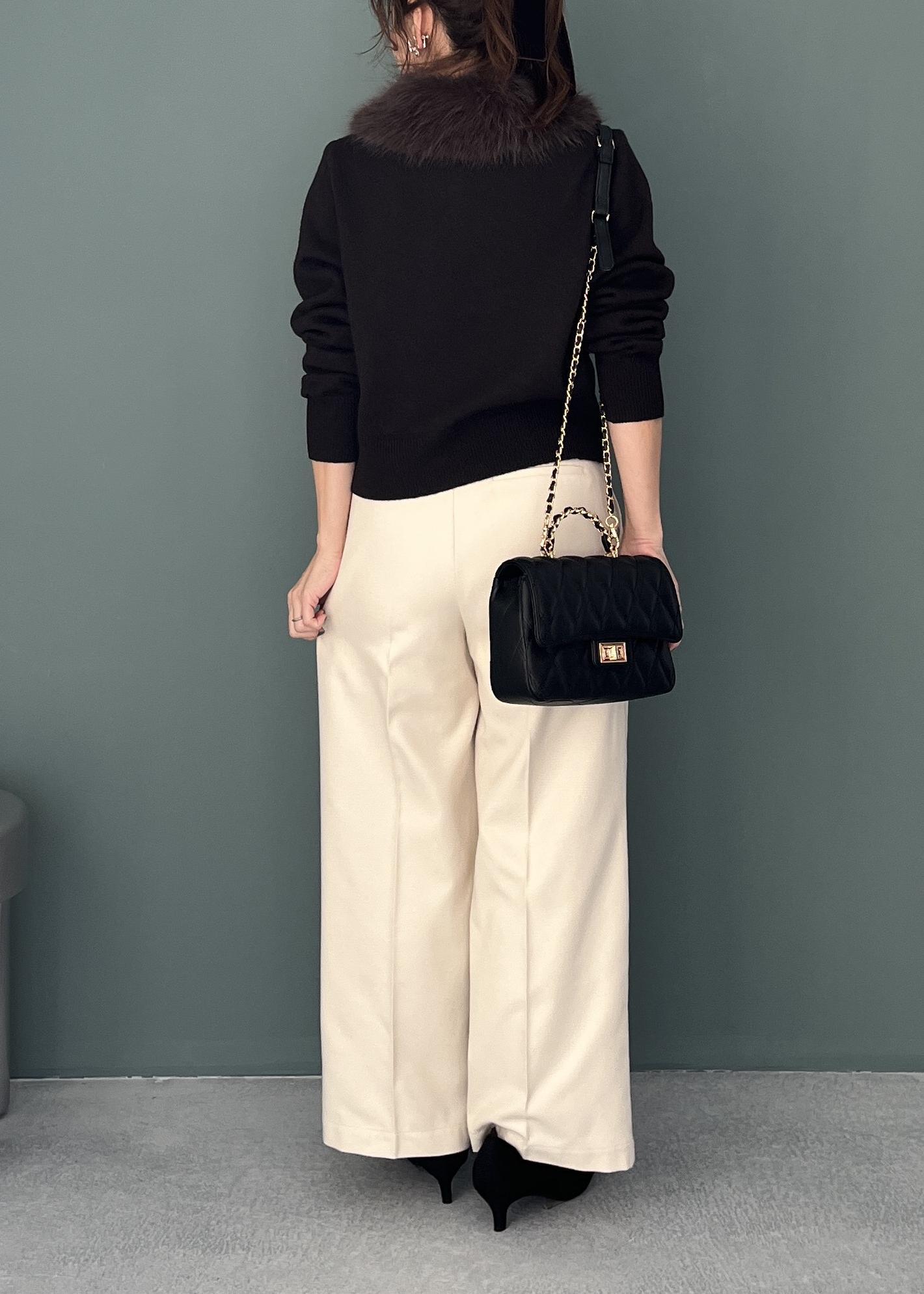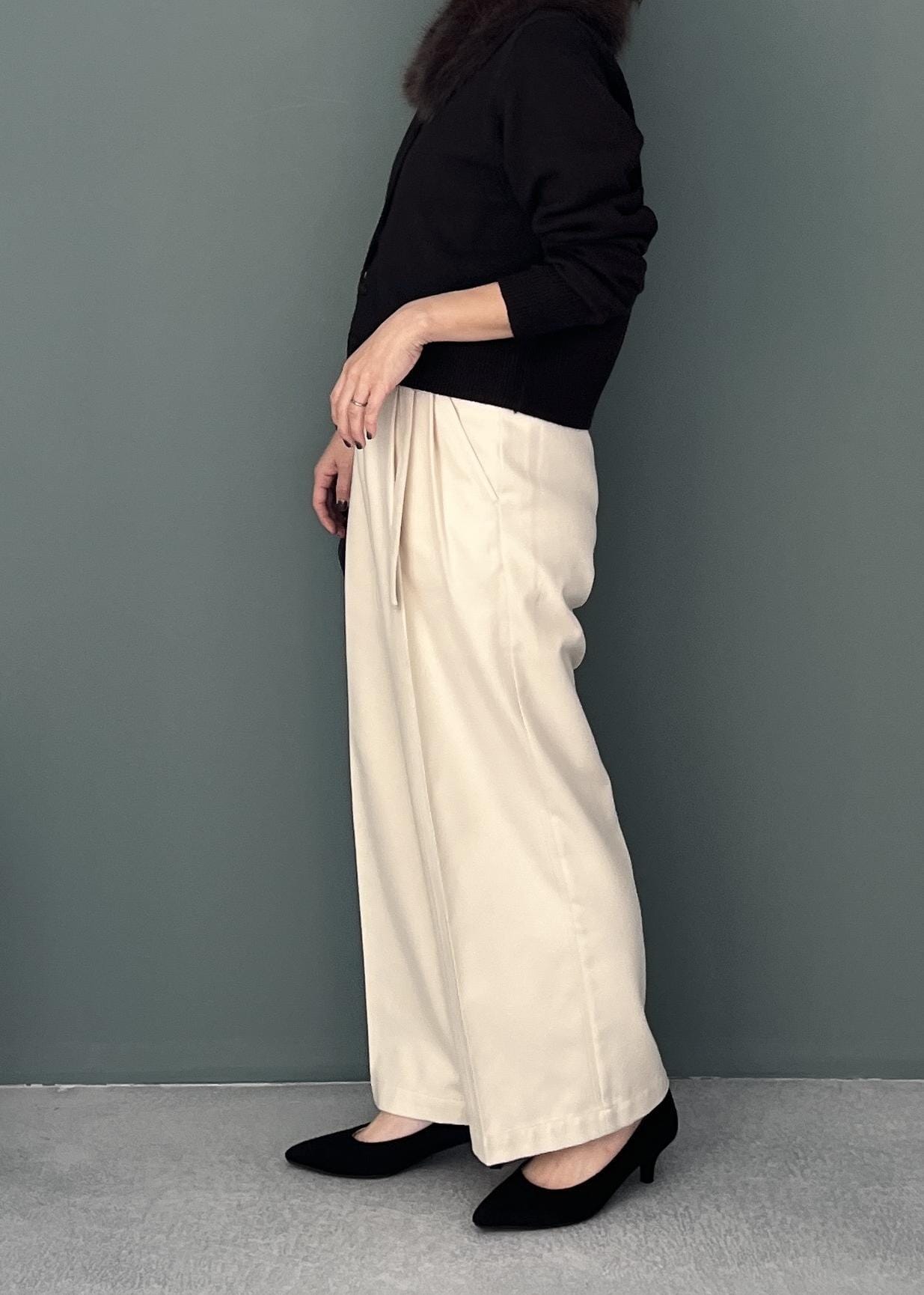 ボトムは落ち感のきれいなアイボリーワイドで、柔らかさと大人っぽさを両立。