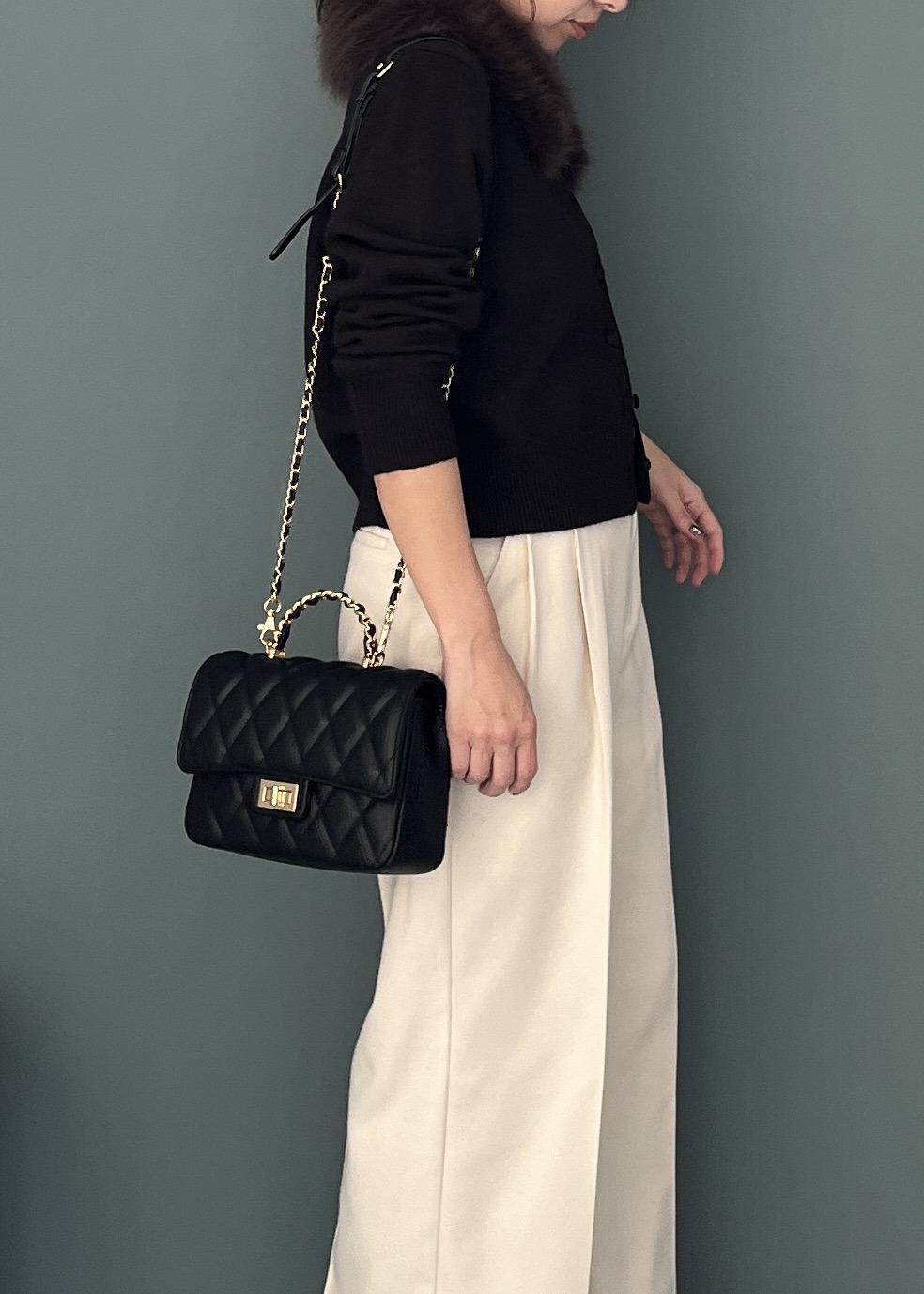 黒小物で引き締めることで、甘くなりすぎず“きちんと感”をキープできます。