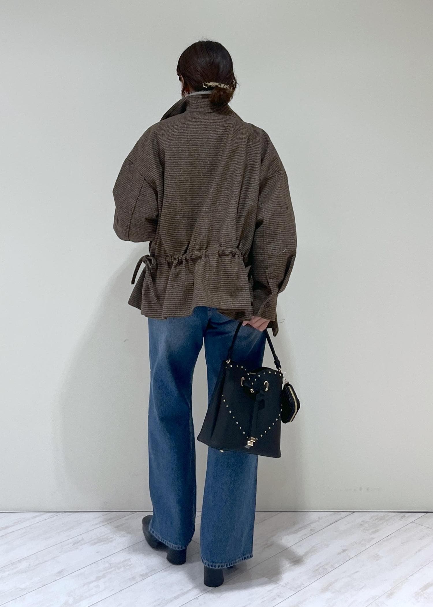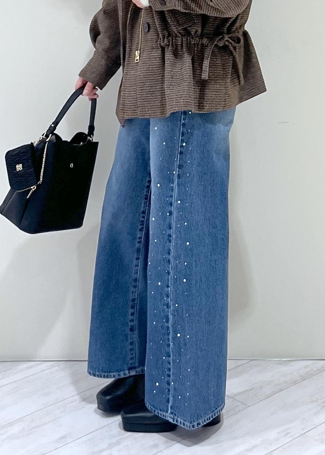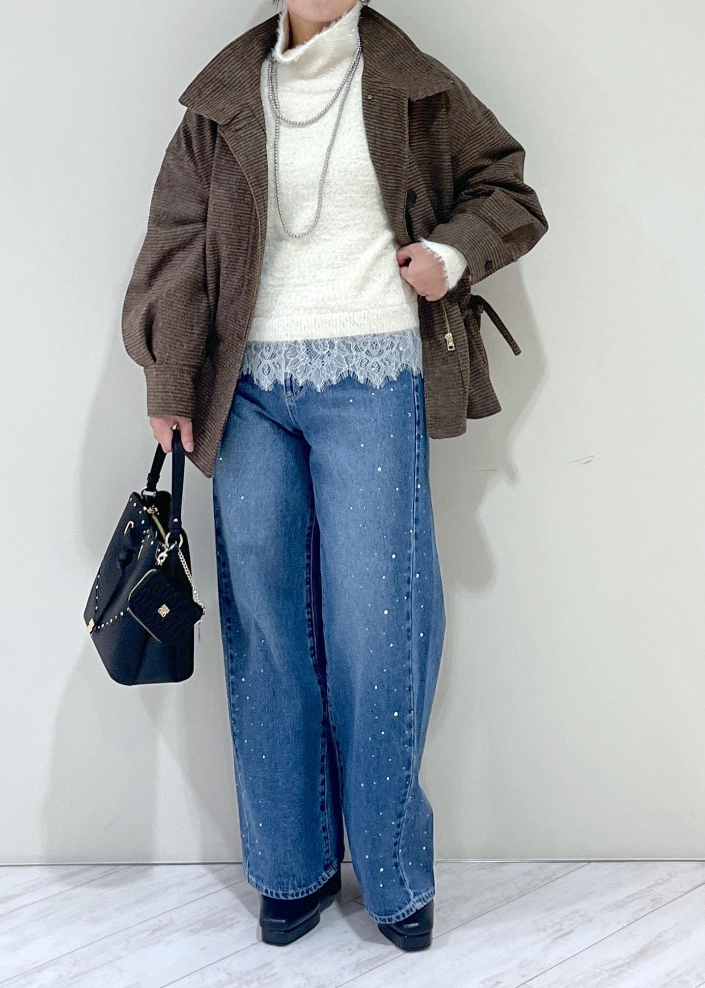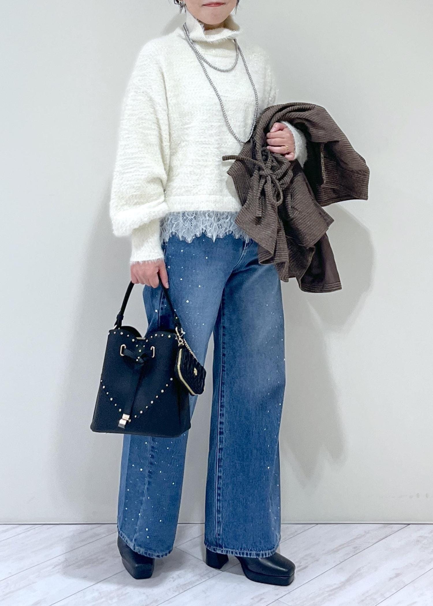 ラメの効いた華やかなニットにさりげないラインストーンデニムを合わせました。