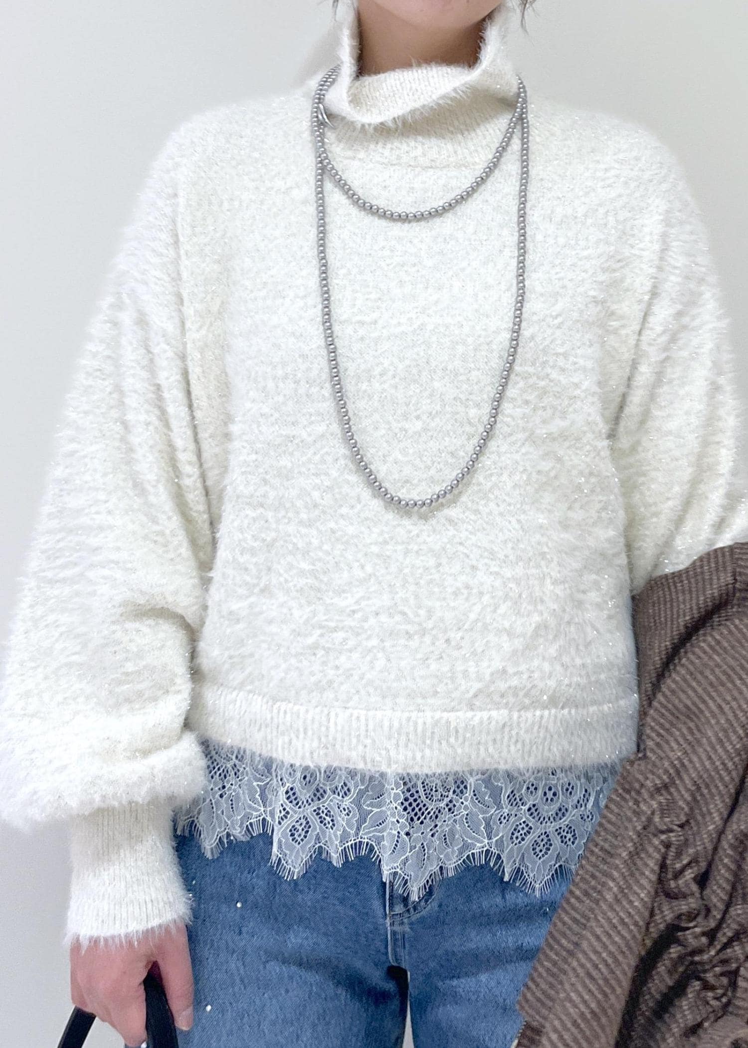 ラメがキラキラに効いていて、裾のレースが女っぽくて一枚で華やかなニットです。 -