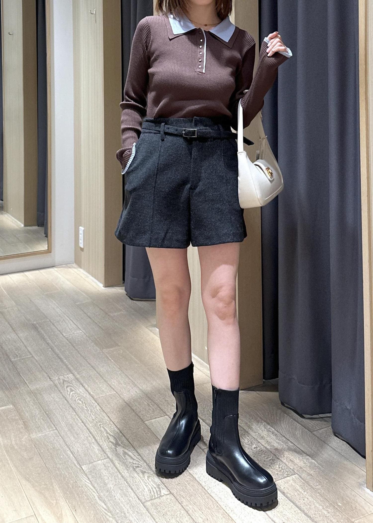 厚底なのとニット切り替えのデザインなので、脚長効果のあるブーツ。クッション性もありとっても履きやすいです。