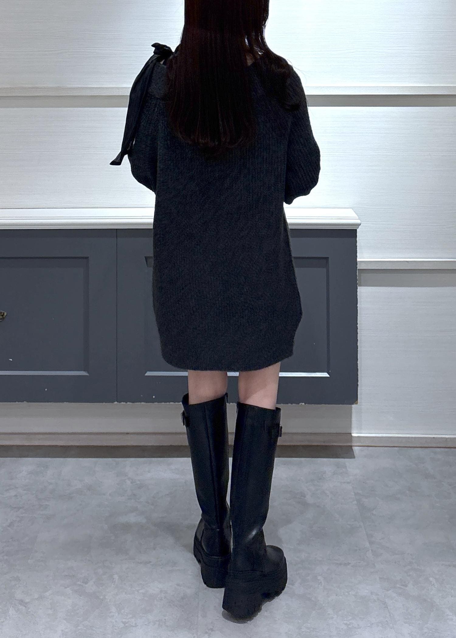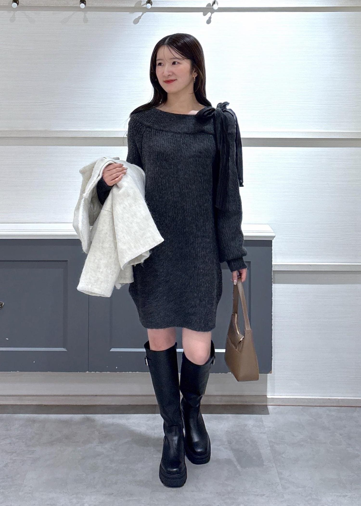 VIS肩リボンミニ丈ニットワンピース/2WAYグレー / F¥7,909レビュー156cmで膝上5cmくらいの丈感でした!