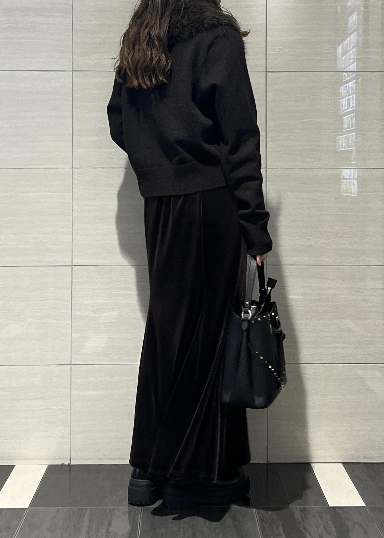 落ち感のあるベロア素材で、シルエットがとてもきれいでほどよいフィット感でラインを拾いすぎず、すっきり見えます。 -