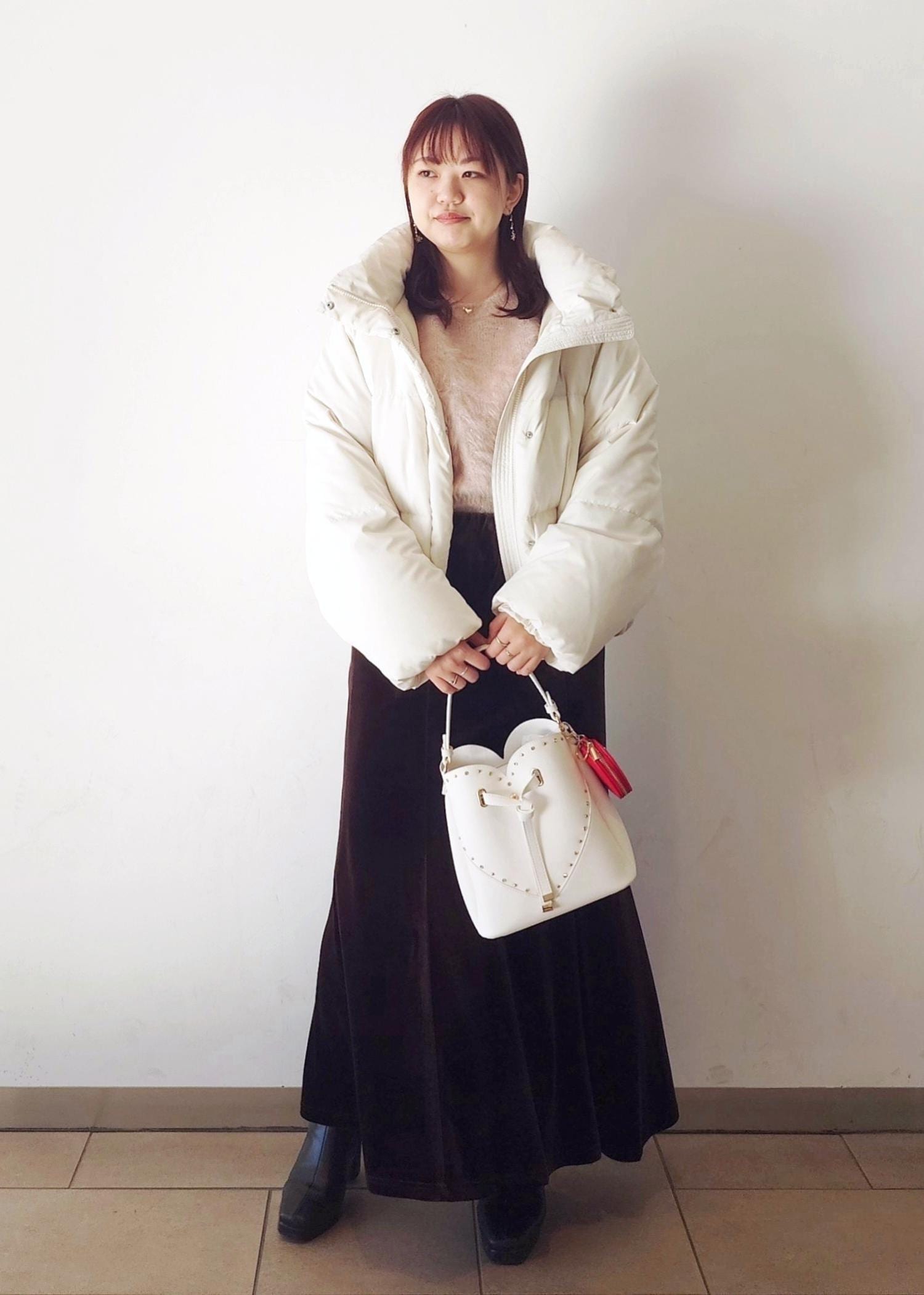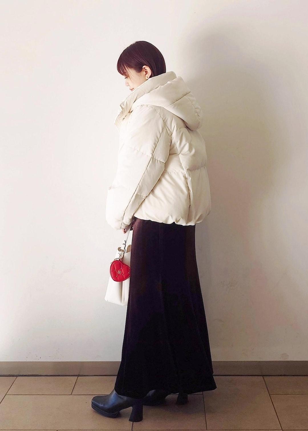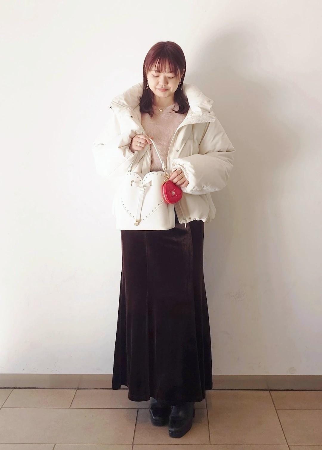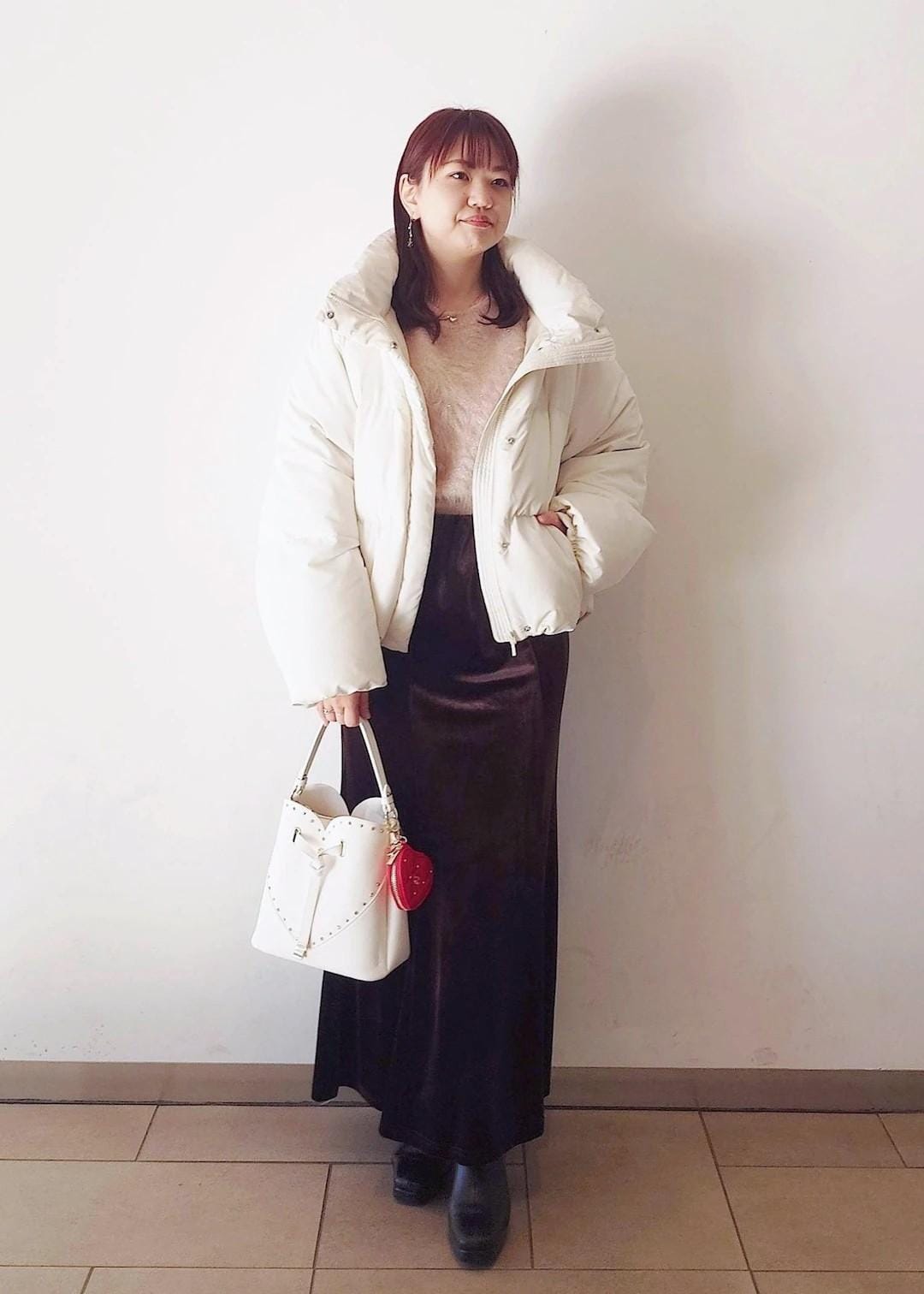 カジュアルになりがちなダウンは綺麗なシルエットのスカートと合わせて女性らしく。