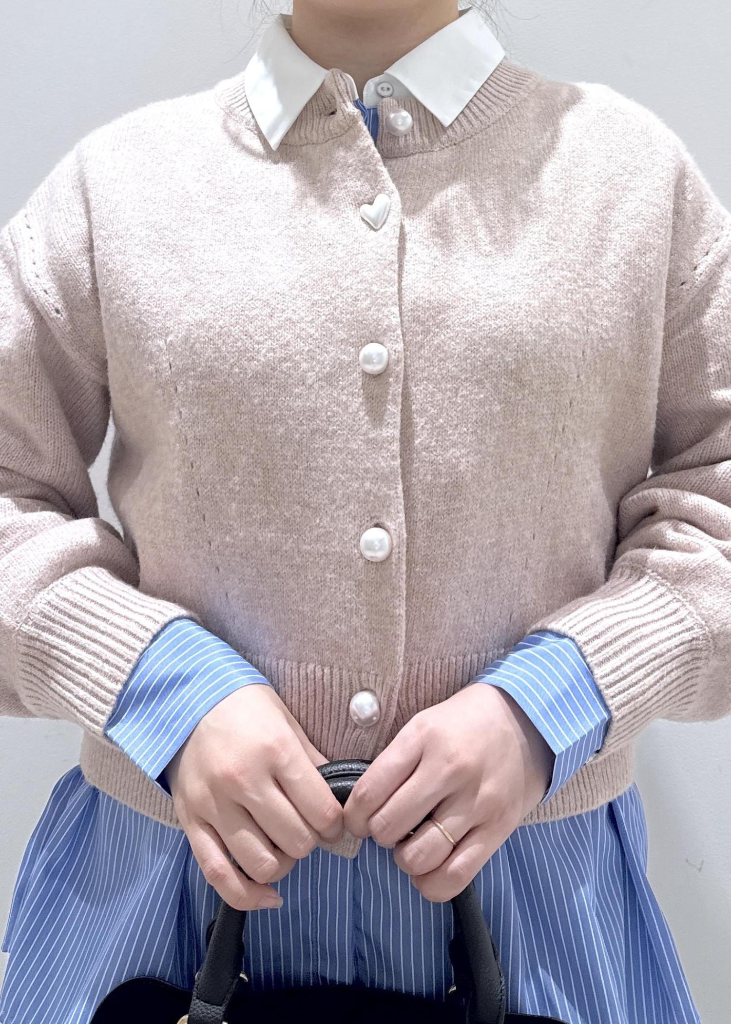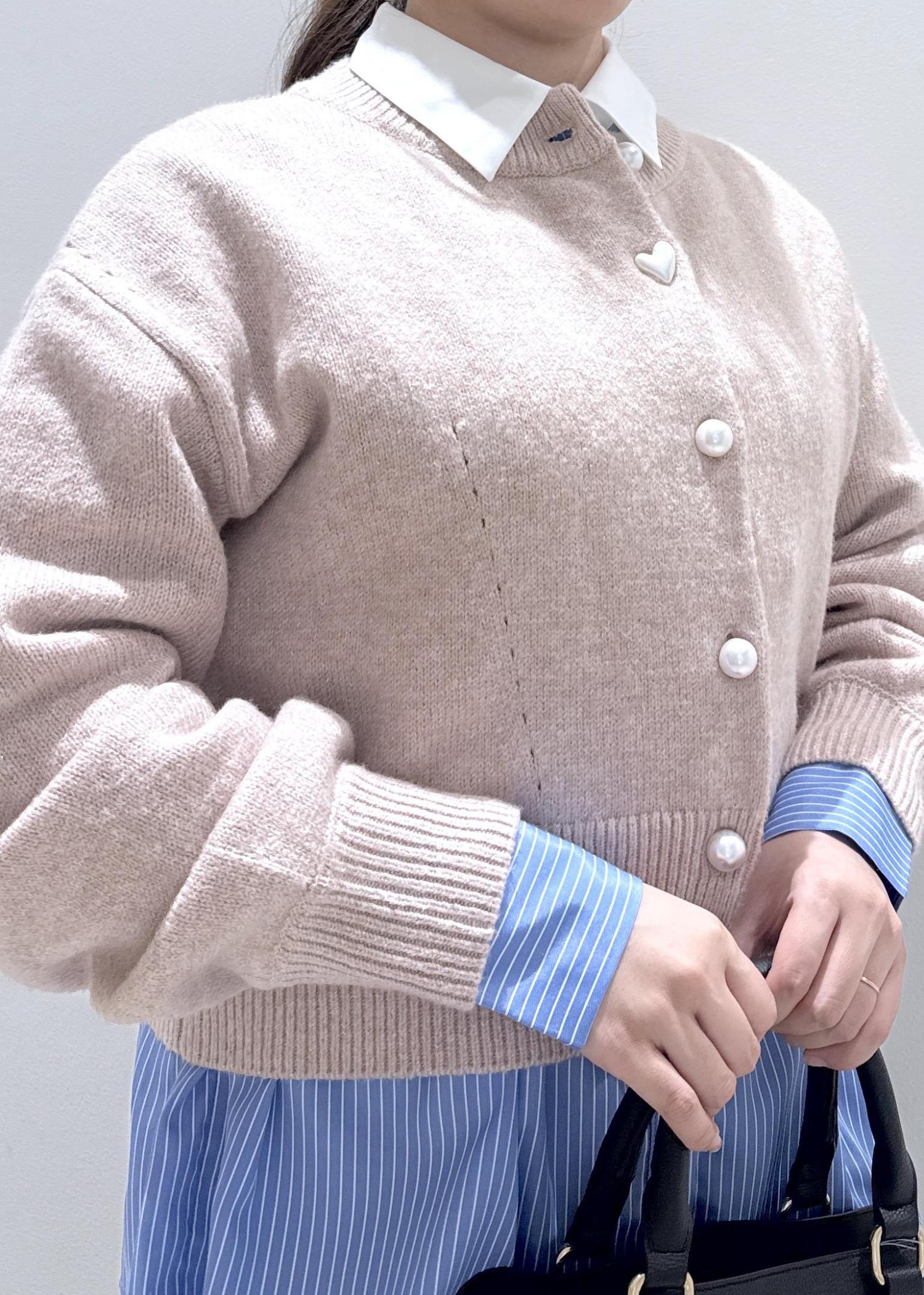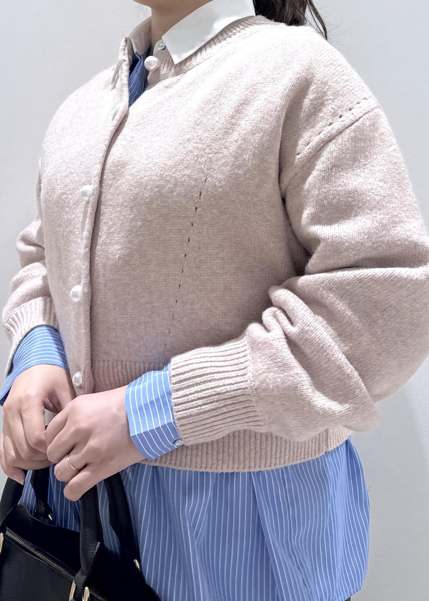 今回はVISで大人気なパールボタンカーディガンに、シャツと合わせて重ね着をしたコーディネートにしてみました。