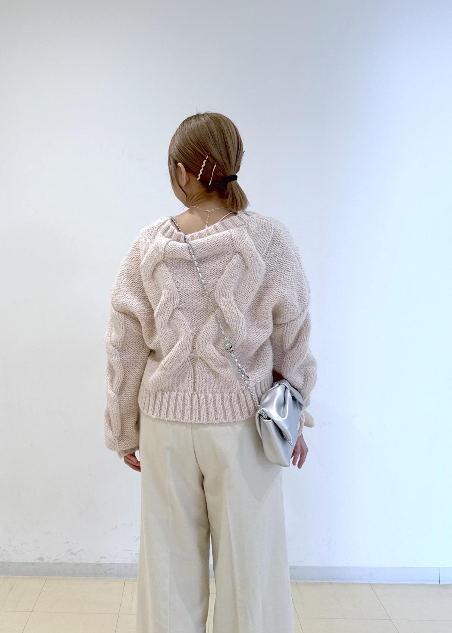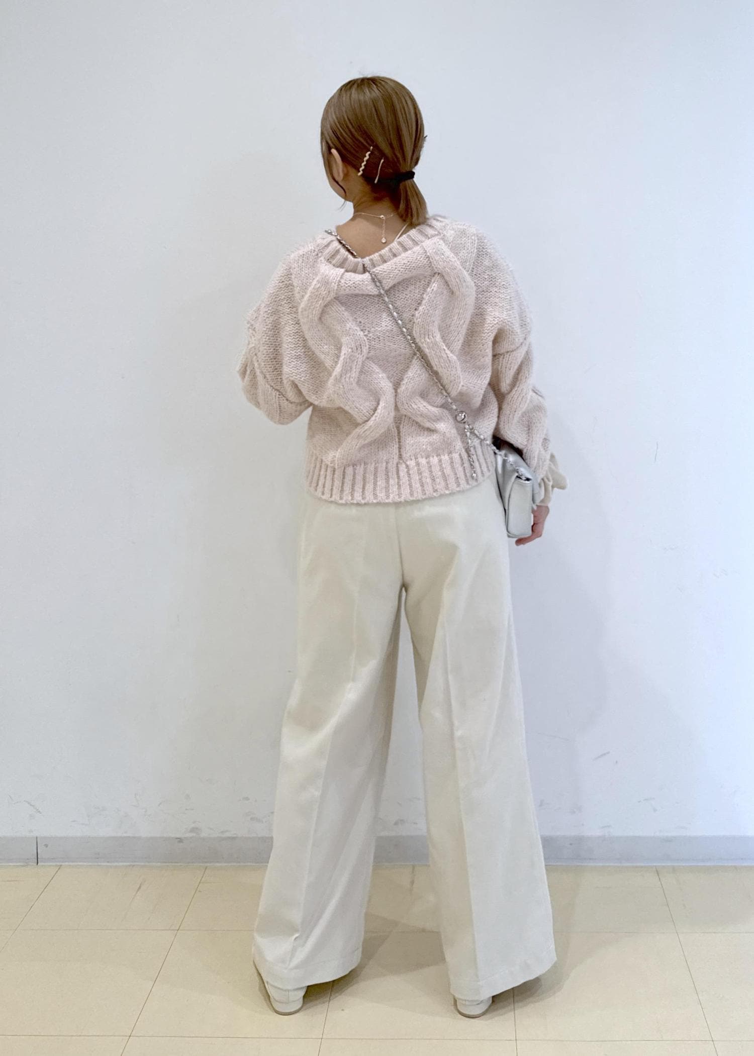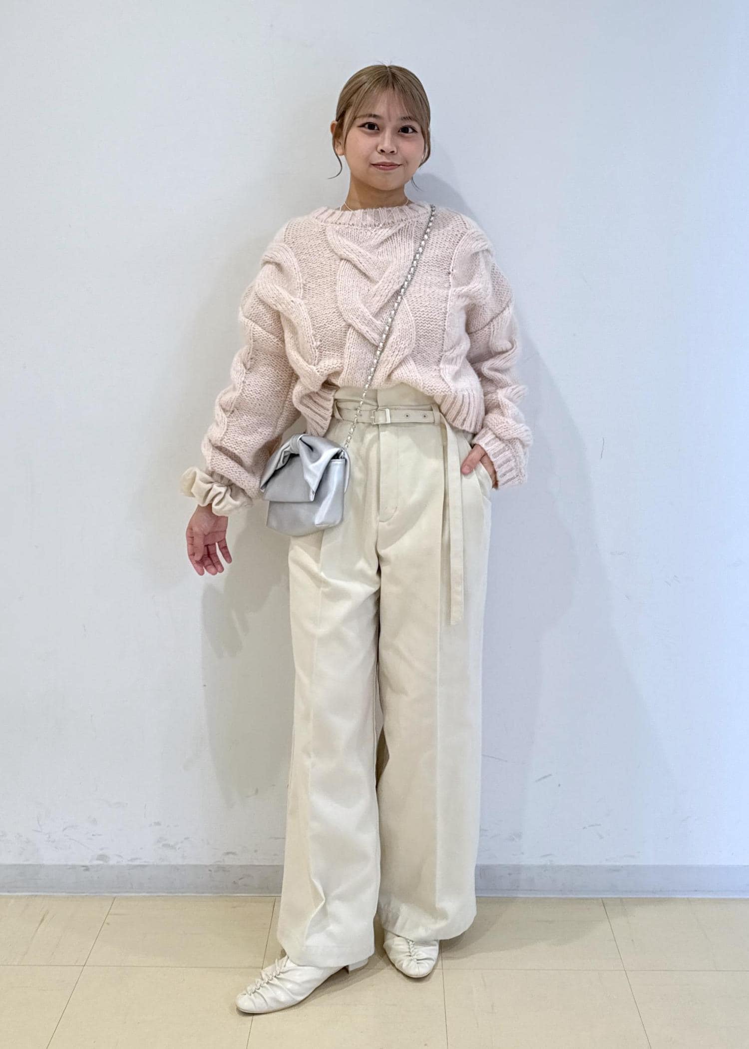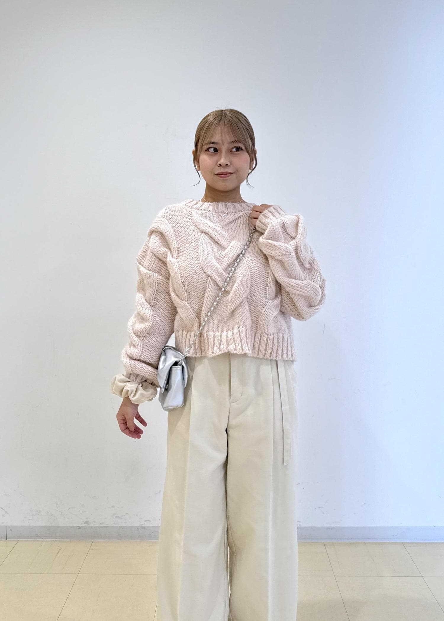 スッキリした丈感なのでレイヤードも楽しめますが、ざっくりとしたケーブル柄なので1枚でも着映えします! -