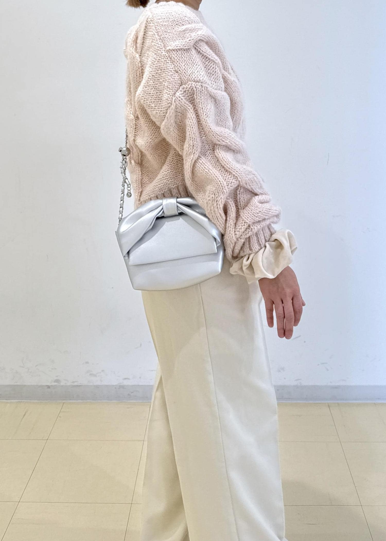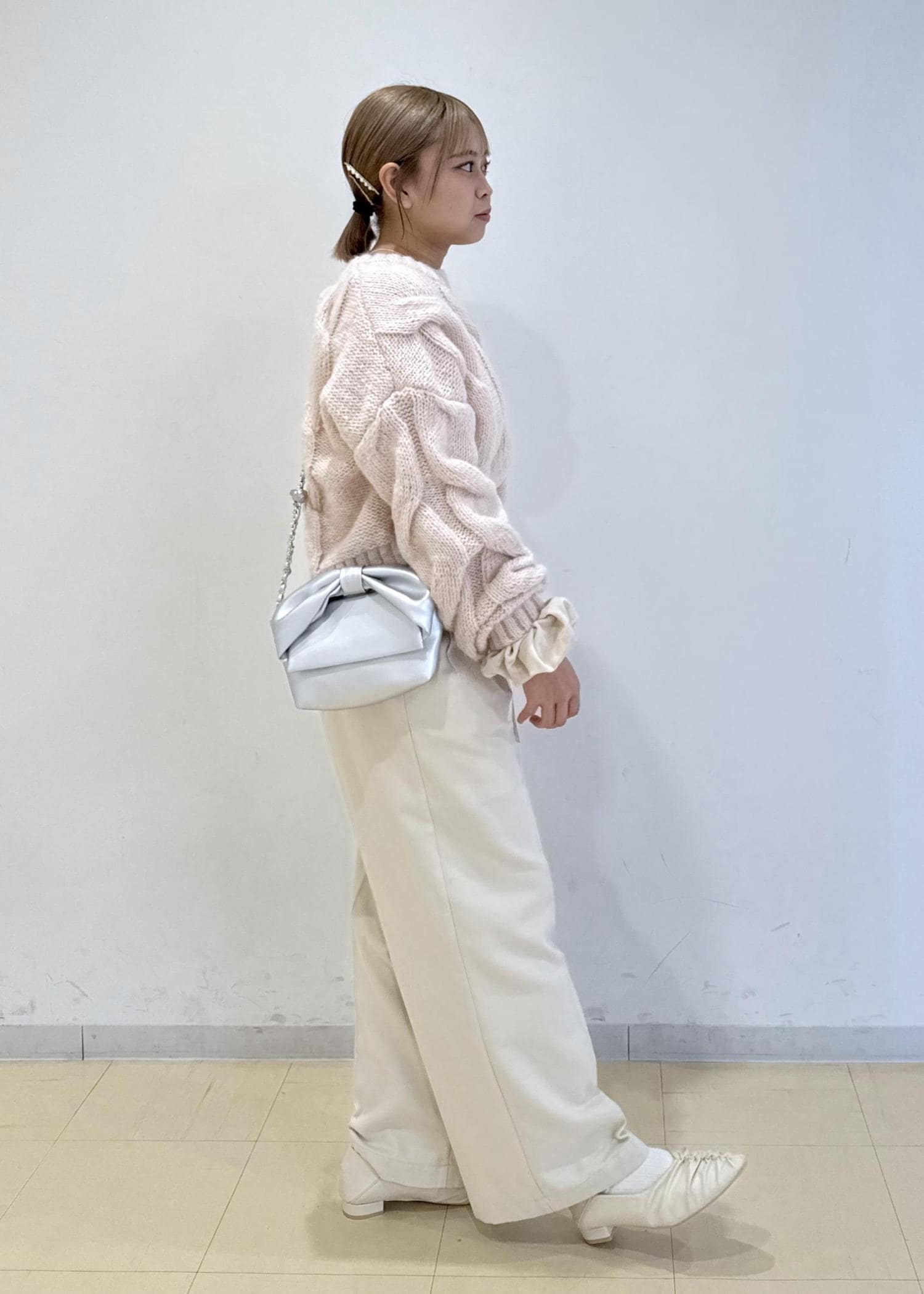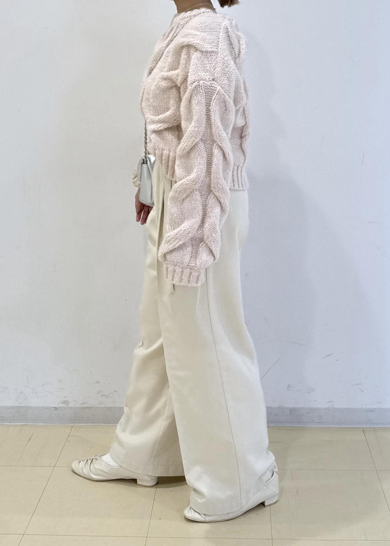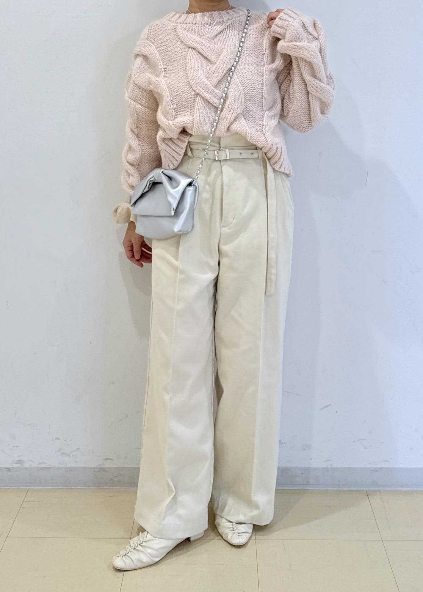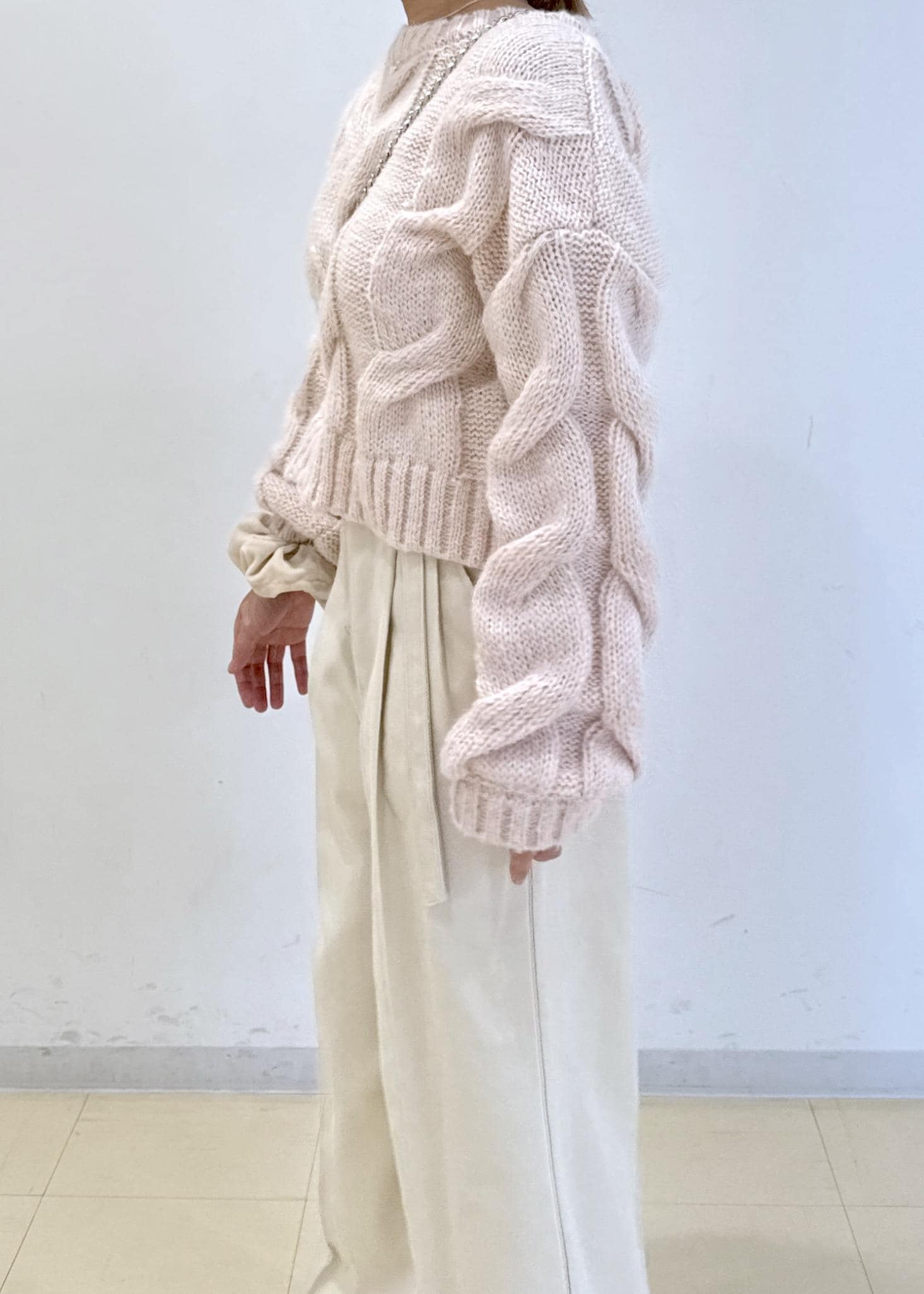 スッキリした丈感なのでレイヤードも楽しめますが、ざっくりとしたケーブル柄なので1枚でも着映えします! -