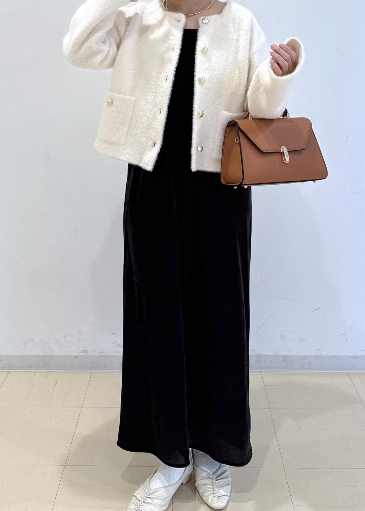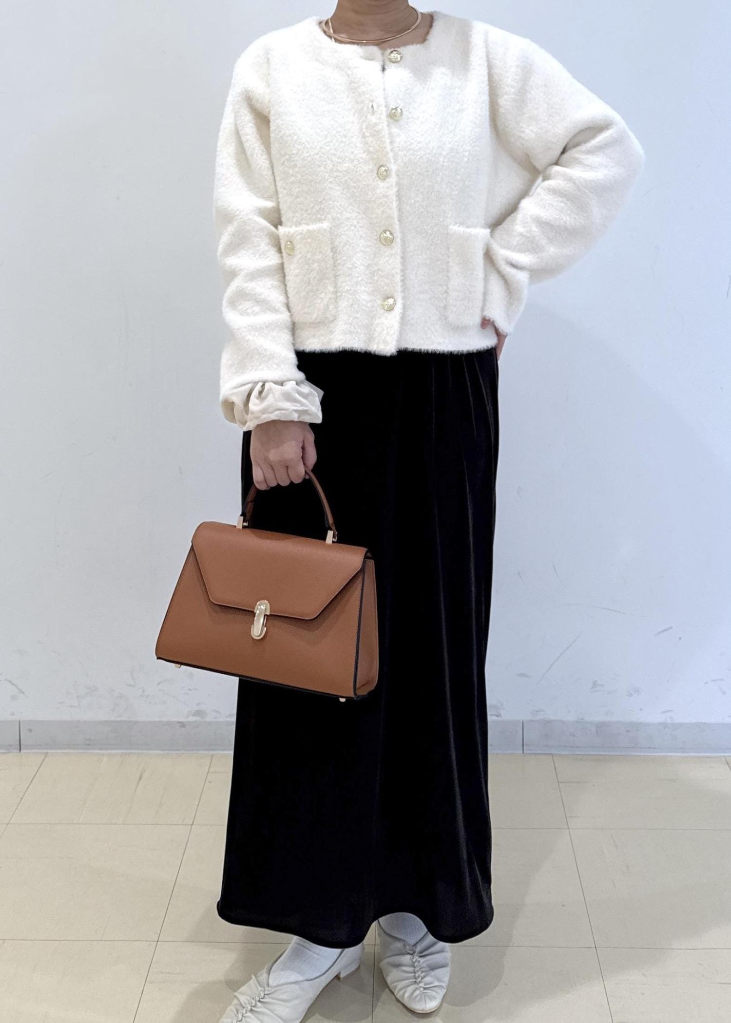 ベロアのキャミワンピにきちんと見えするカーディガンを合わせ、ディナーにも着ていけるような大人キレイめコーデにしました♩