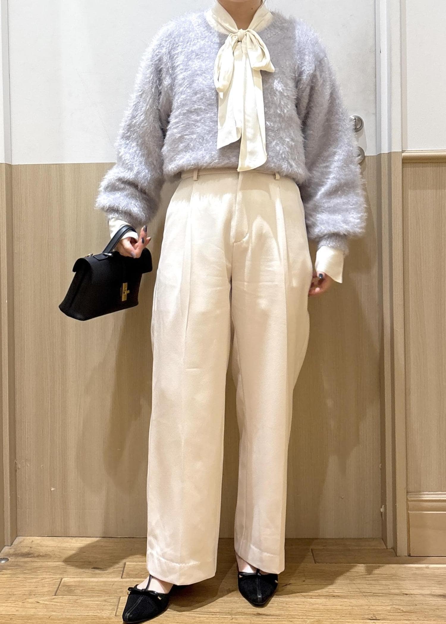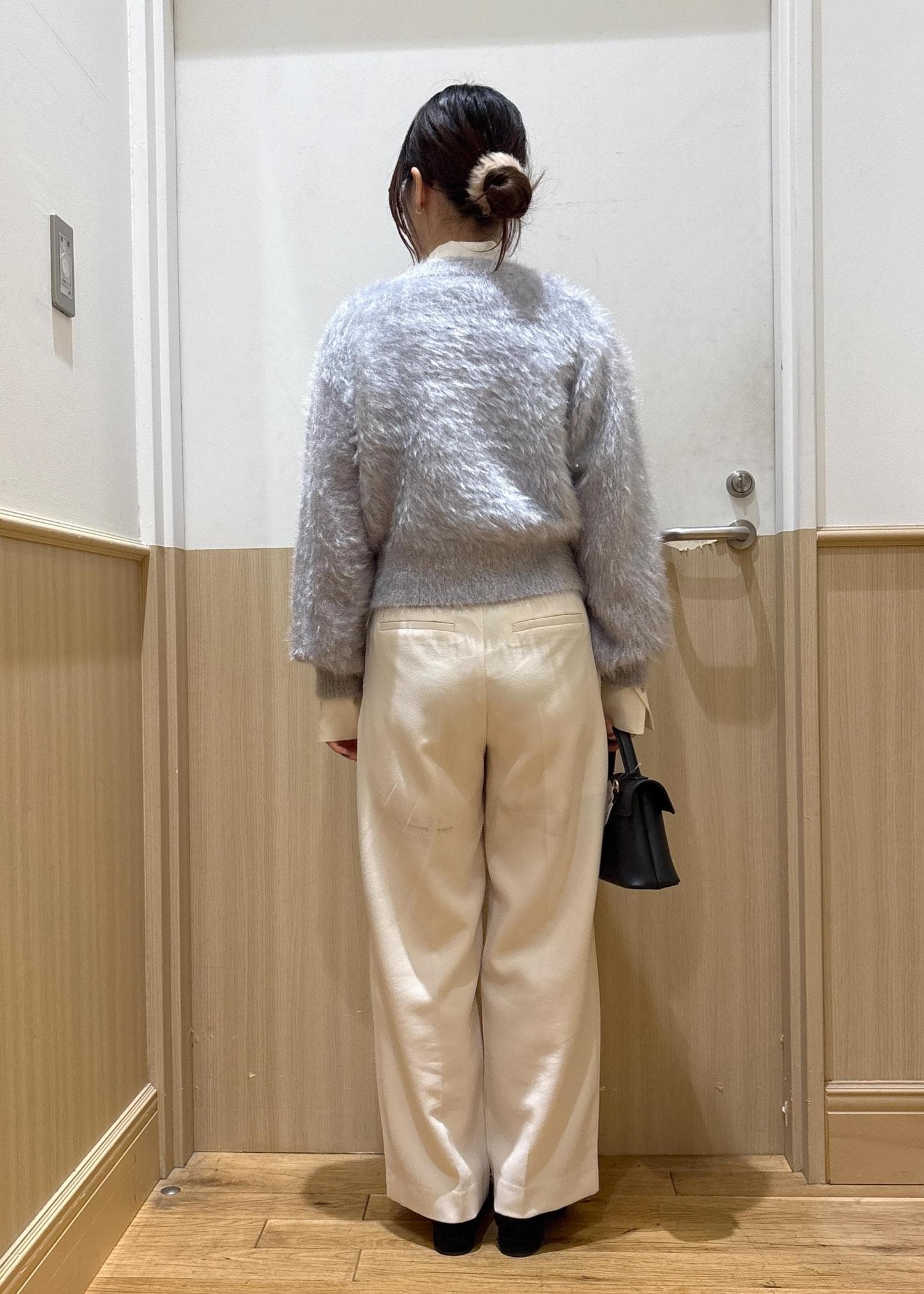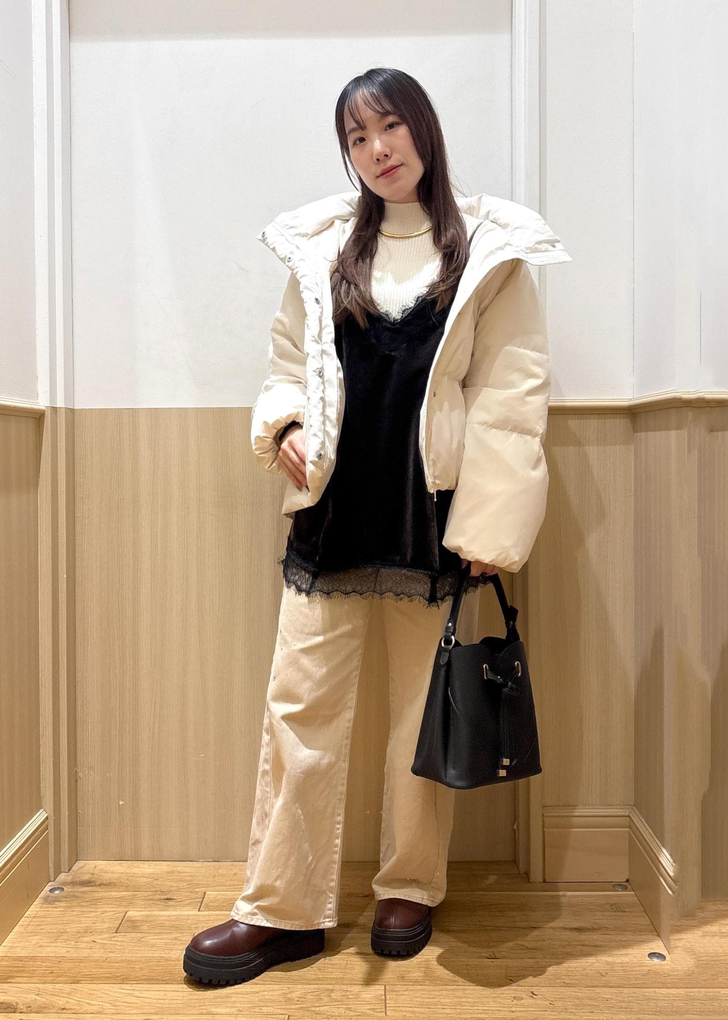 着用しているホワイトは、少し透けがあるので同色インナーで合わせていただくのがオススメです。 -