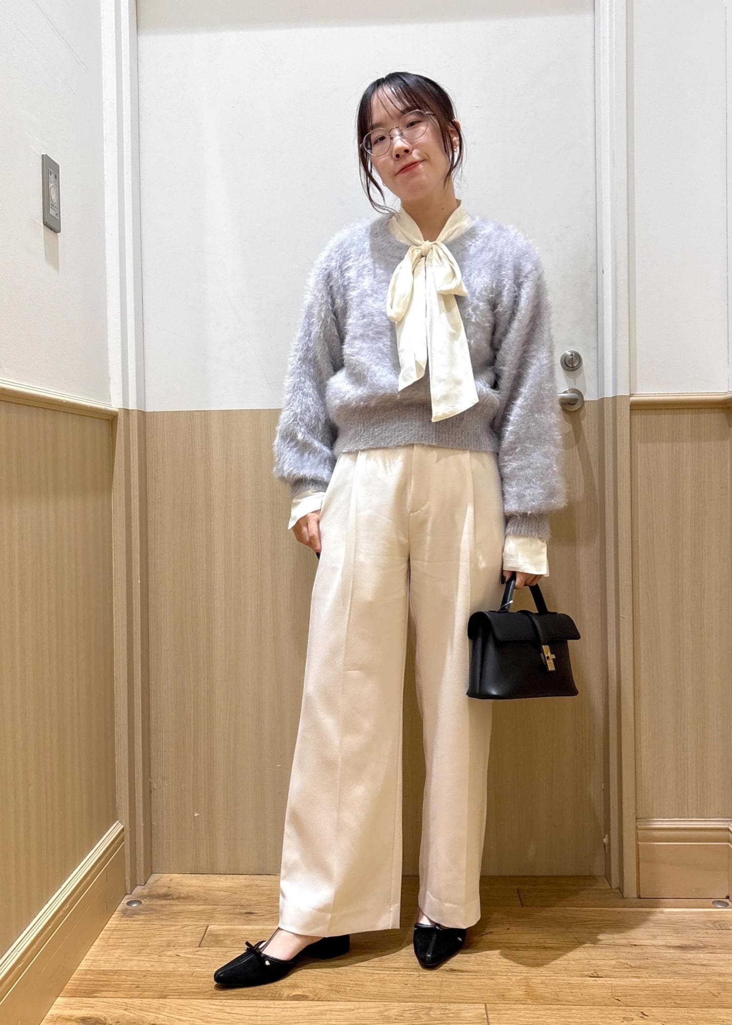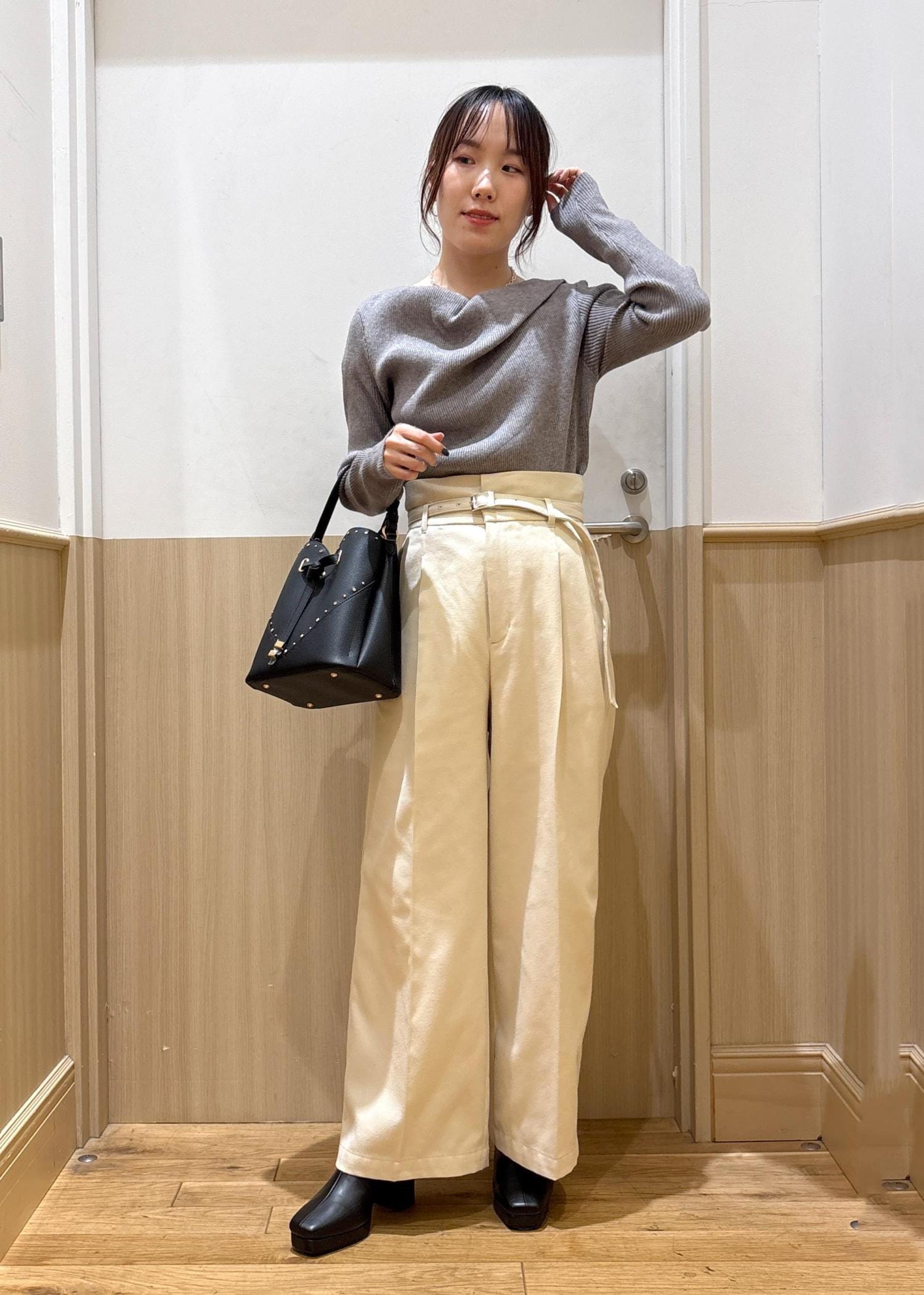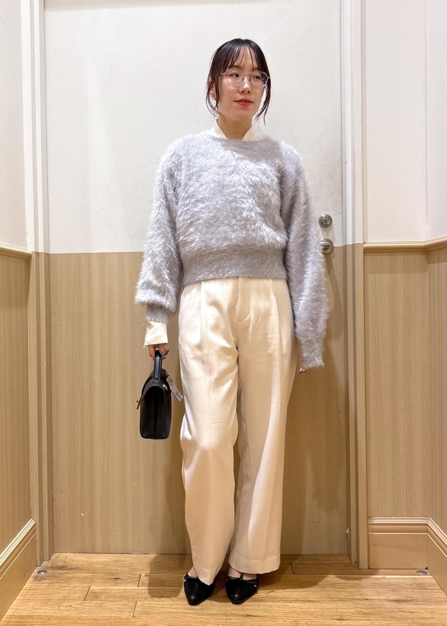 着用しているホワイトは、少し透けがあるので同色インナーで合わせていただくのがオススメです。 -