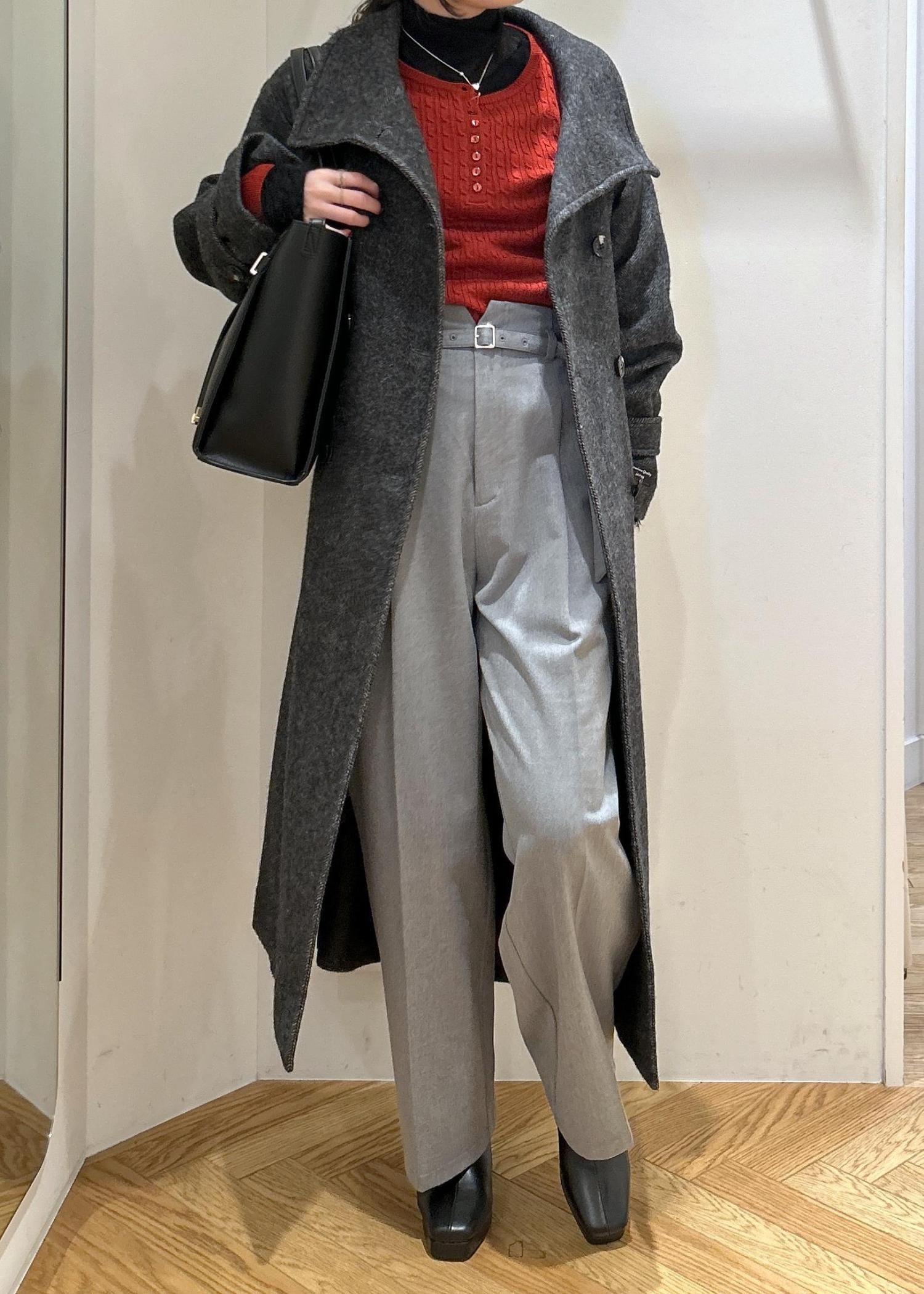 伸縮性があり、シャツやハイネックトップスとのレイヤードも相性が良いです◎