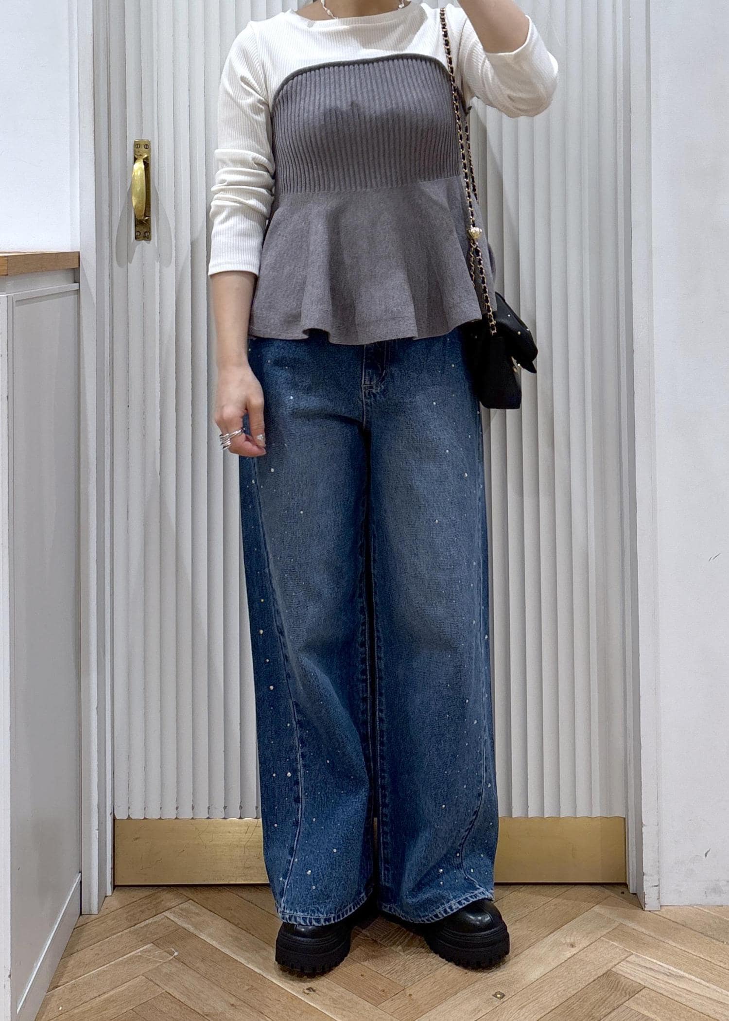 程よく肉厚なドッキングプルオーバー。1枚で着映えするので楽ちんなニット。ワントーンで綺麗めに合わせてもセットアップのような着方も可愛いです。お尻にかかる着丈で安心のサイズ感でした。身体のラインも拾わないのでストレスフリーなニットです。