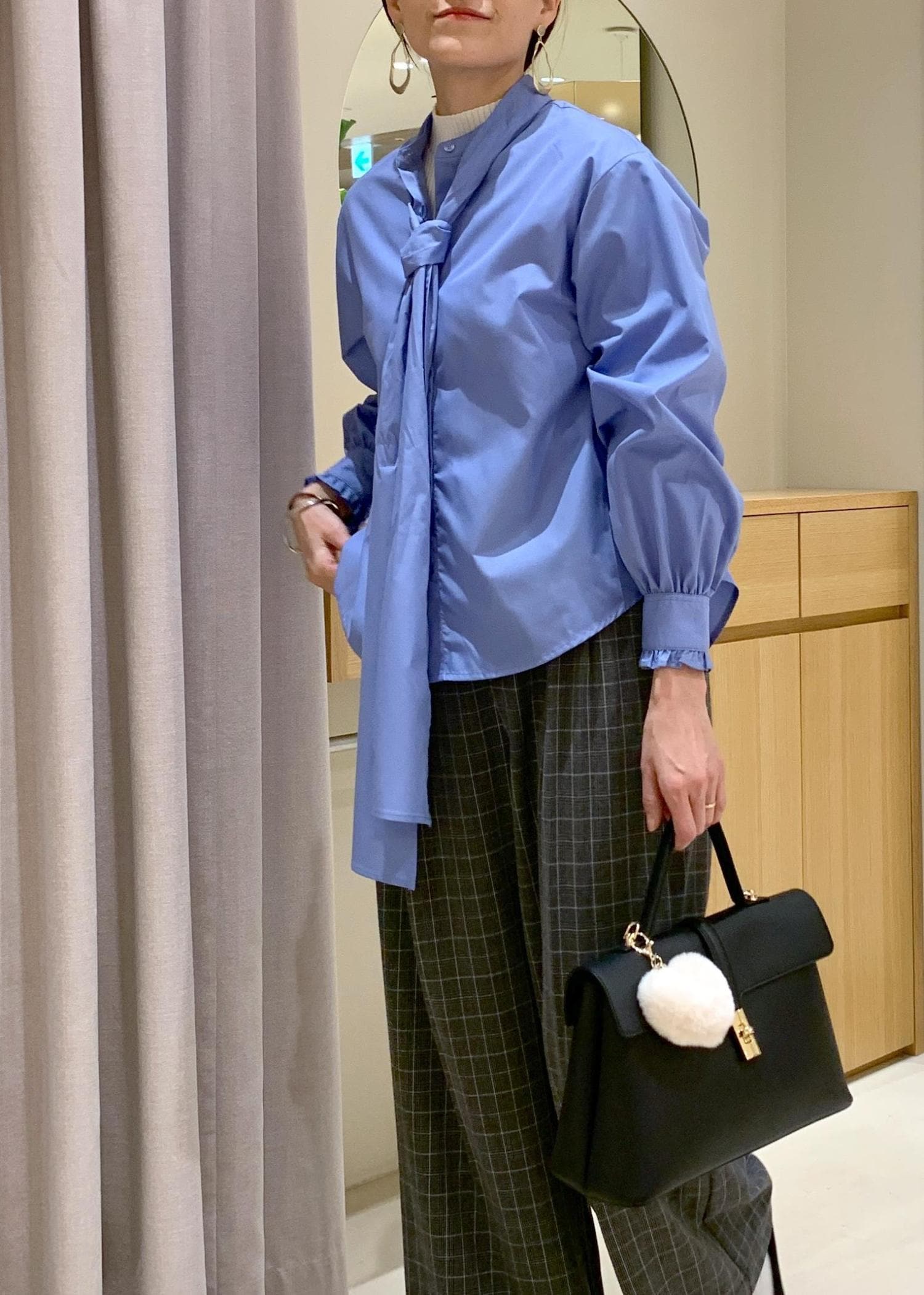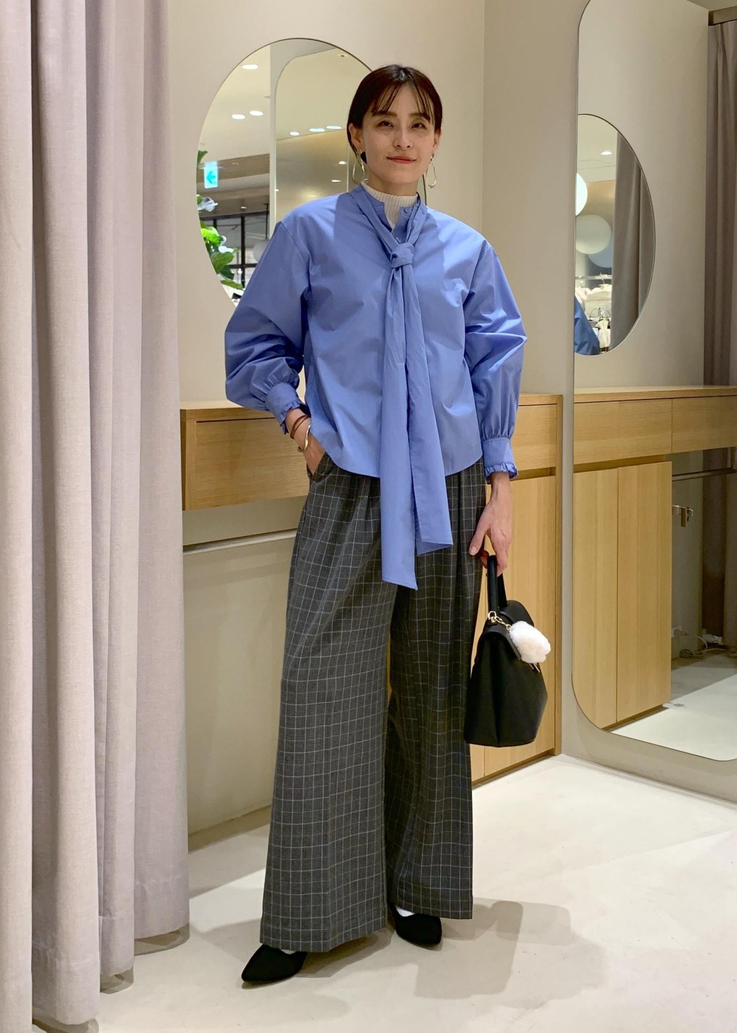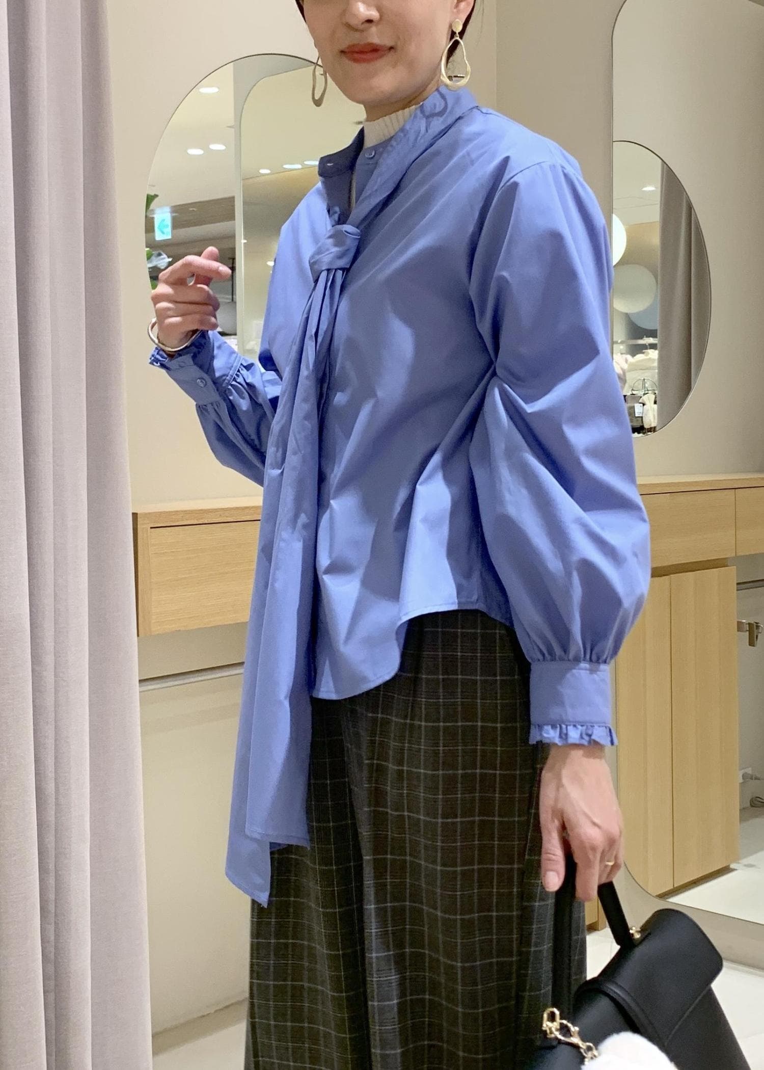VISチェック&デニムアソートボウタイリボン付きスタンドカラーシャツサックス / F¥6,589レビュー程よいハリ感と柔らかさがあり、堅苦しくなく着用できますよ。透け感は気になりませんでした。