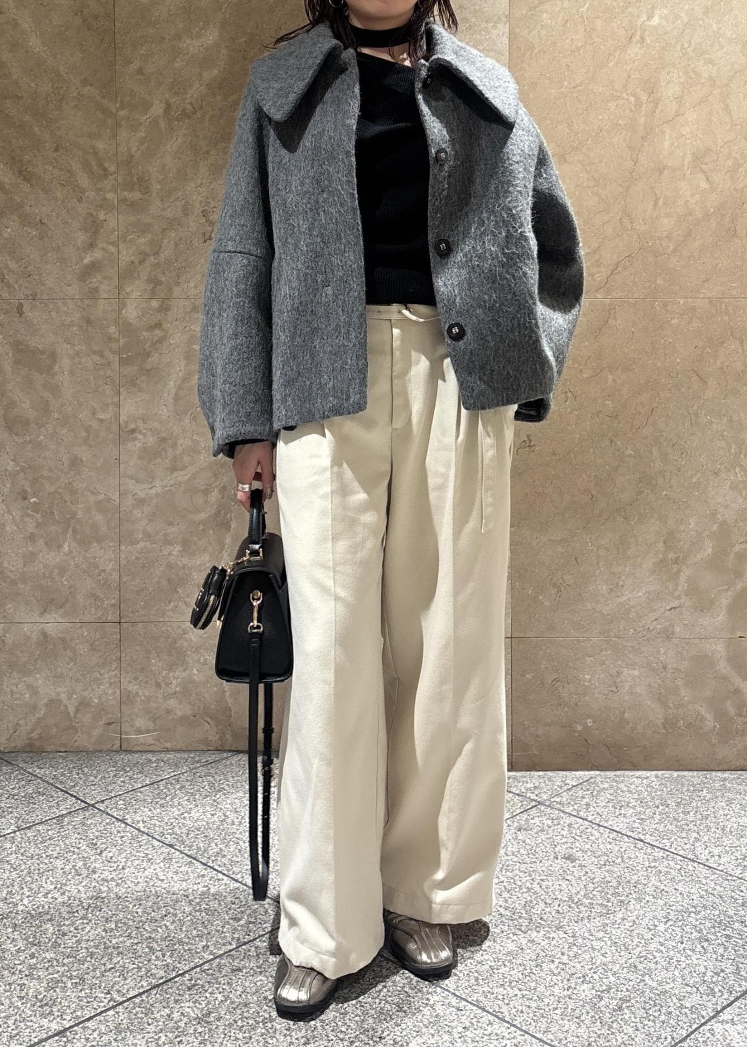VIS起毛ウールライク版ベルトディテールタックワイドパンツキナリ / M¥6,589レビューベルトをおへその位置でしっかりハイウエストで履くと足首が出る丈ですが、へそ下で履いてもシルエットが崩れなかったので、敢えて腰で落として着丈長めに着用しています。
