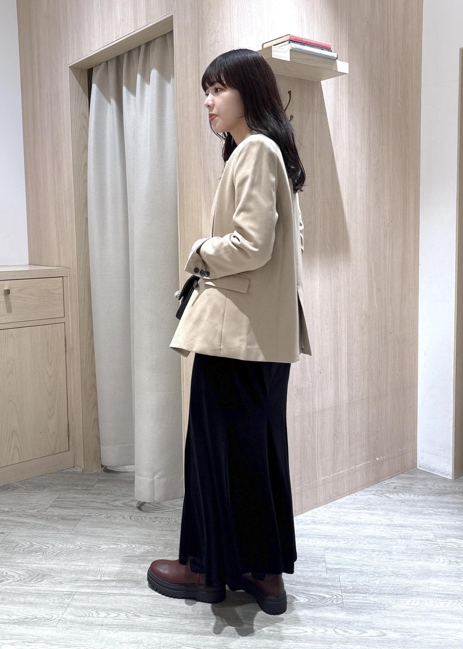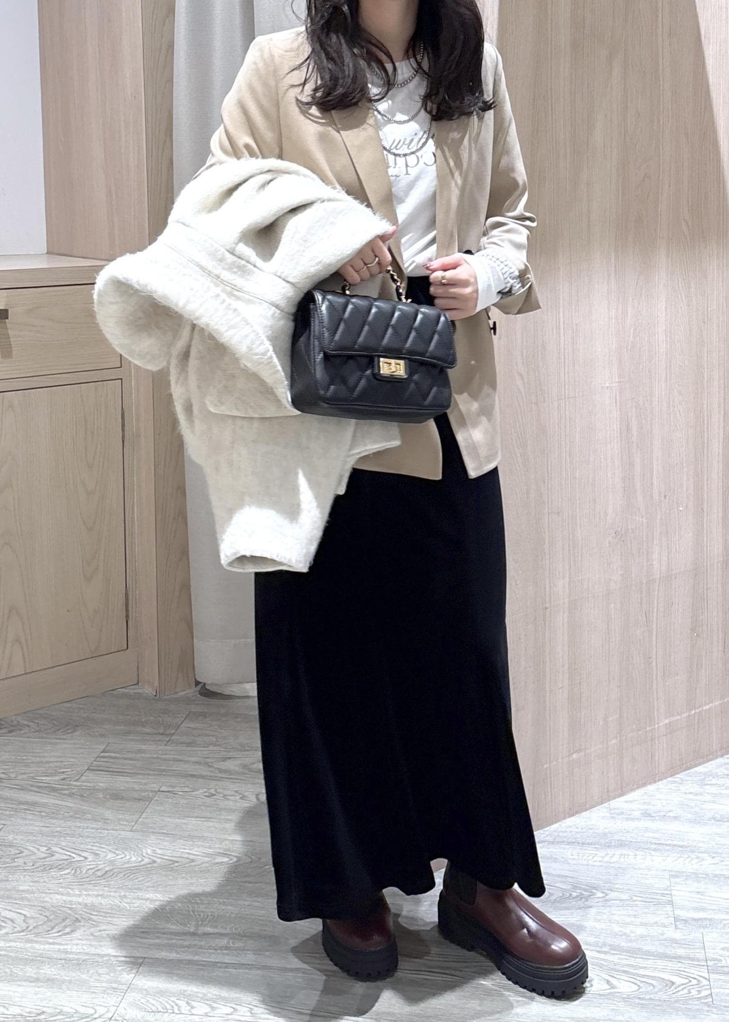 ベージュジャケットに流行りのベロアスカートを合わせました♪