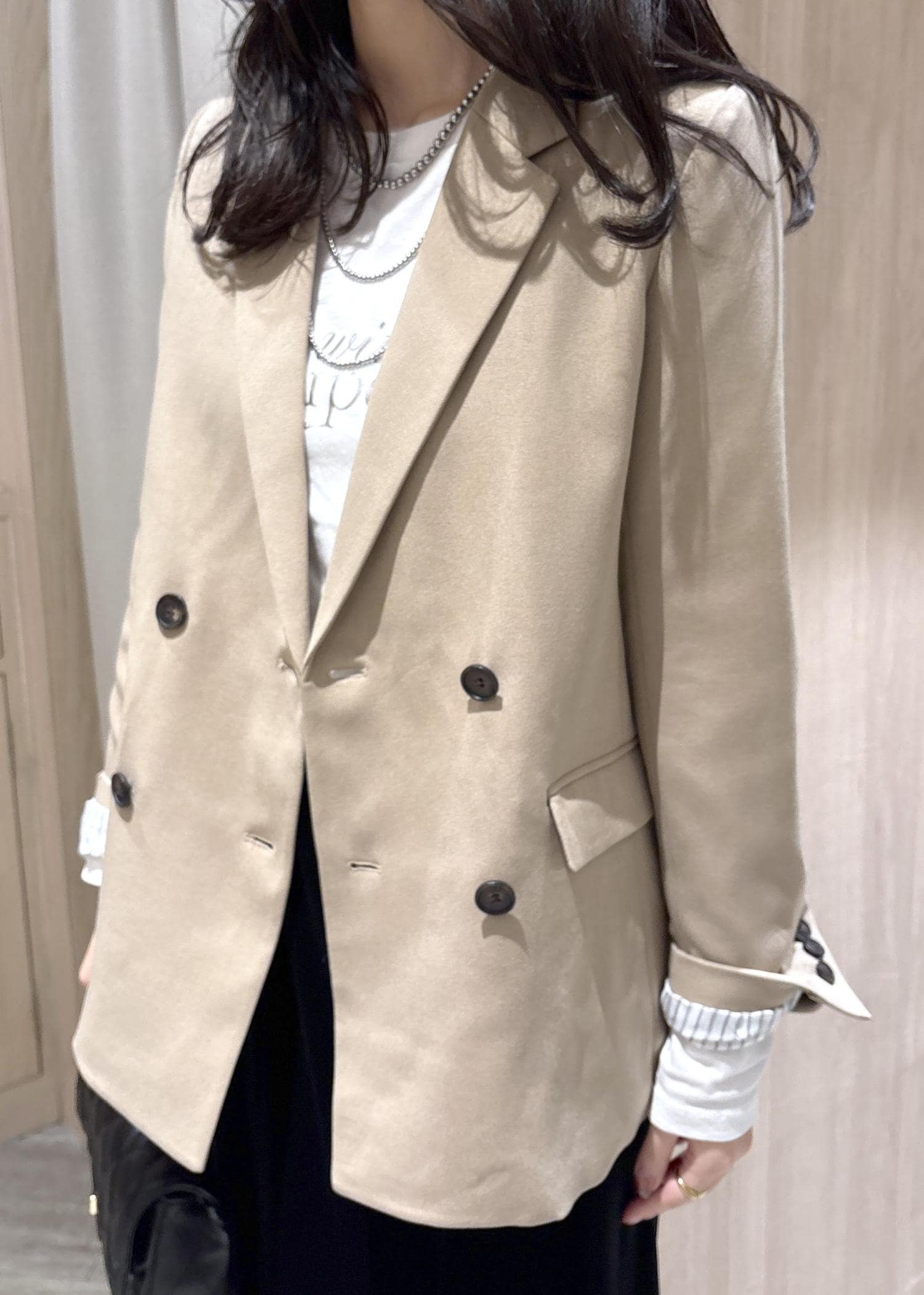 ベージュのジャケットはお仕事着にもオススメなベーシックアイテムです。