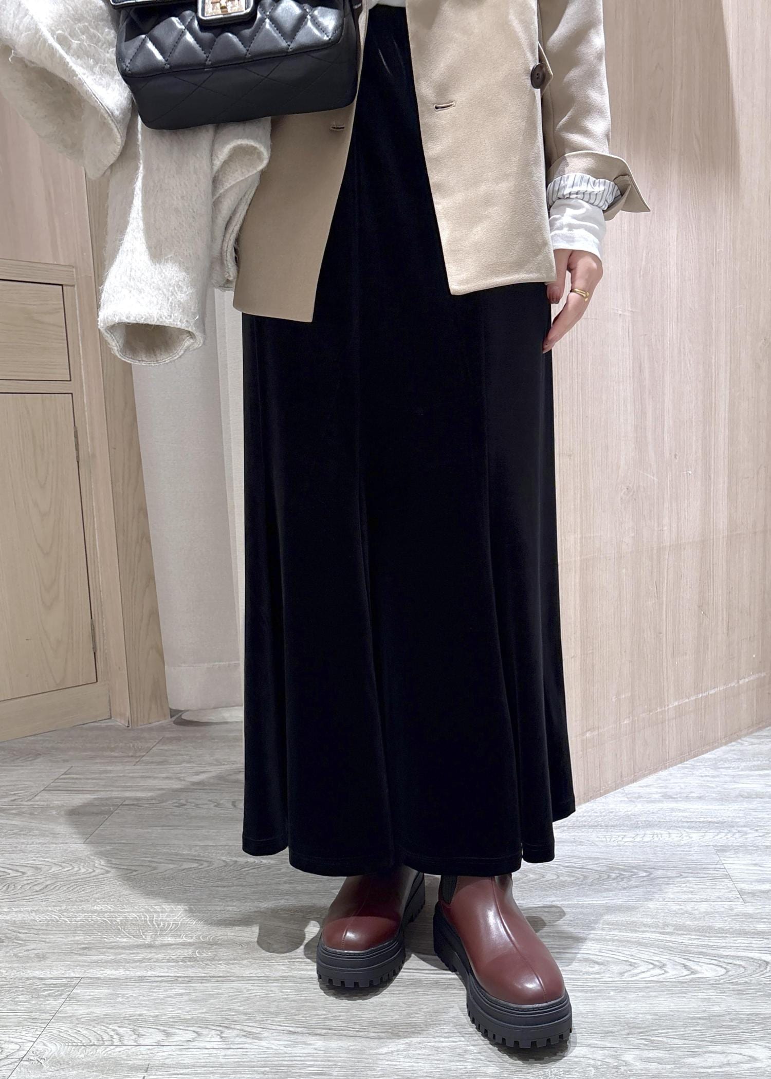 ベロアのスカートを合わせて女性らしさをプラス◎