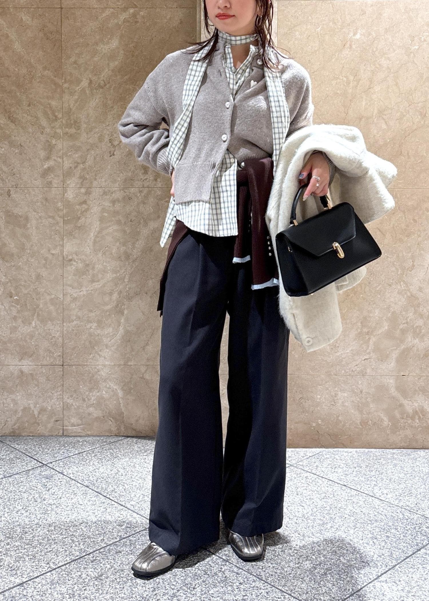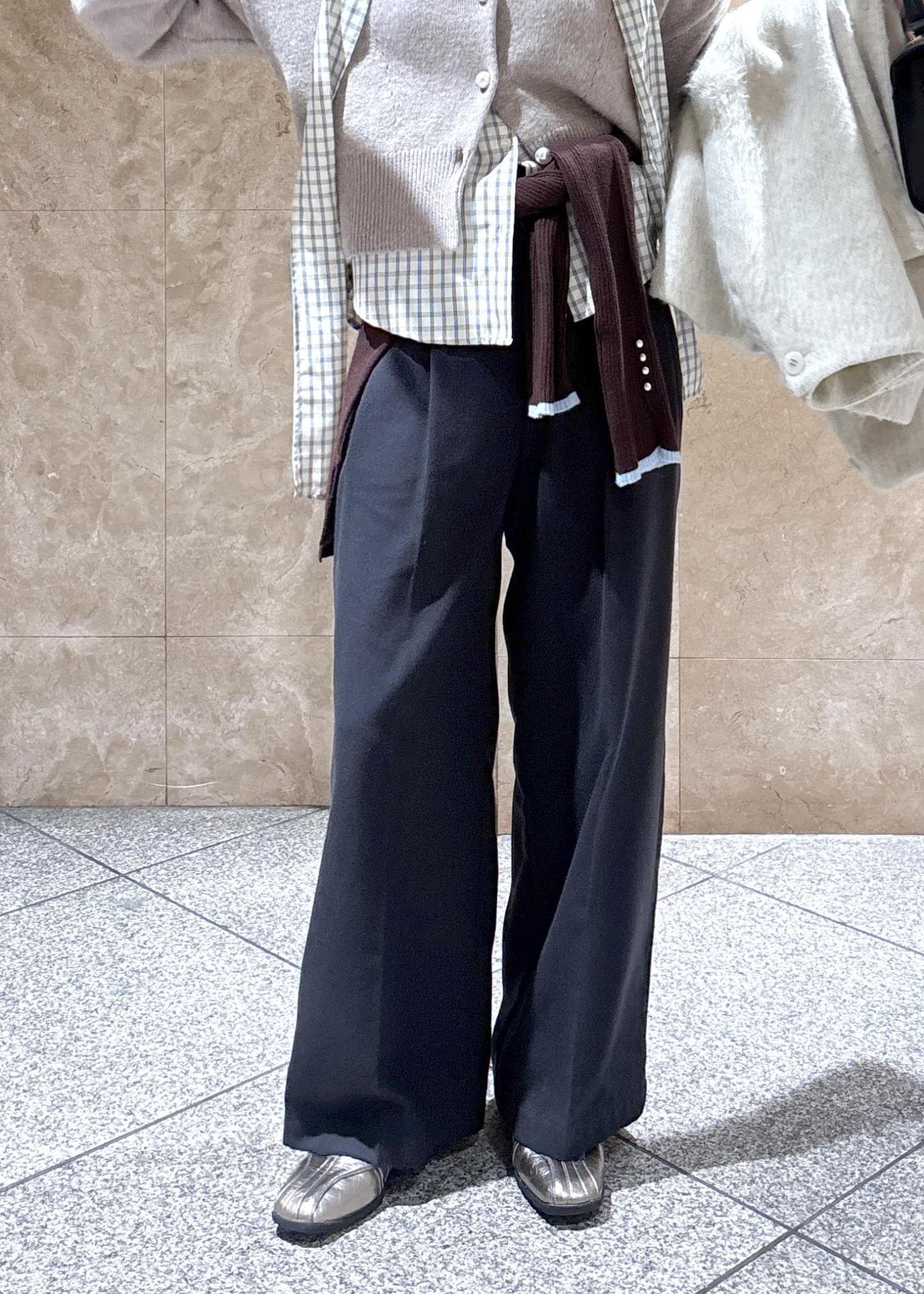 VIS起毛ウールライク版ベルトディテールタックワイドパンツスミクロ / M¥6,589レビューベルトをおへその位置でしっかりハイウエストで履くと足首が出る丈ですが、へそ下で履いてもシルエットが崩れなかったので、敢えて腰で落として着丈長めに着用しています。