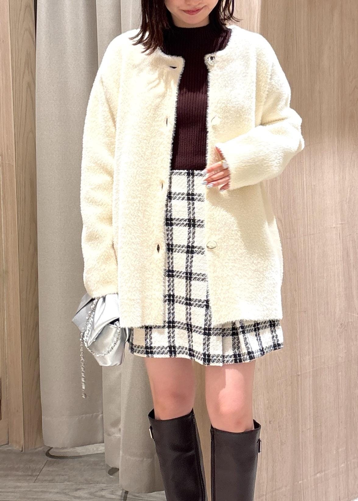 VIS接結メタルボタンミニフェザーニットコートオフホワイト / F¥9,999レビューお尻まですっぽり隠れる丈長のニットコート。