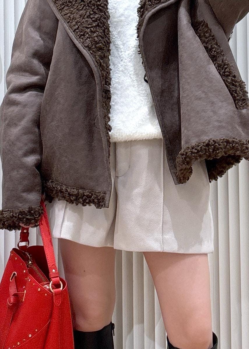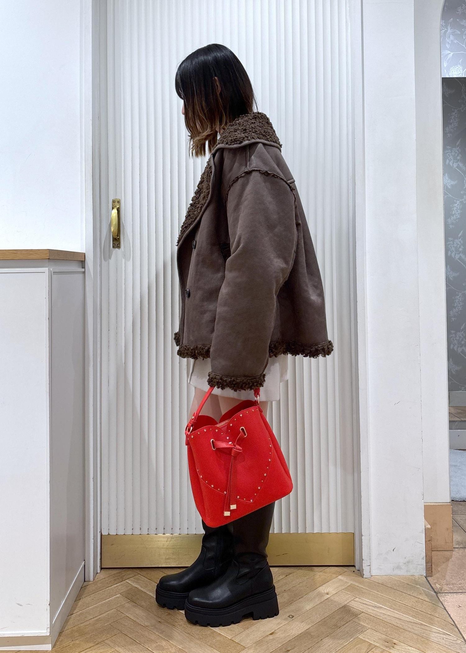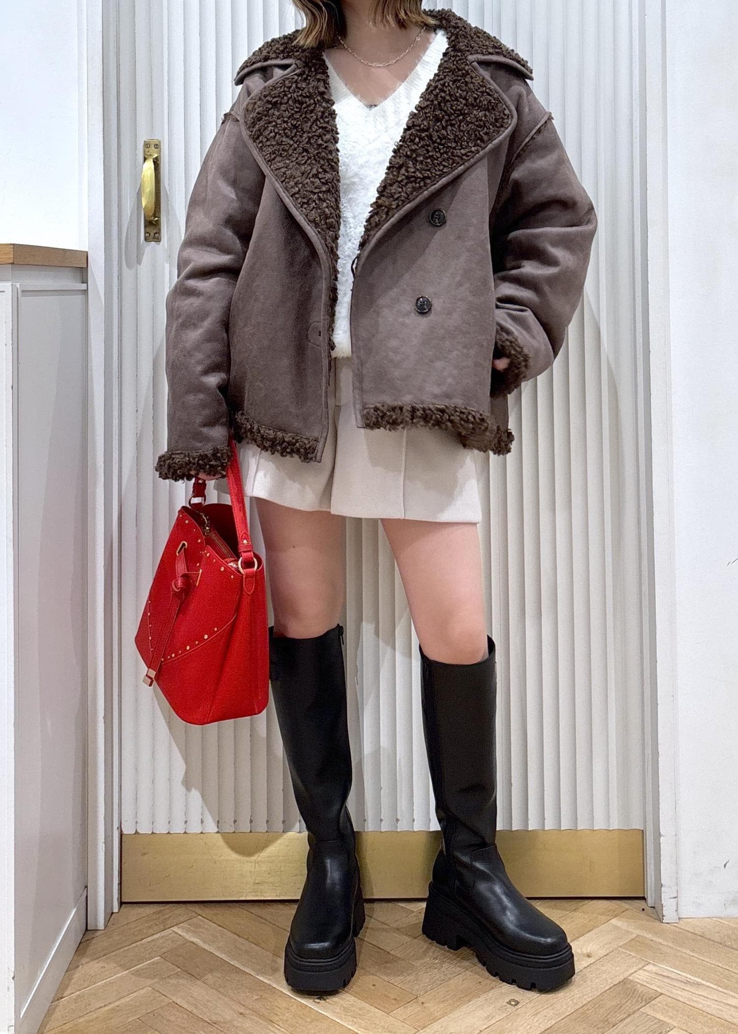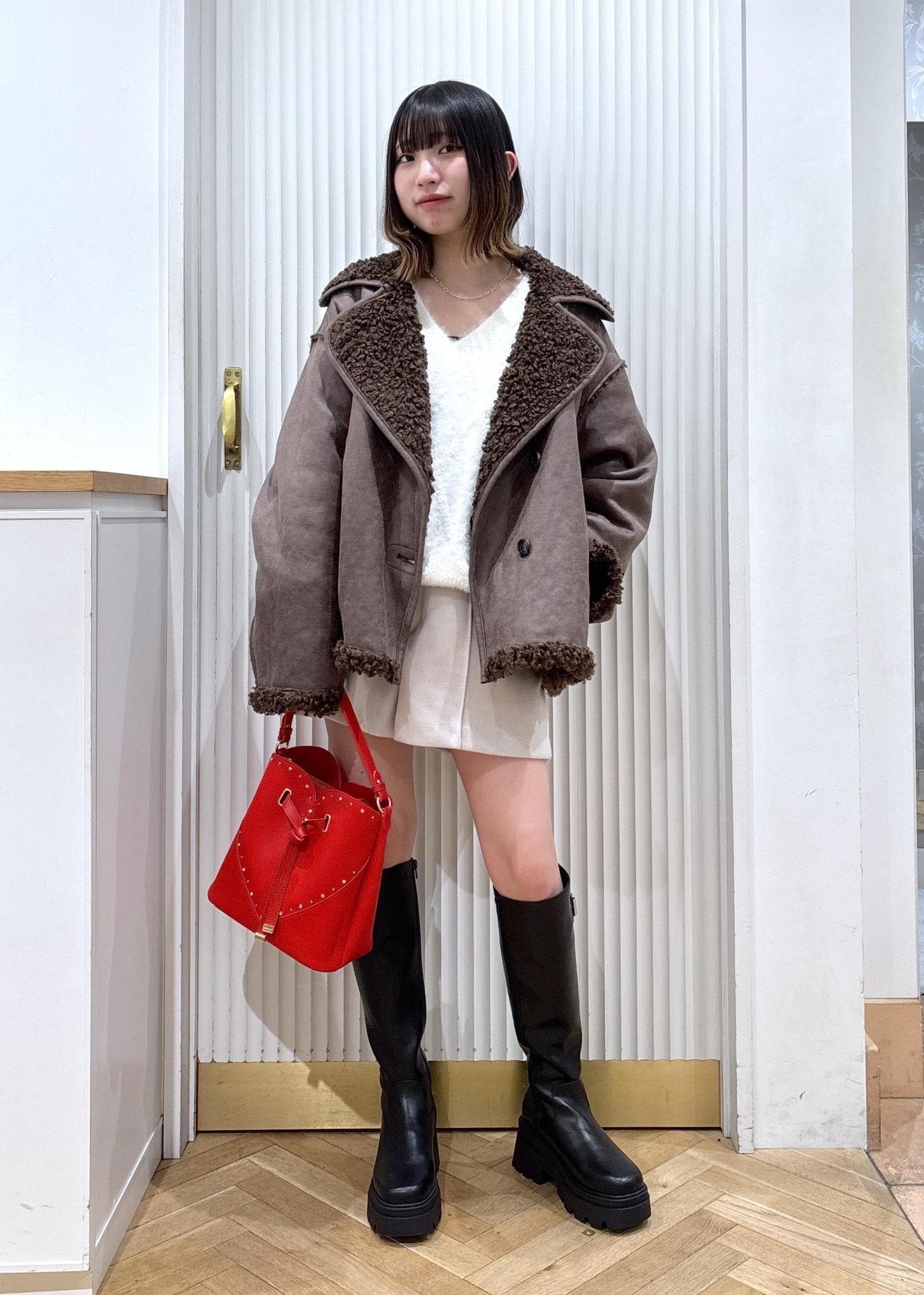 アウターを脱ぐと上下白なのでコーディネートの華やかさが上がります!バッグが赤で差し色になりクリスマスなどのイベントカラーなので際立たせるために他はベーシックな色味で統一しています!ミニ丈にロングブーツを合わせることで肌の露出は控えめながらにスタイルアップにもなるのが◎